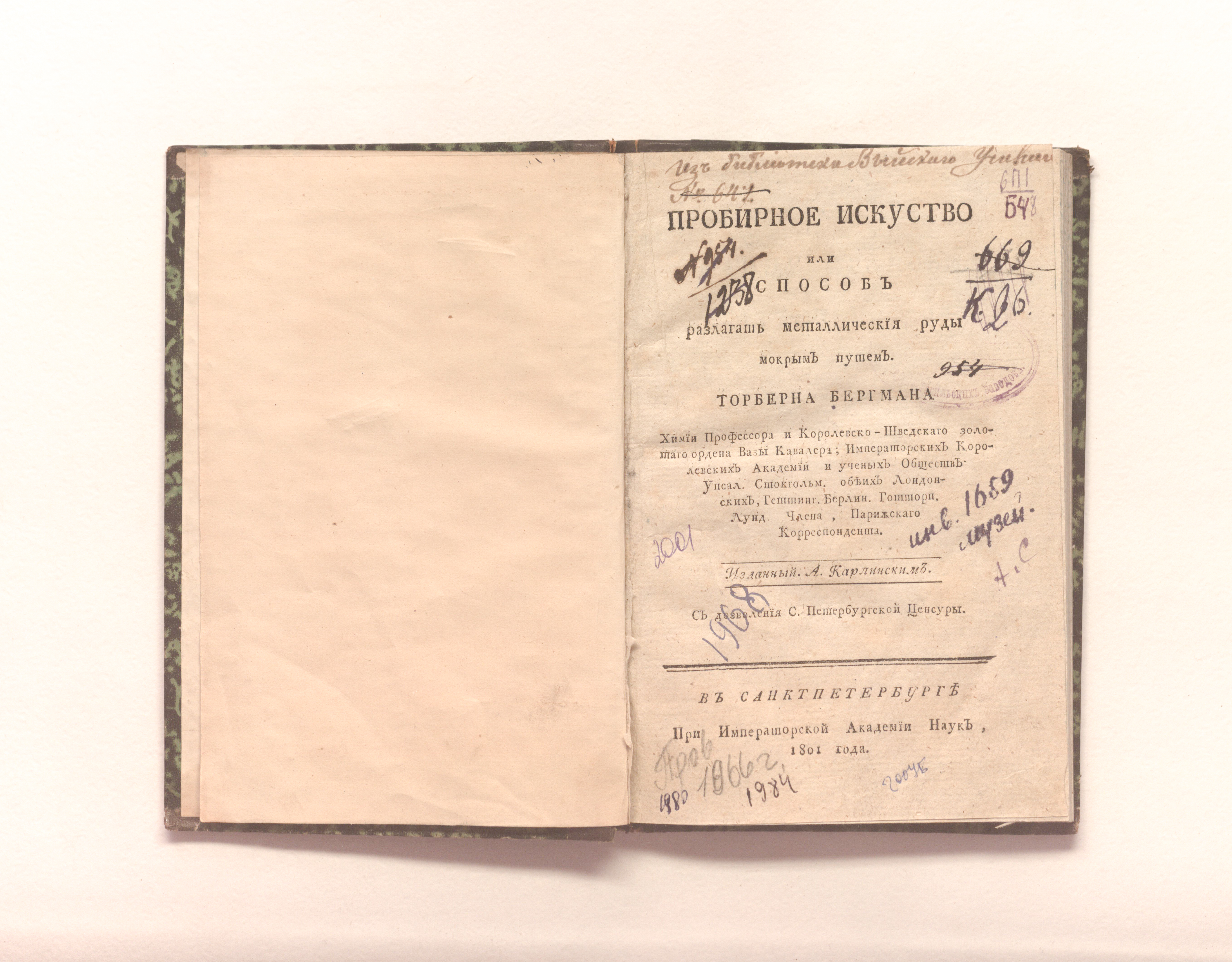 Бергман, Торберн Олоф (1735-1784). Пробирное искуство или способ разлагать металлическия руды мокрым путем / Торберна Бергмана химии профессора и королевско-шведскаго золотаго ордена Вазы кавалера; императорских и королевских академий и ученых обществ: Упсал. Стокгольм. обеих Лондонских, Геттинг. Берлин. Готторп. Лунд члена, парижскаго корреспондента ; Изданный А. Карпинским. – Санкт-Петербург : При Императорской Академии наук, 1801. – [7], 100 с. ; 19х12,5 см.