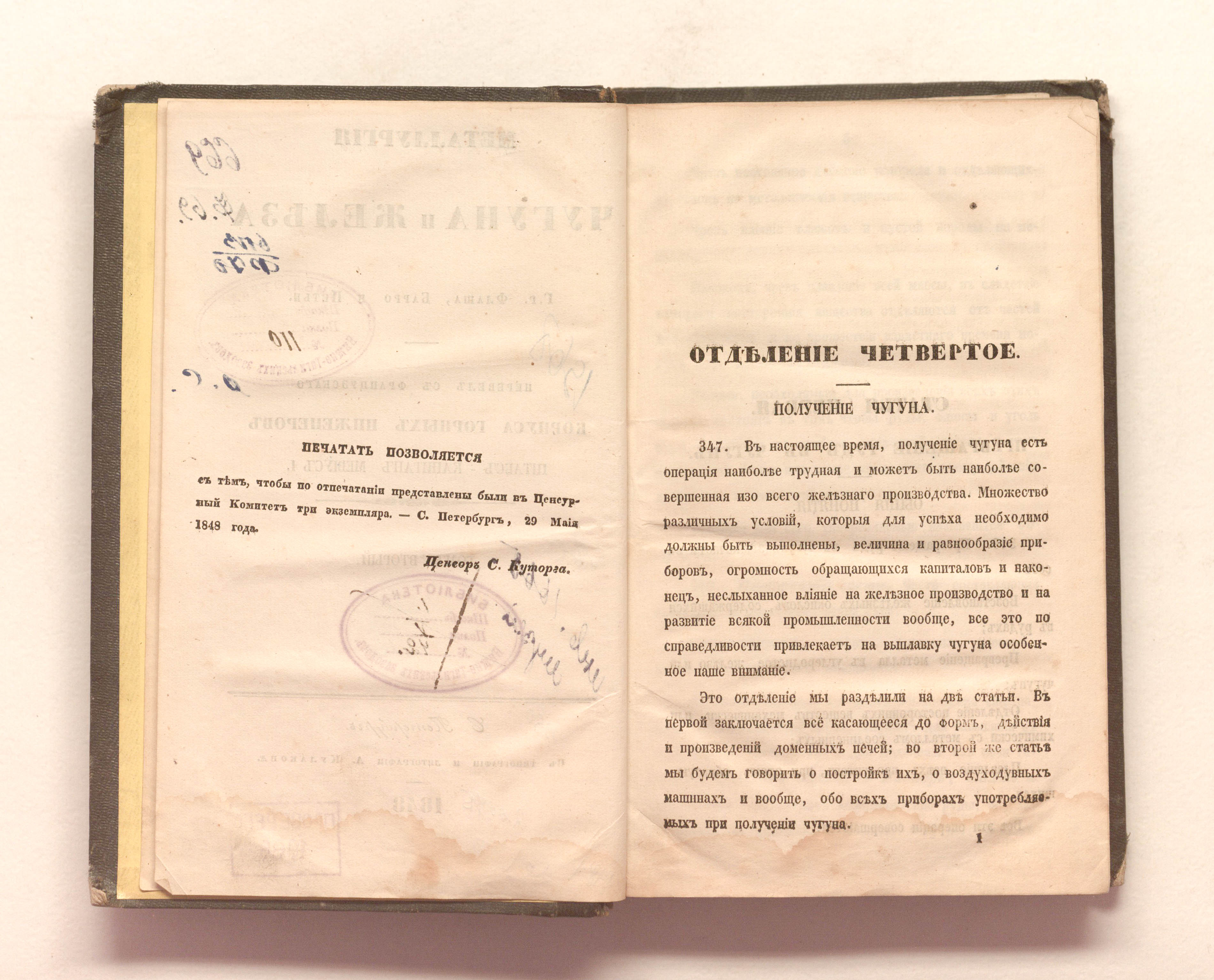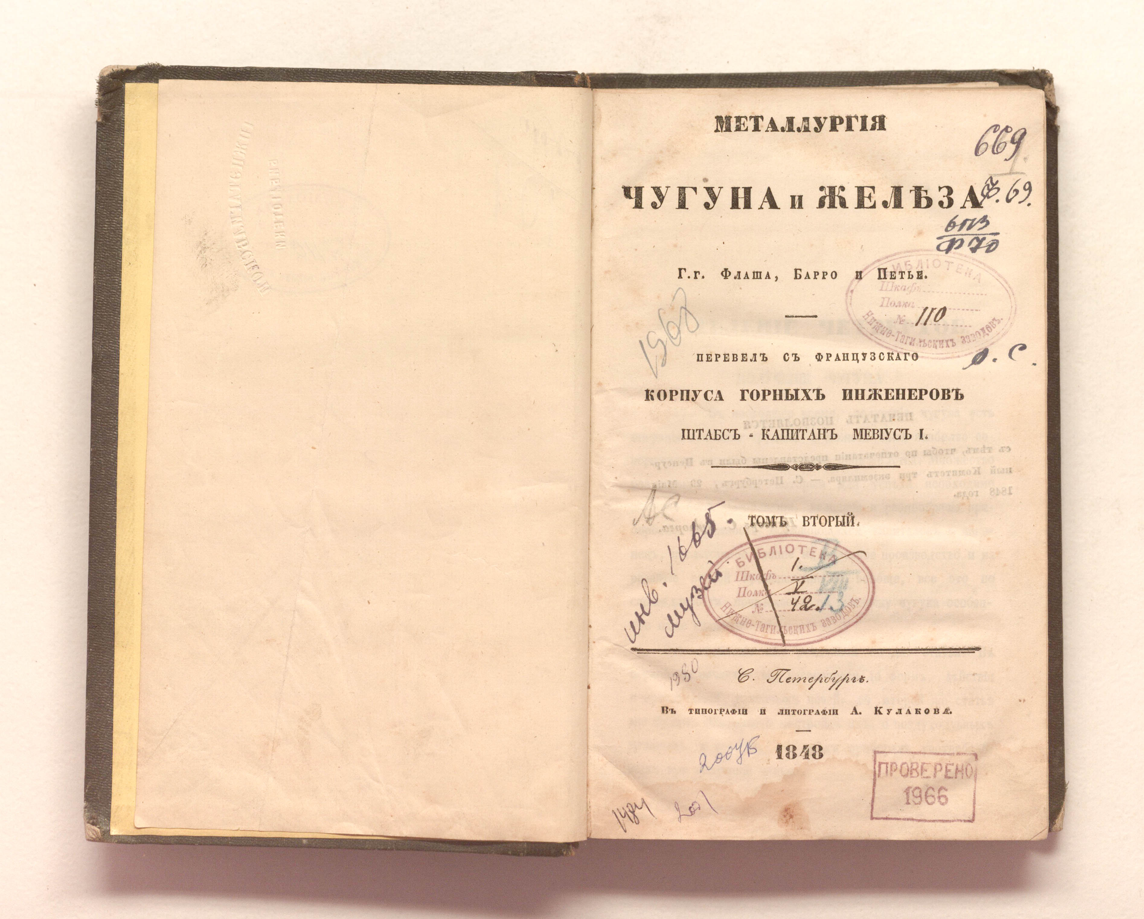 Металлургия чугуна и железа. Т. 2 / [Соч.] г. г. Флаша, Барро и Петье; Пер. с фр. [и предисл.] Корпуса горн. инж. штабс-кап. Мевиус, И. — Санкт-Петербург : тип. и лит. А. Кулакова, 1848. — 428 с. : 7 л. табл. ; 21х13,5 см.