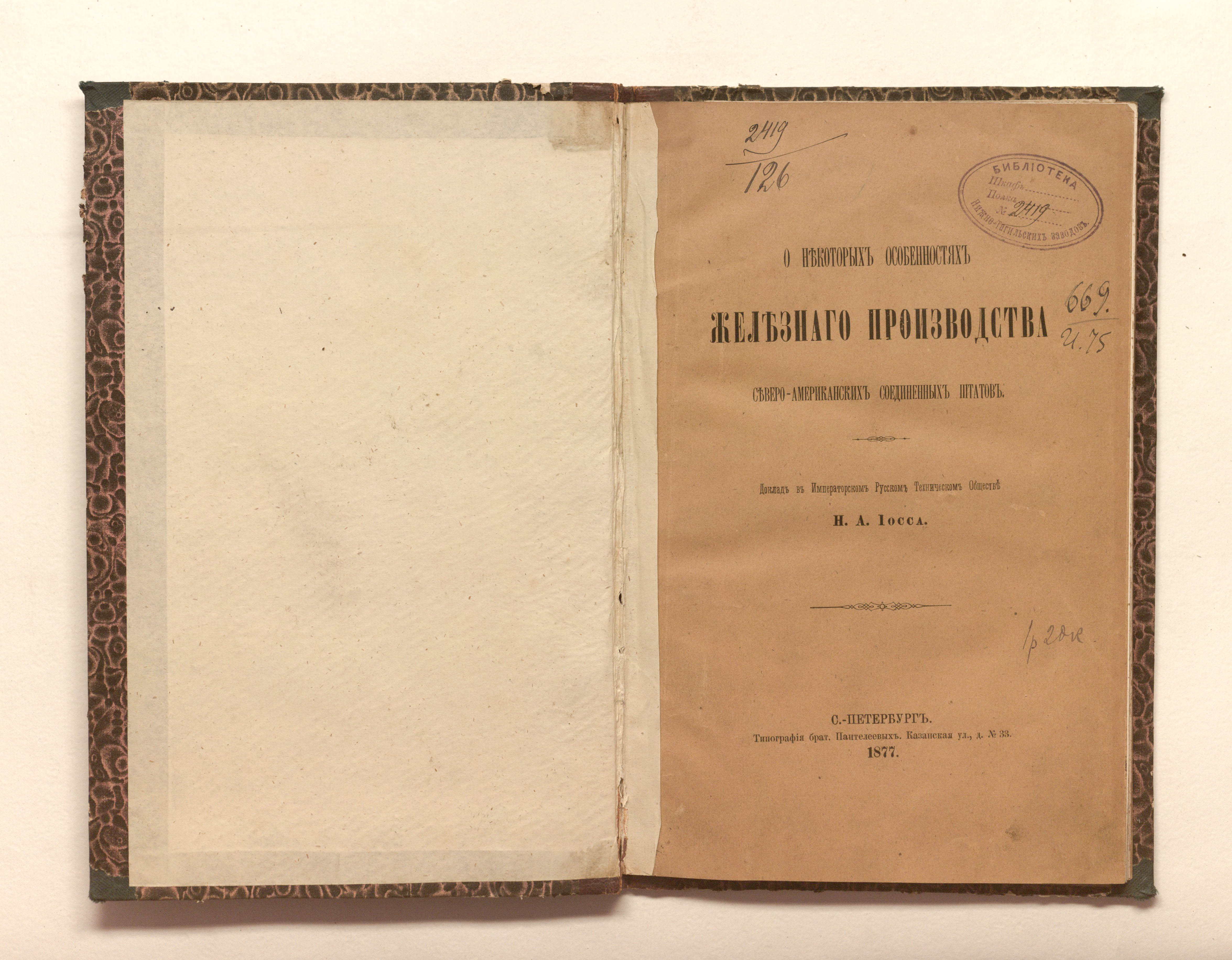 Иосса, Николай Александрович. О некоторых особенностях железного производства Северо-Американских Соединенных Штатов / Н. А. Иосса. — Санкт-Петербург : типография брат. Пантелеевых, 1877. — 58 с. : табл. ; 25,5х17 см.