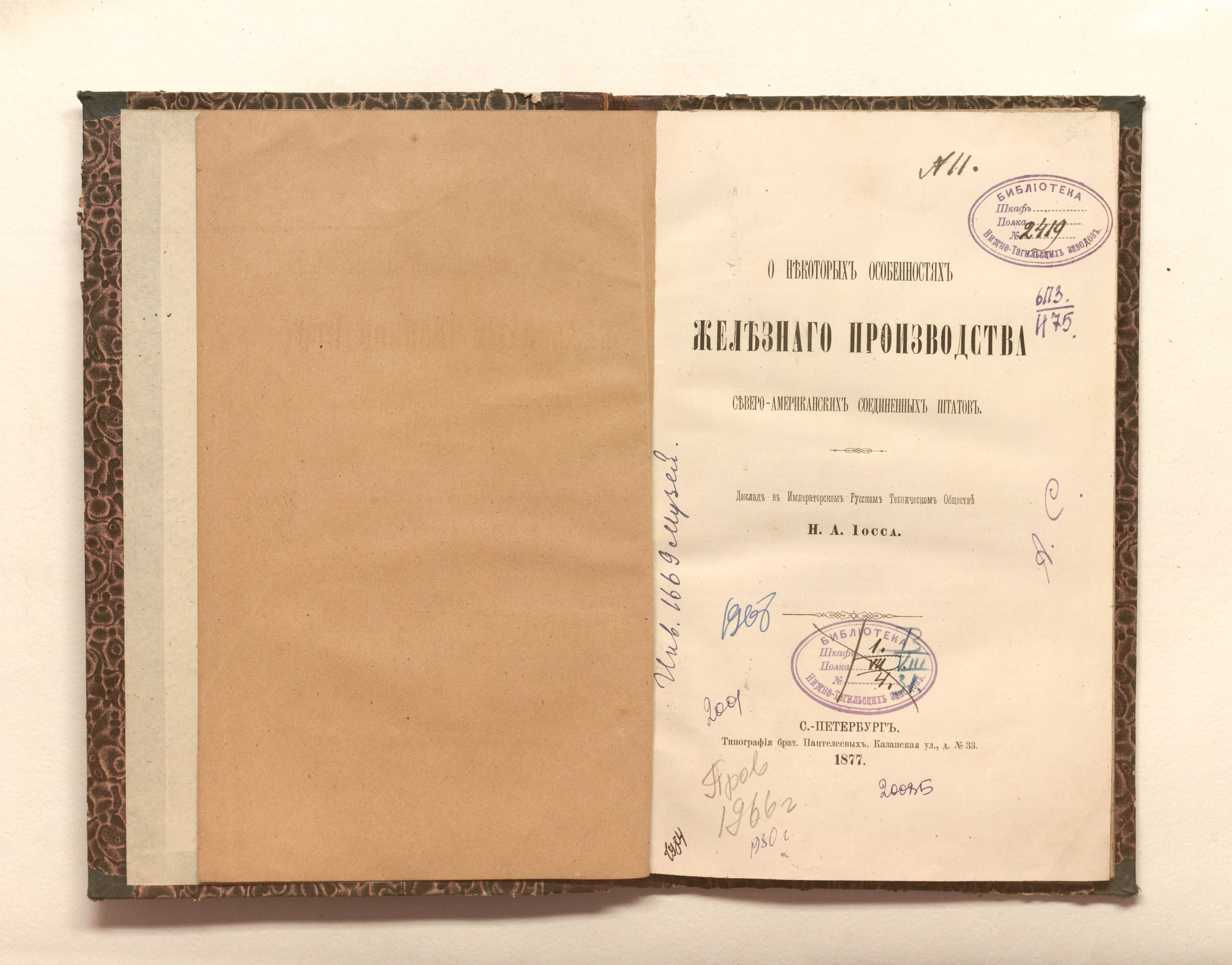 «Библиотека Нижне-Тагильских заводов. № 2419» (изд. обл., тит. л.);