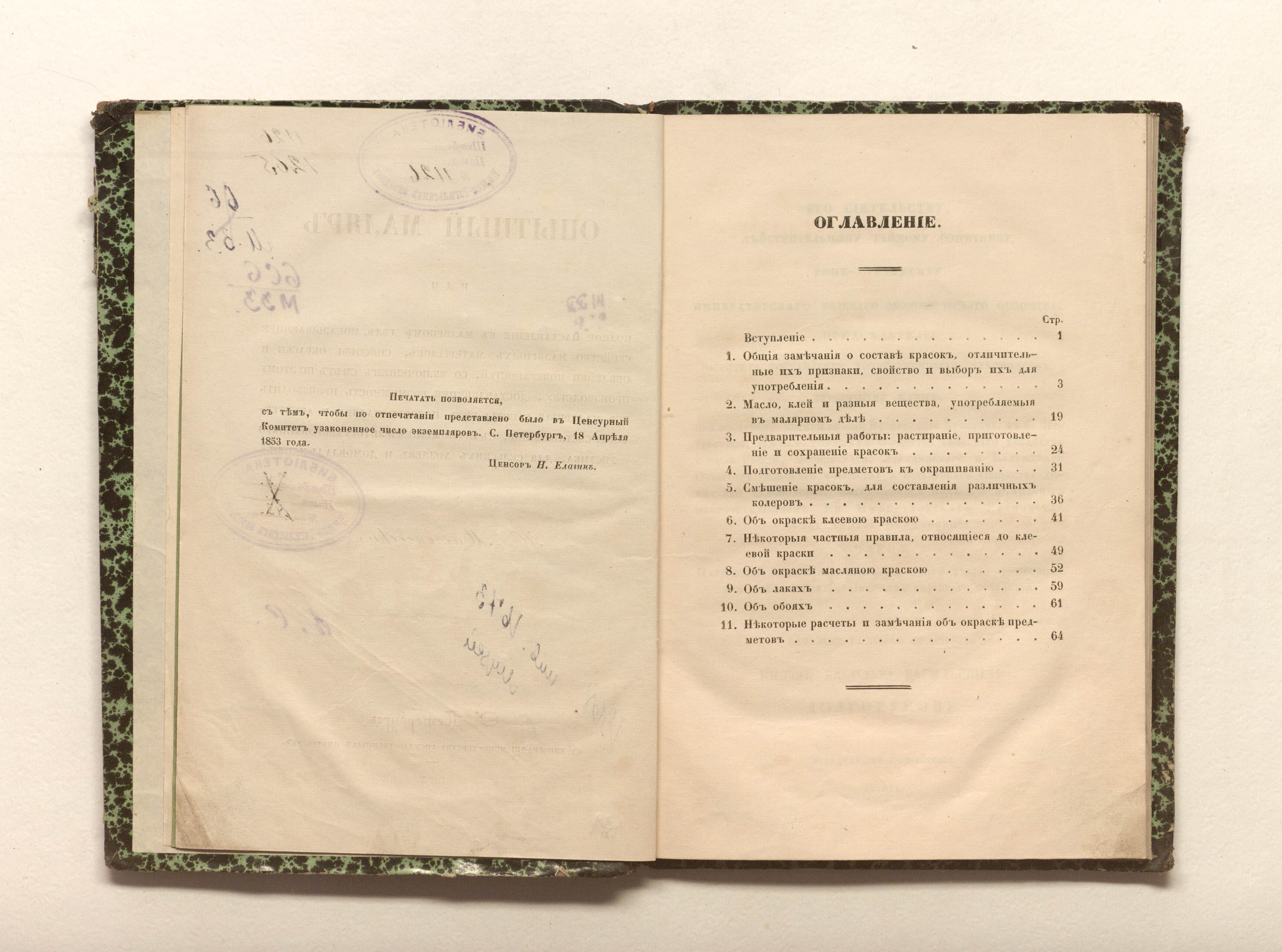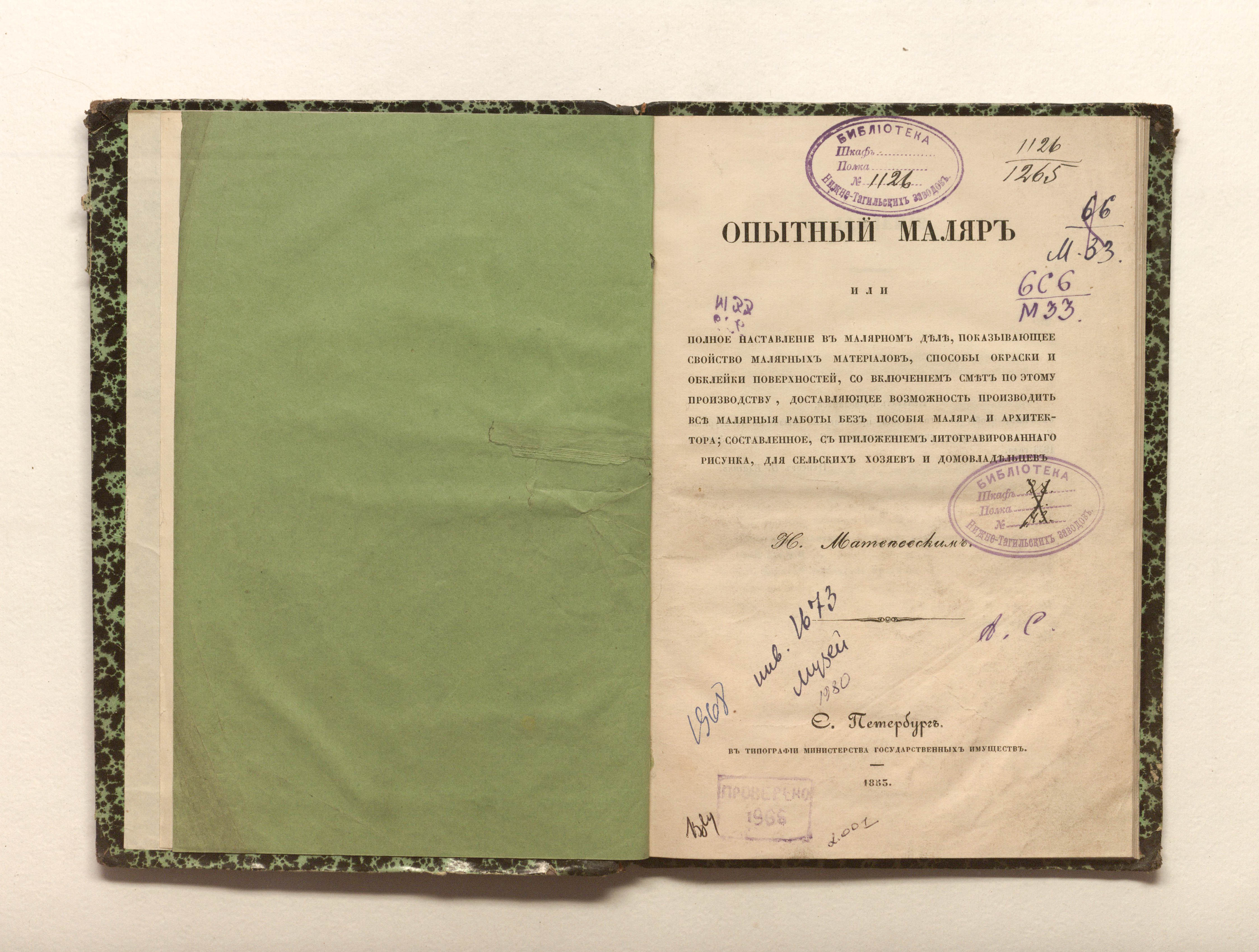 Опытный маляр, или Полное наставление в малярном деле, показывающее свойство малярных материалов, способы окраски и обклейки поверхностей, со включением смет по этому производству, доставляющее возможность производить все малярные работы без пособия маляра и архитектора; составленное, с приложением литографированного рисунка, для сельских хозяев и домовладельцев Н. Матвеевским / Соч. Н. Матвеевского. — Санкт-Петербург : тип. М-ва гос. имуществ, 1853. — [8], 76 1 л. черт. ; 22,5х16 см.