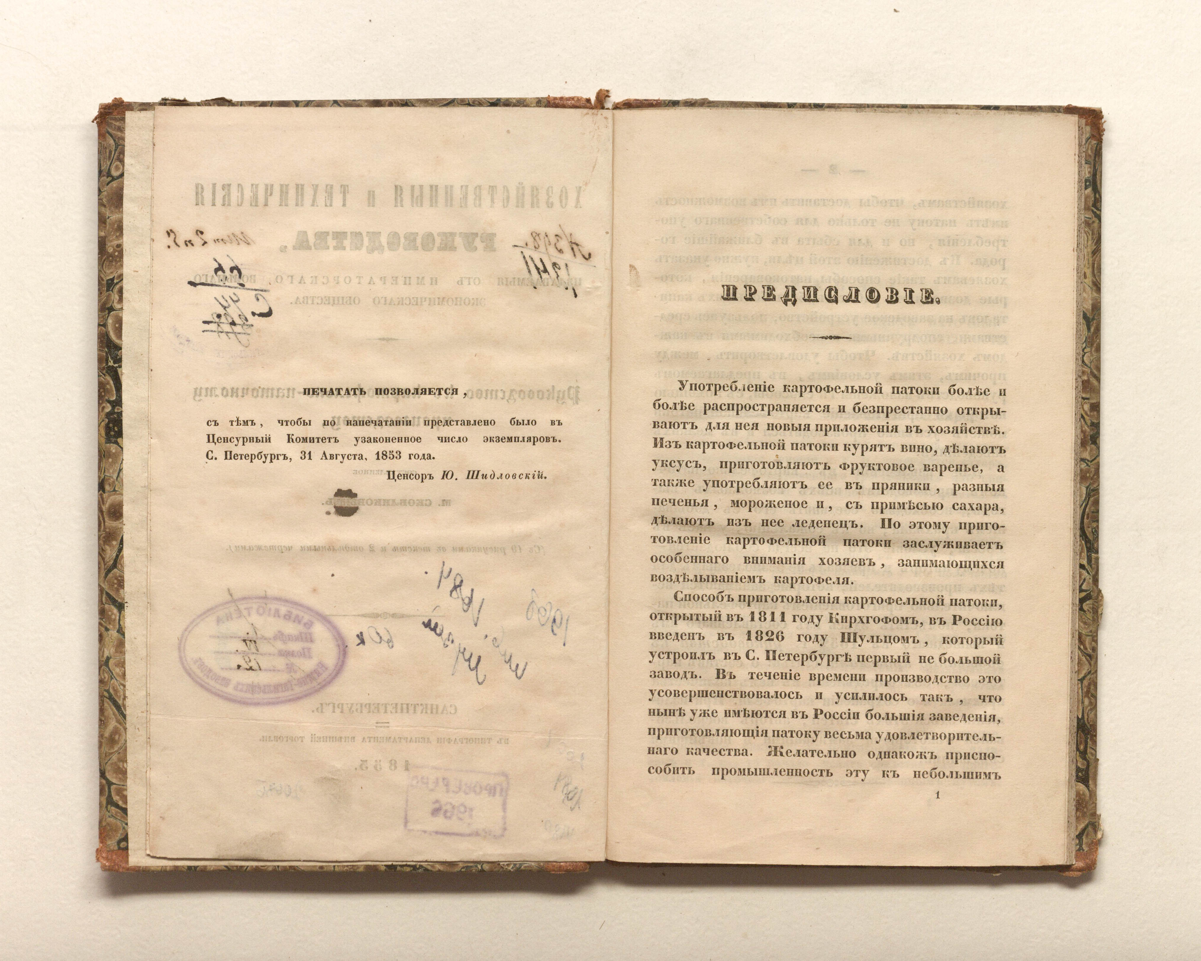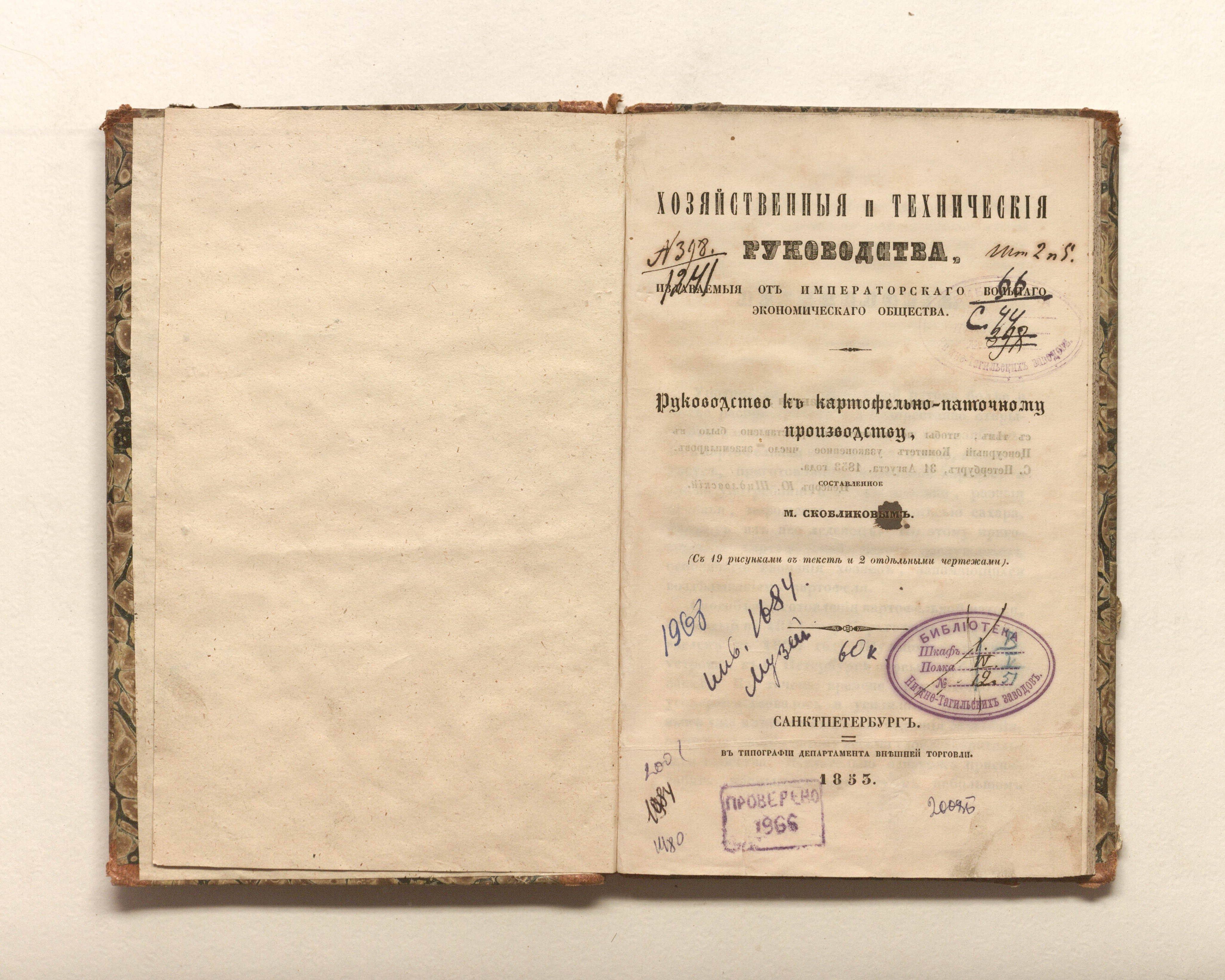Руководство к картофельно-паточному производству / составленное М. Скобликовым. — Санкт-Петербург : тип. Департамента внешней торговли, 1853. — [2], 80, II : 2 л. черт., ил. — (Хозяйственные и технические руководства, издаваемые от Вольного экономического общества). ; 21,5х14 см.