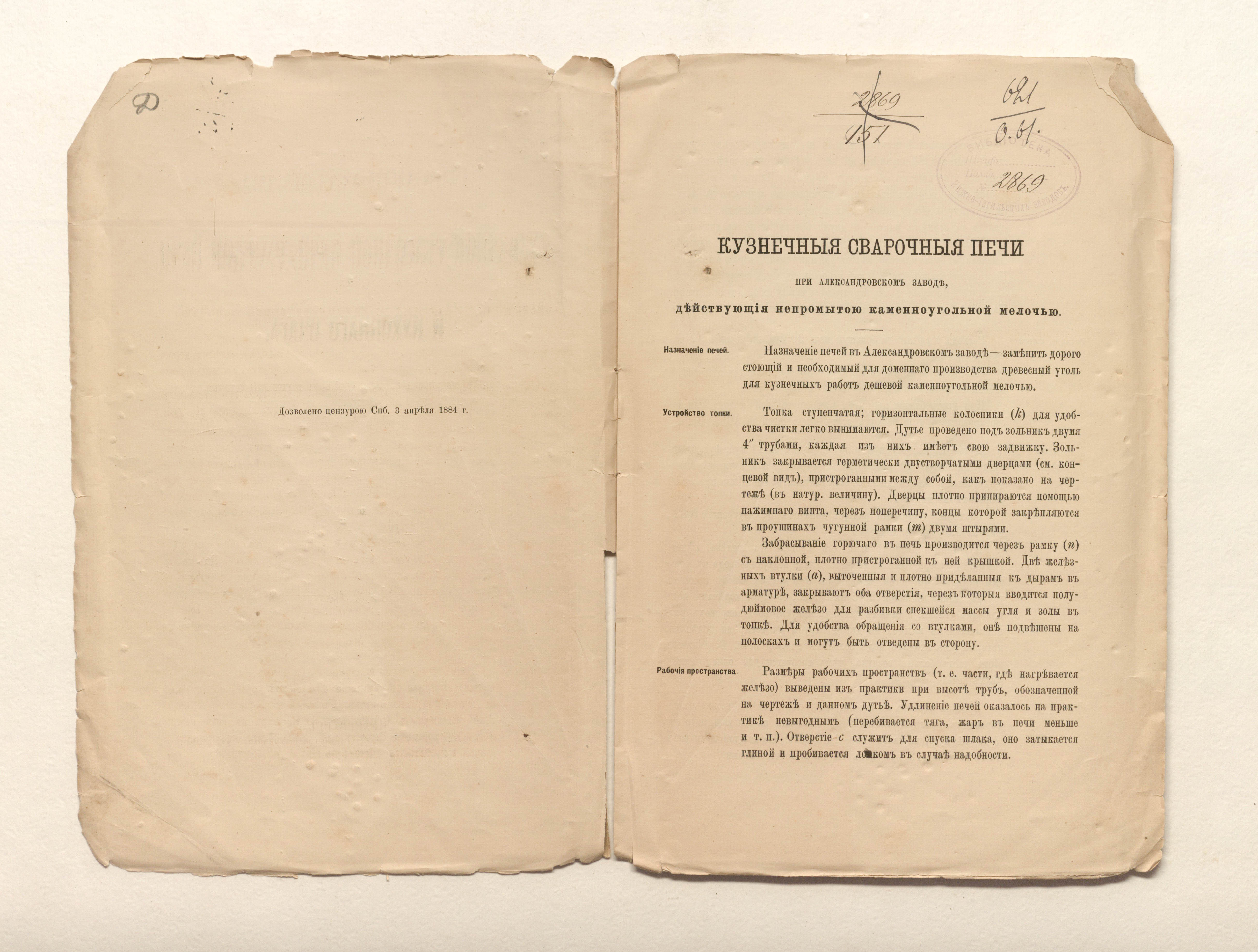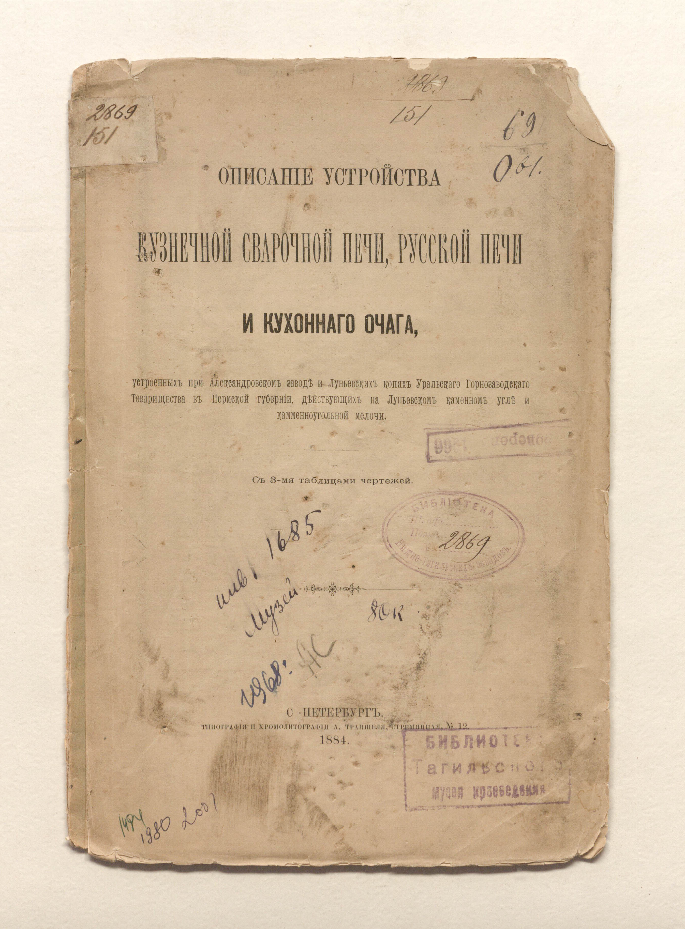 Описание устройства кузнечной сварочной печи, русской печи и кухоннаго очага, устроенных при Александровском заводе и Луньевских копях Уральскаго Горнозаводскаго Товарищества в Пермской губернии, действующих на Луньевском каменном угле и каменноугольной мелочи. — Санкт-Петербург : Типо-хромо-литография товарищества А. Траншель, 1884. — 8 с. : табл. ; 26,5х18 см.