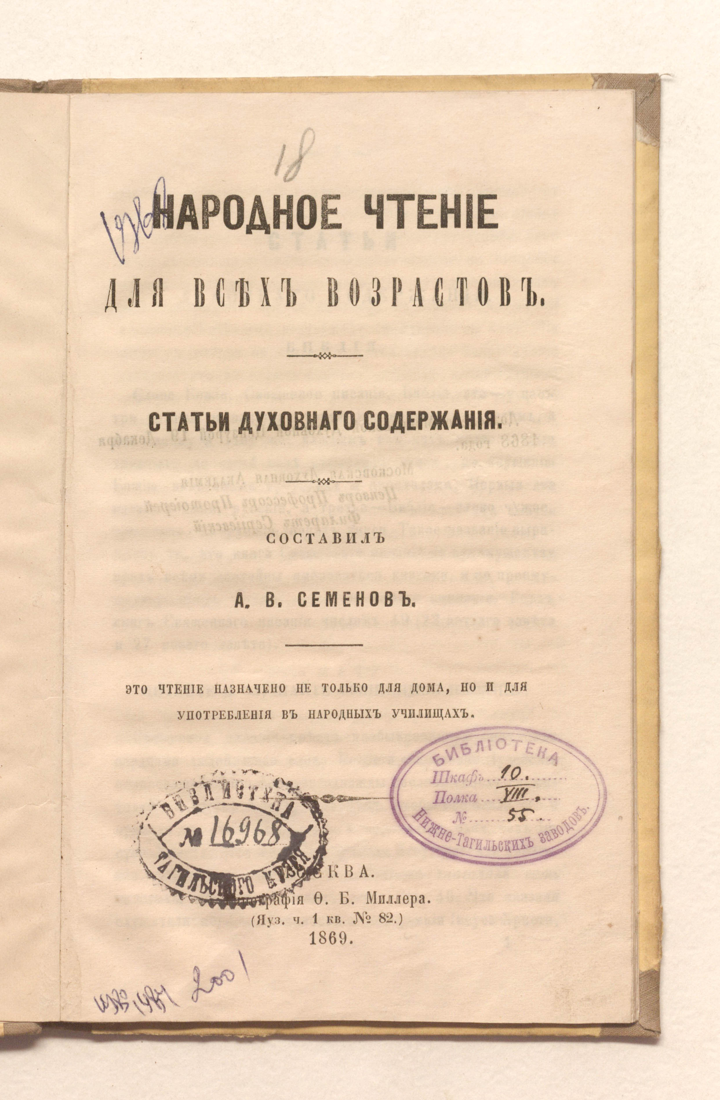 Народное чтение для всех возрастов : статьи духовного содержания / составил А. В. Семенов. – 16-е изд. – Москва : тип. Ф. Б. Миллера, 1869. – 34 с. ; 20,5х13,5 см.