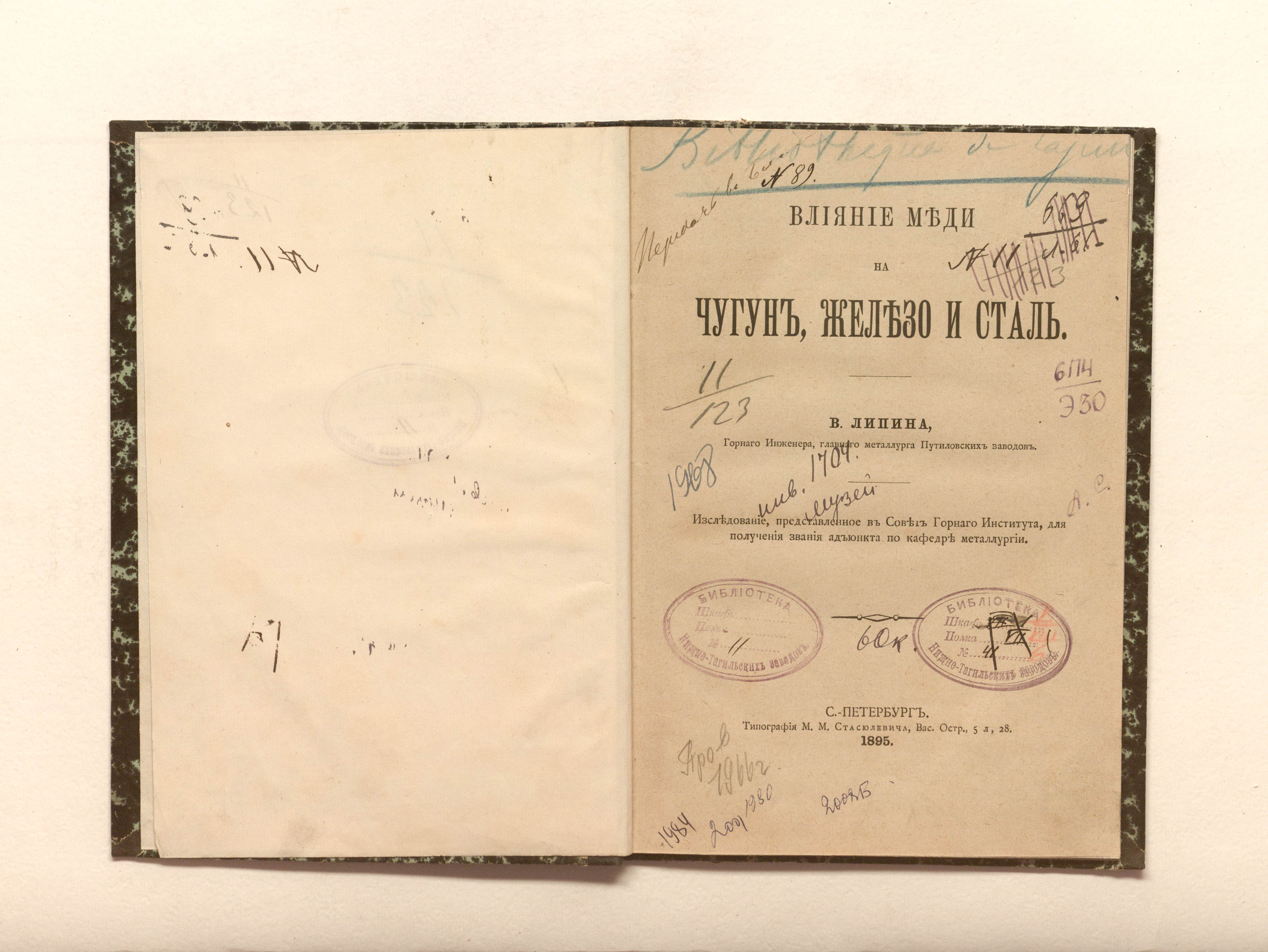 Липин, Вячеслав Николаевич. Влияние меди на чугун, железо и сталь : Исслед., представл. в Сов. Горн. ин-та, для получения звания адьюнкта по каф. металлургии / В. Н. Липин. — Санкт-Петербург : тип. М.М. Стасюлевича, 1895. — 69 с. : табл. ; 21,5х15 см.