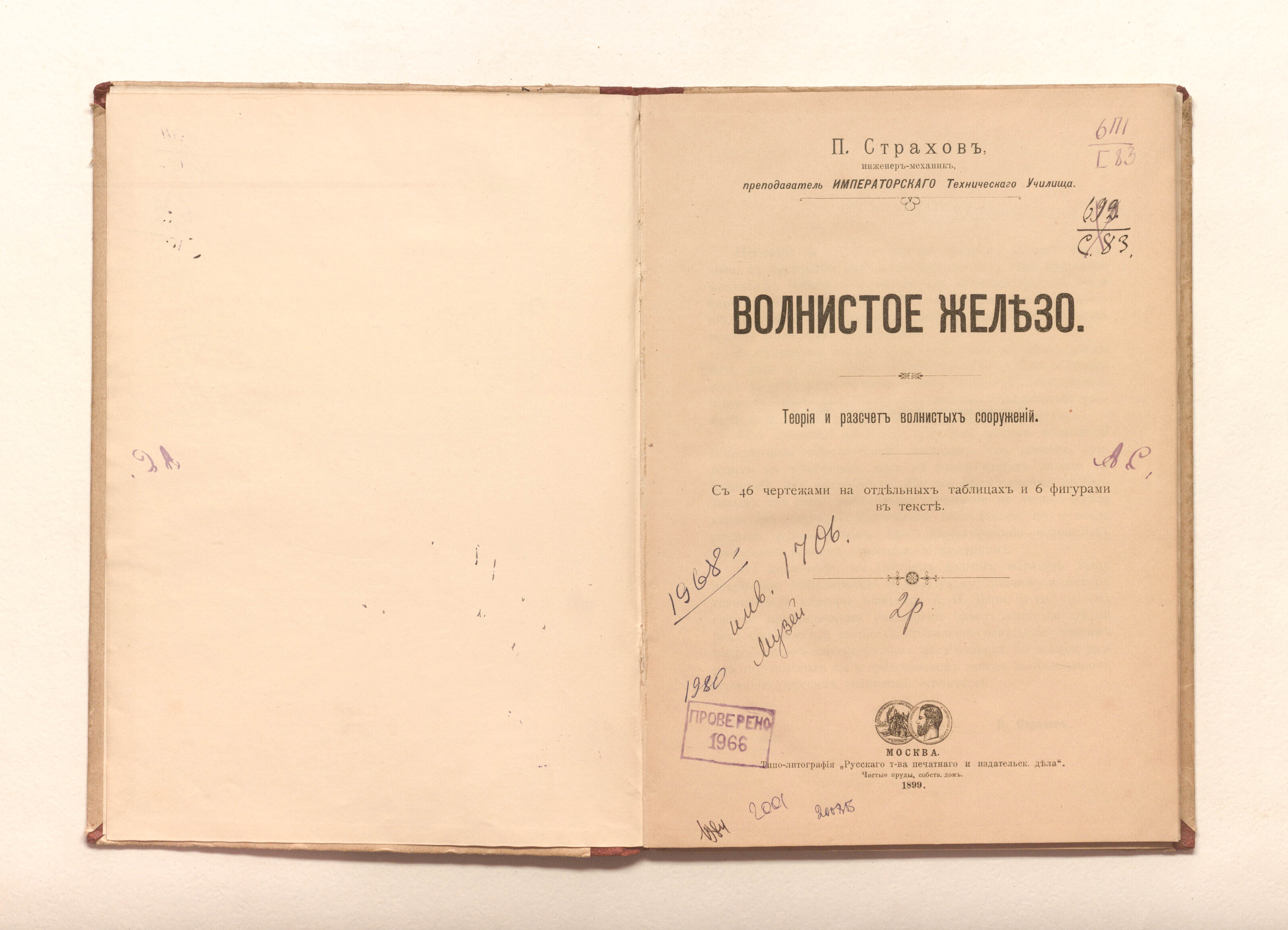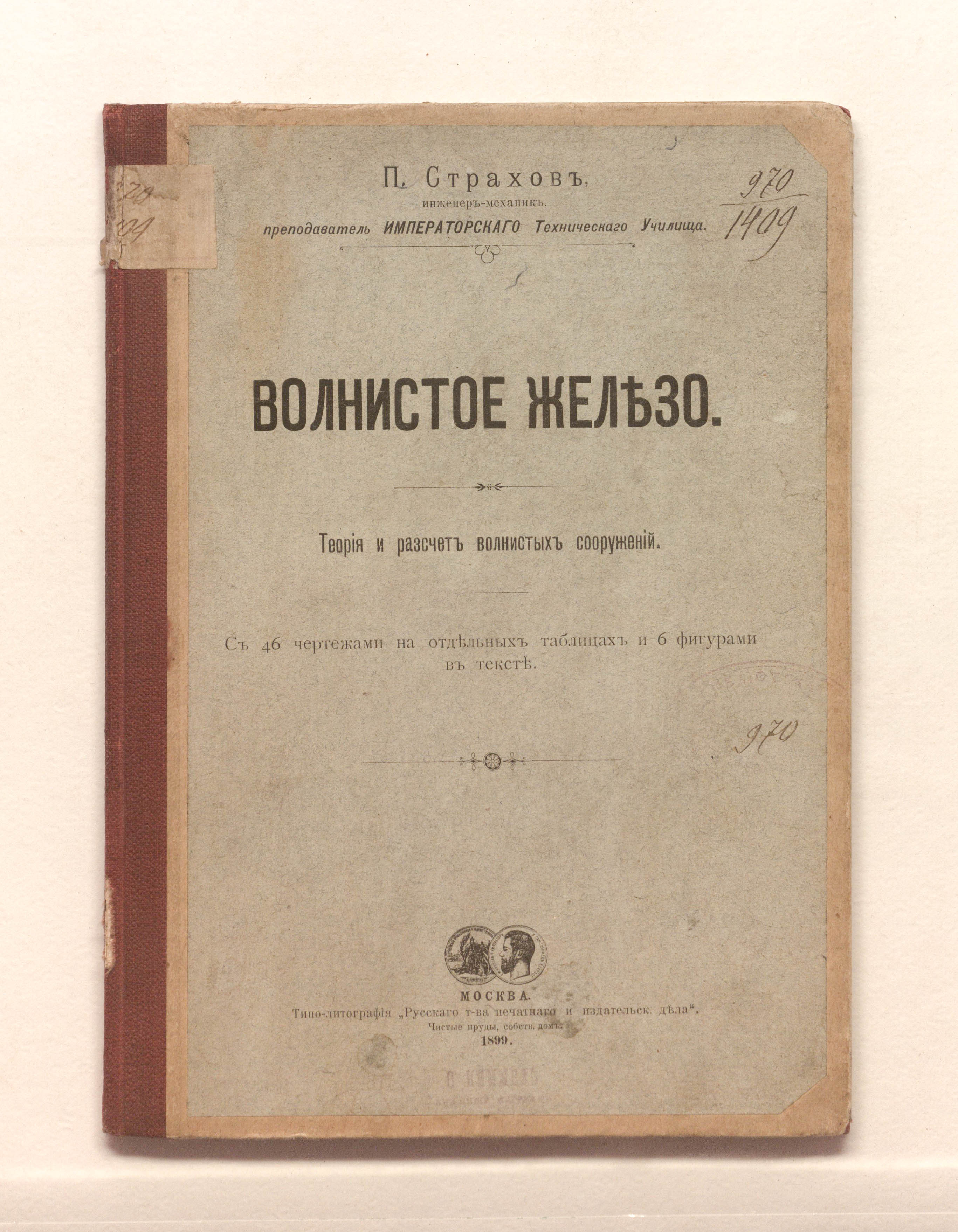 Страхов, Петр Сергеевич (1869- ). Волнистое железо: теория и расчет волнистых сооружений / П. Страхов. — Москва : типо-лит. "Рус. т-ва печ. и изд. дела", 1899. — [2], 68 с. : табл., черт. ; 24,5х17,5 см.
