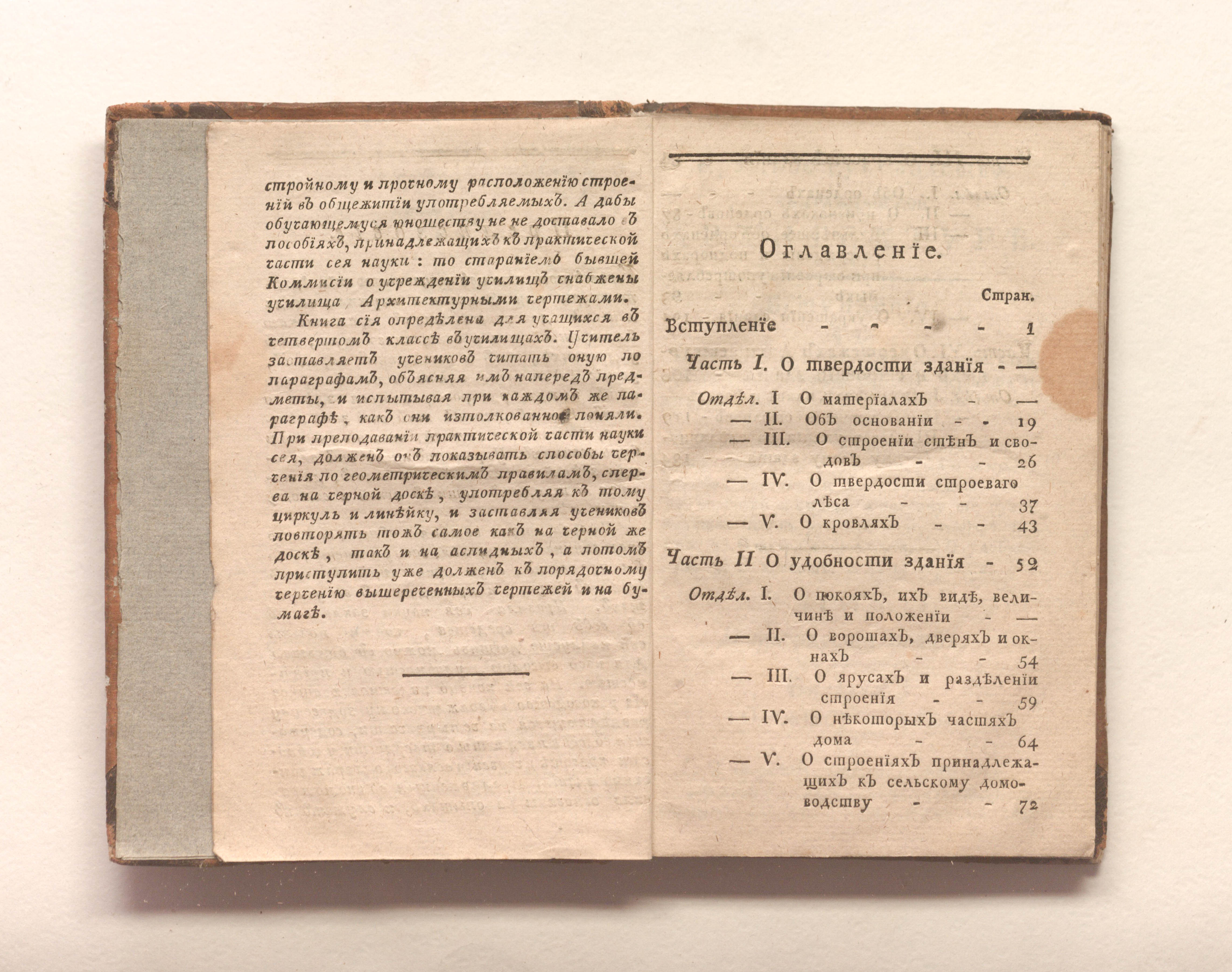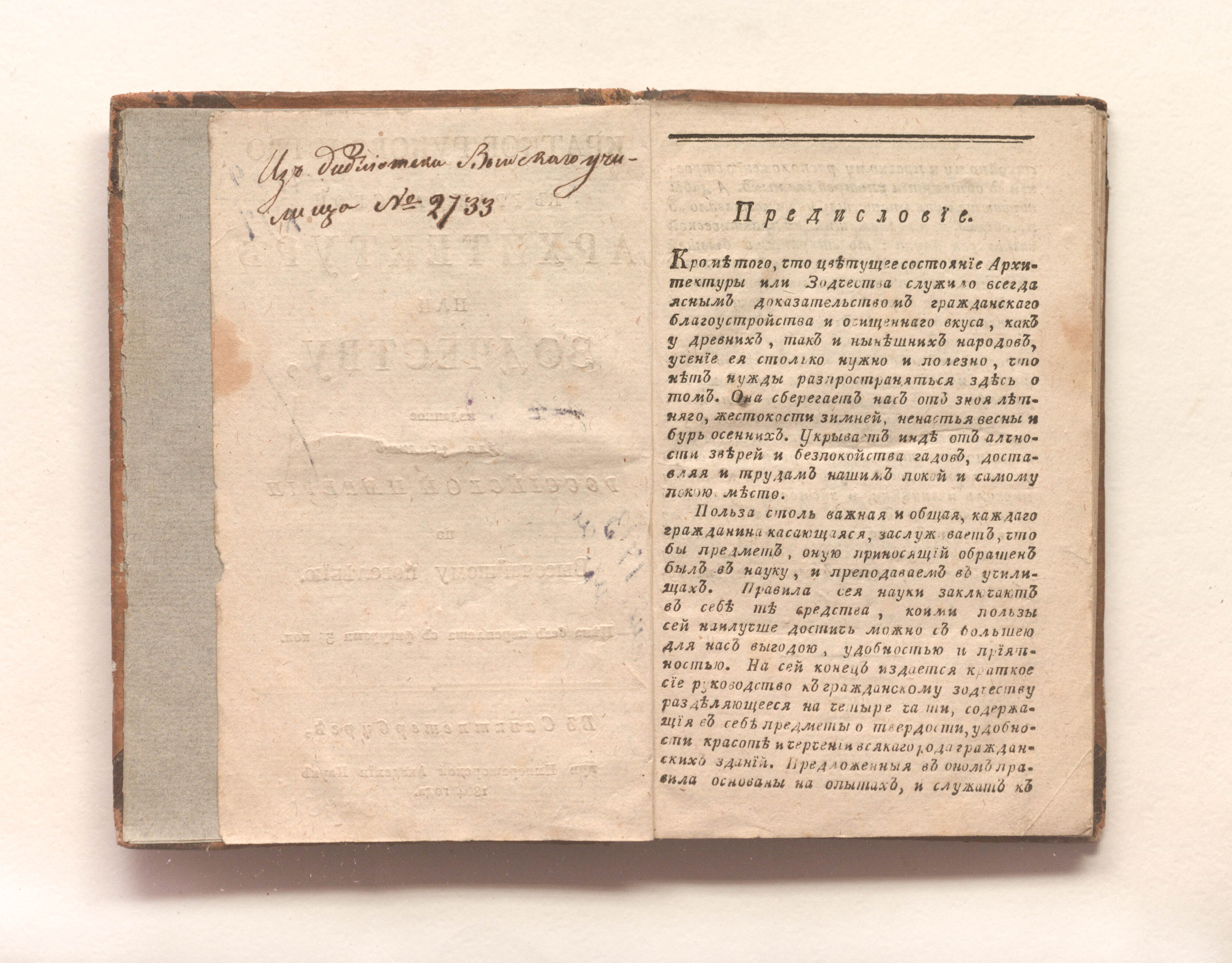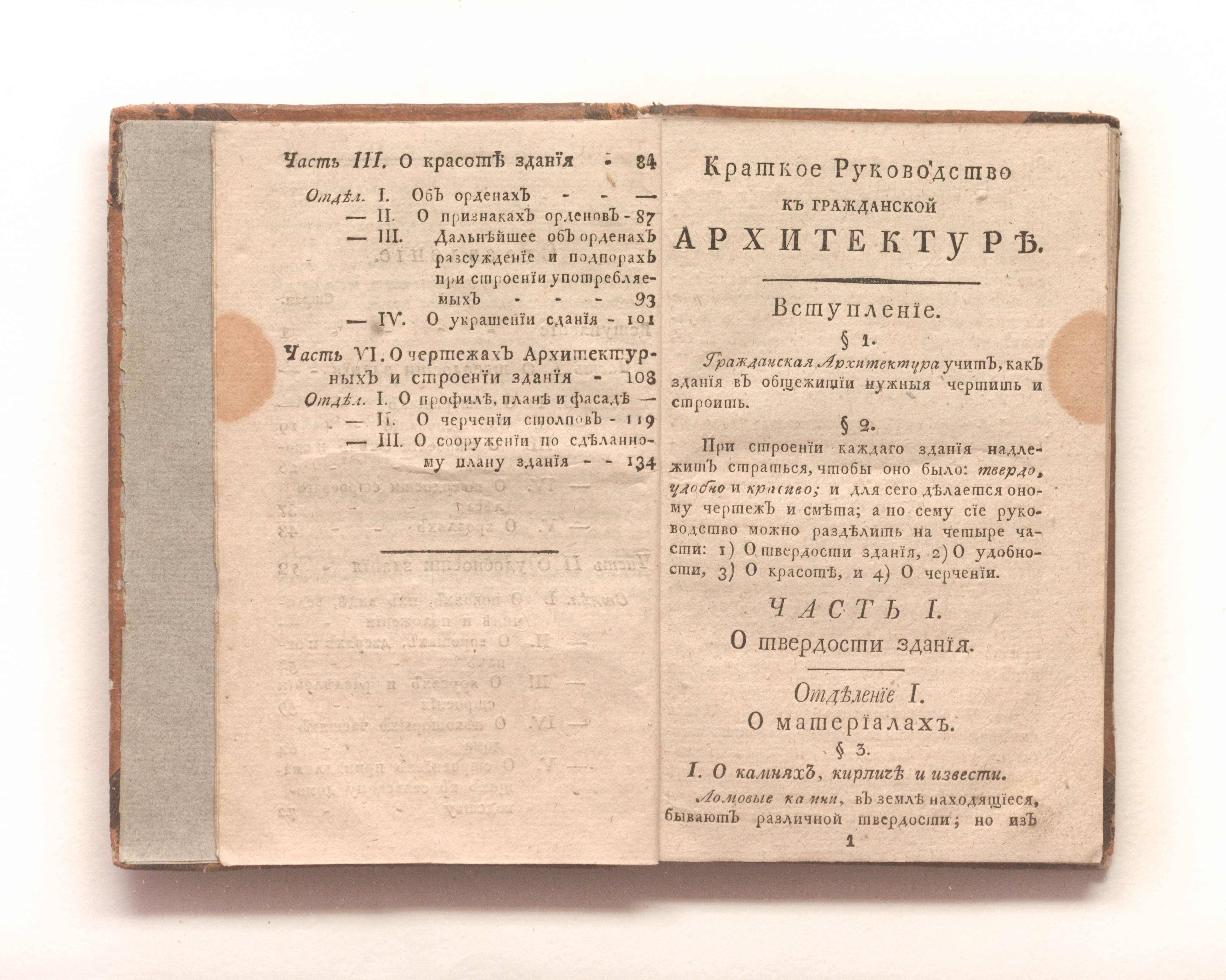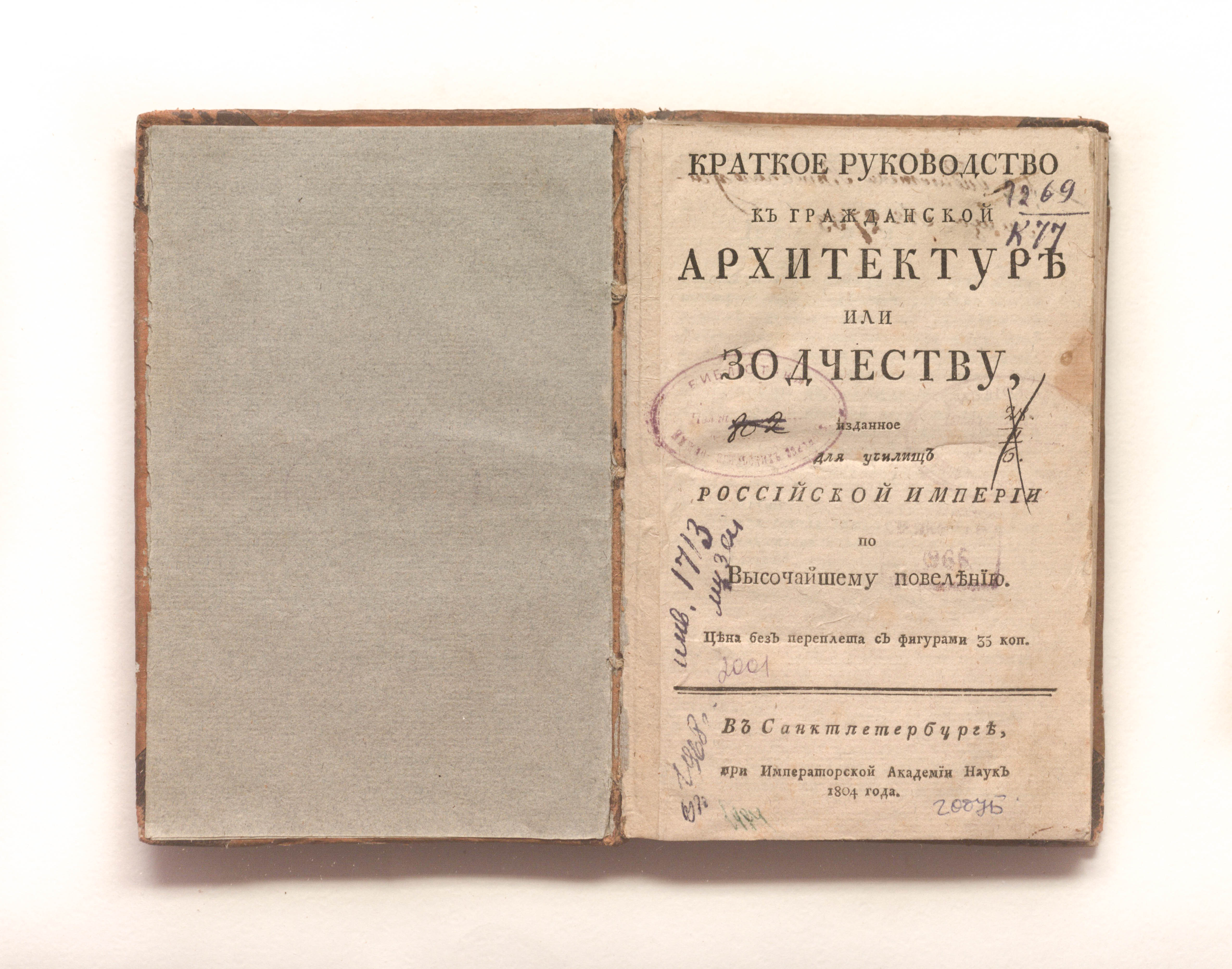Головин, Михаил Евсеевич (1756-1790). Краткое руководство к гражданской архитектуре или зодчеству : изданное для училищ Российской империи по высочайшему повелению / М. Е. Головин. — Санкт -Петербург : При Императорской Академии наук, 1804. — [6], 137 с. ; 17,5х11 см.