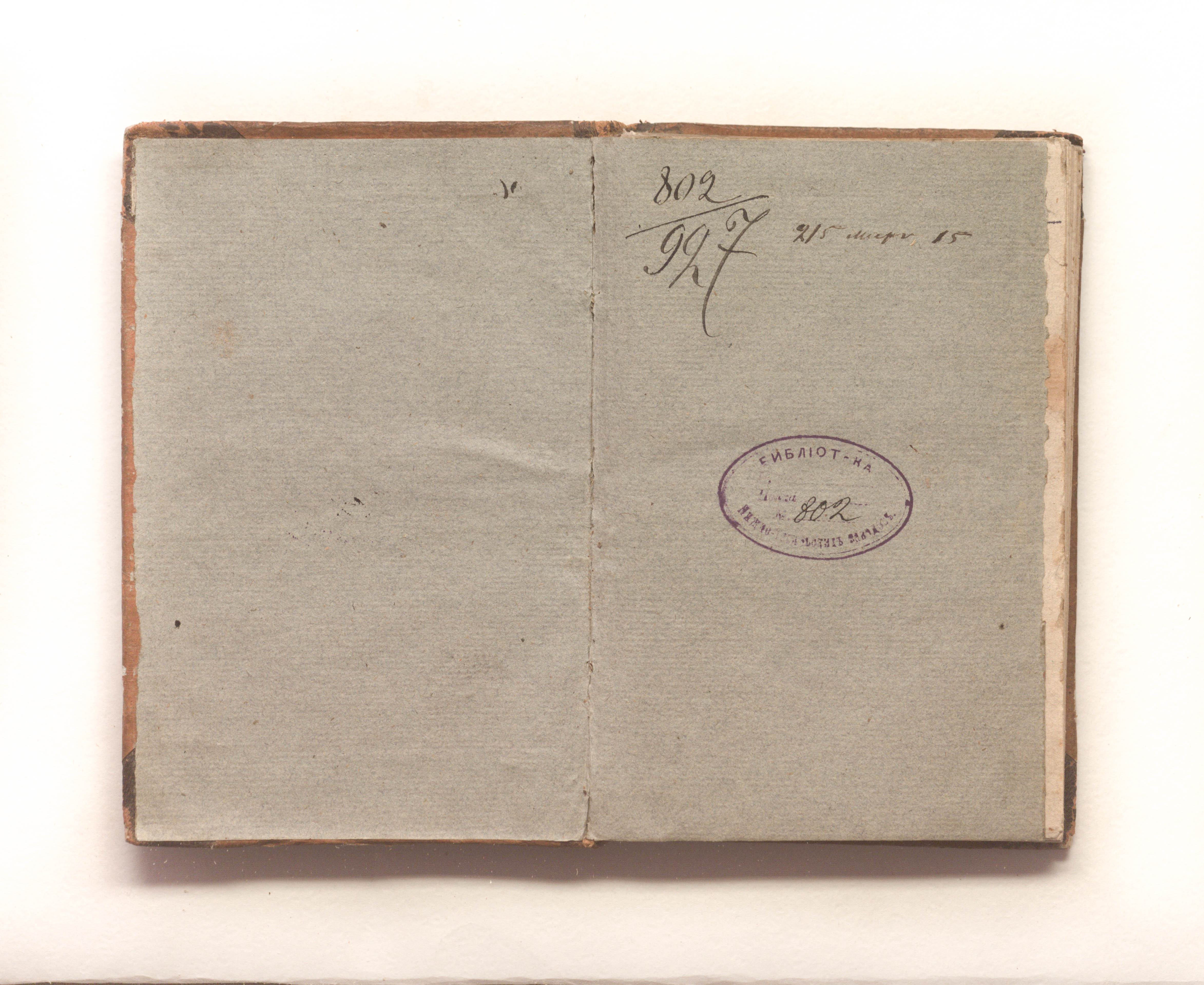 «Библиотека Нижне-Тагильских заводов. № 802» (форзац, тит. л. штамп угасает); «Библиотека Нижне-Тагильских заводов. Шкаф 28. Полка II. № 6» (тит. л.).