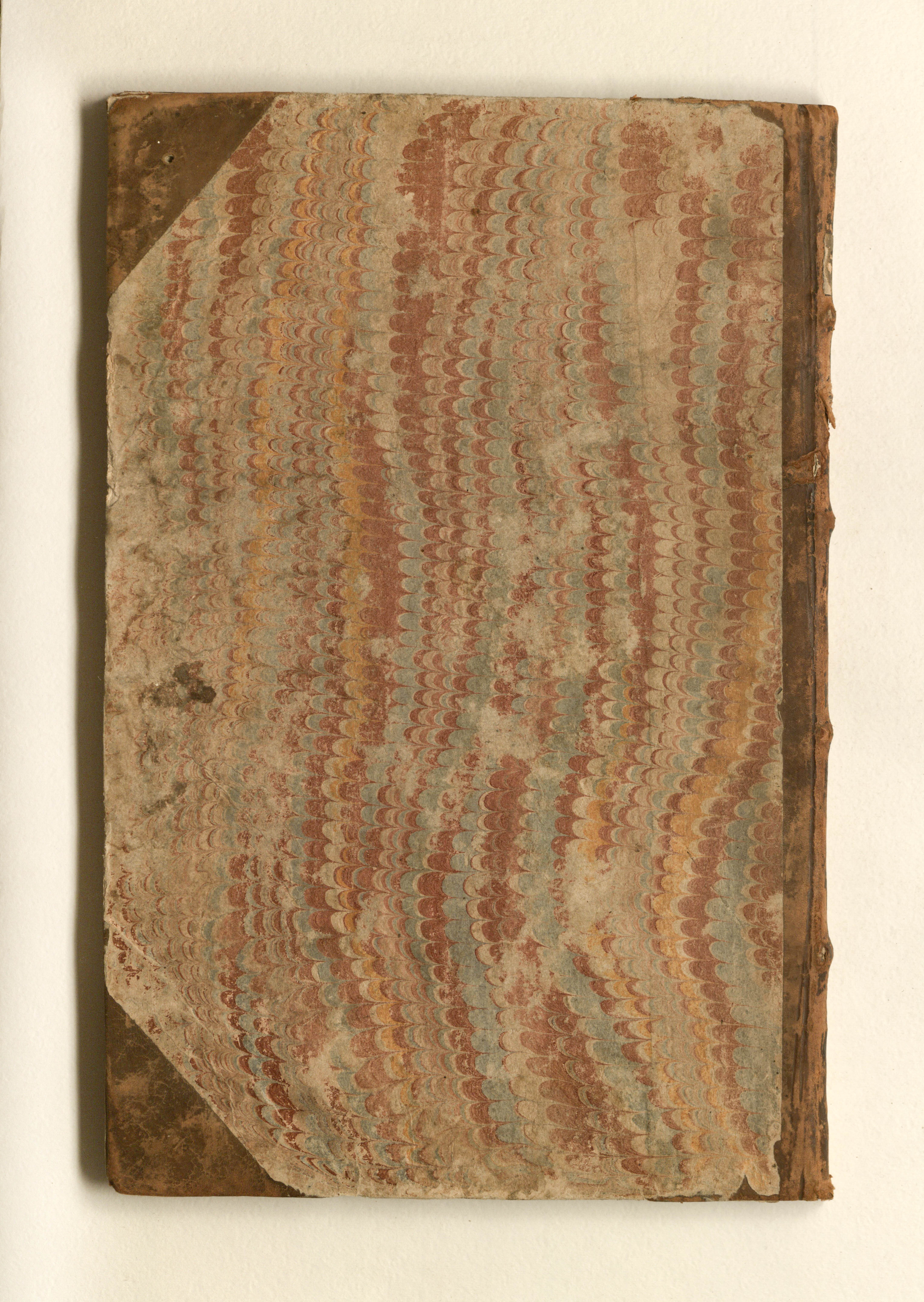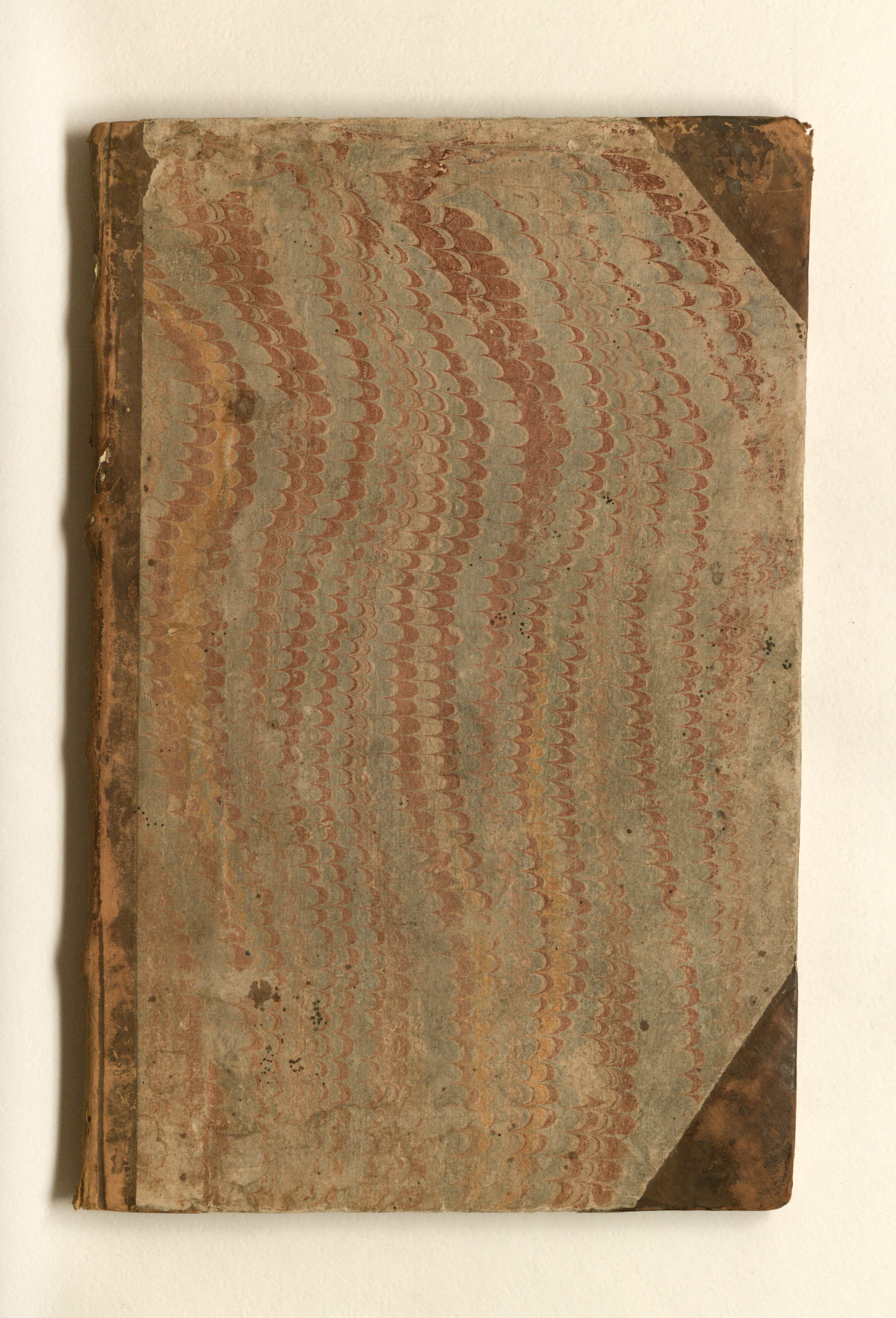 Книга в полукожаном владельческом переплете. Крышки переплета обтянуты бумагой с рисунком «под мрамор». Обрез тонированный. Бумага верже, водяные знаки.