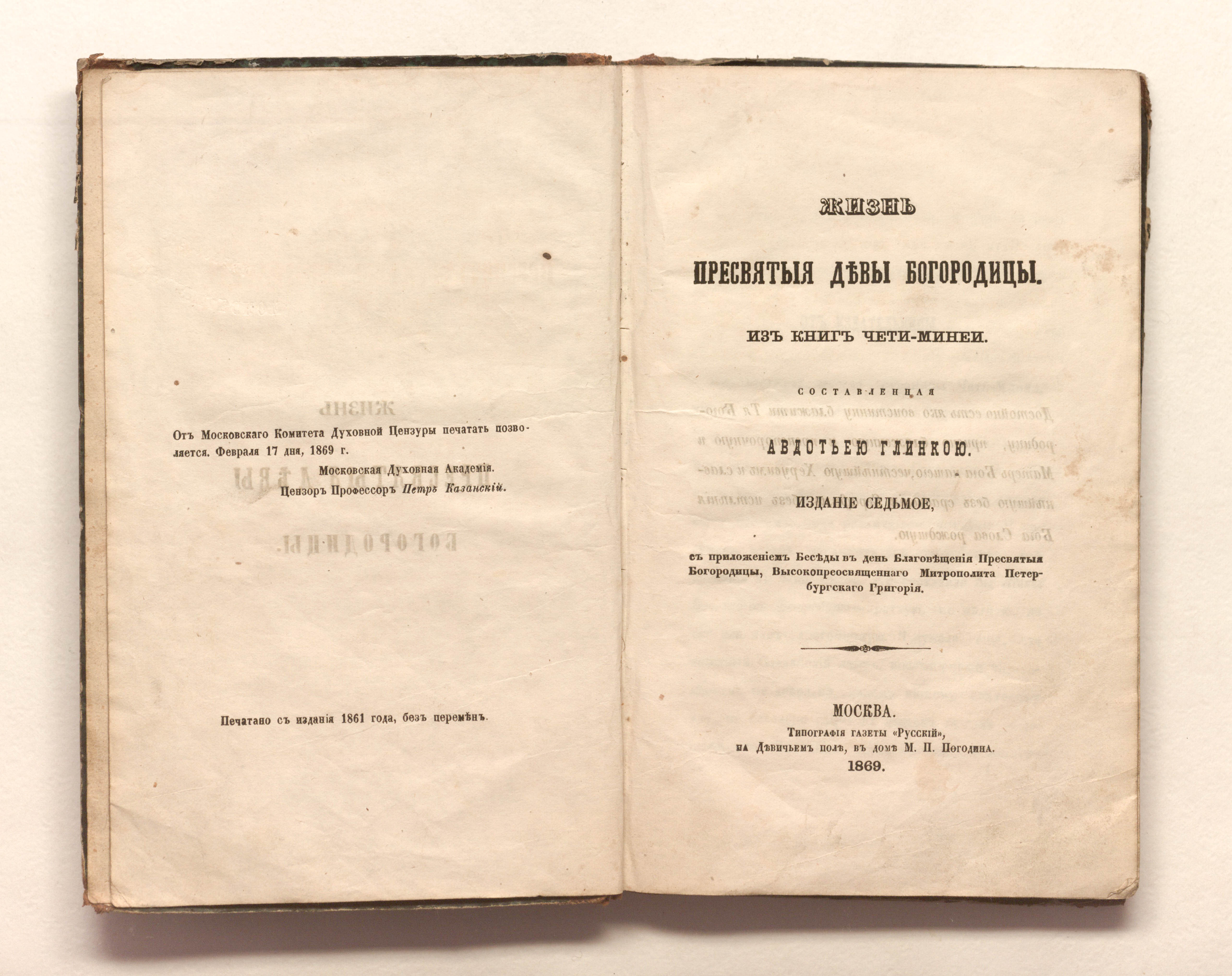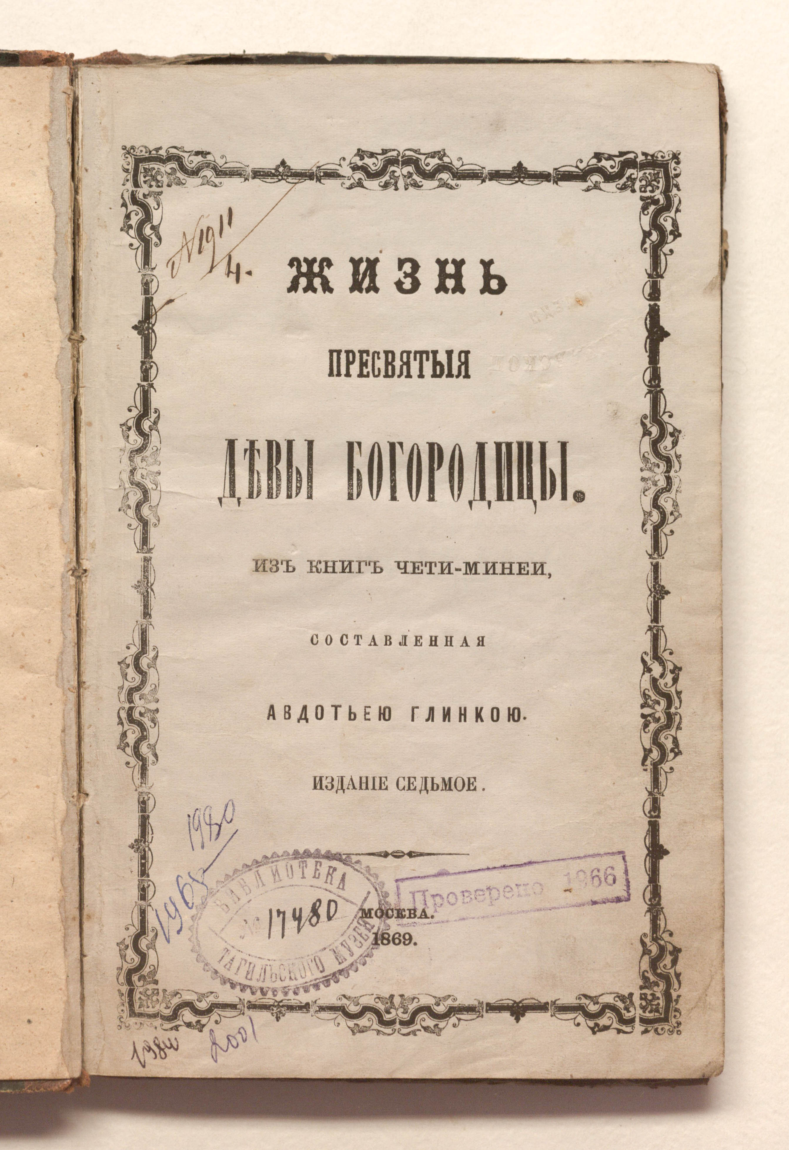 Жизнь Пресвятыя Девы Богородицы : из книг Четьи-Минеи / составленная Авдотьею Глинкою. – 7-е изд. – Москва : тип. газеты "Русский", 1869. – 226, II с. ; 21,5х13,5 см.
