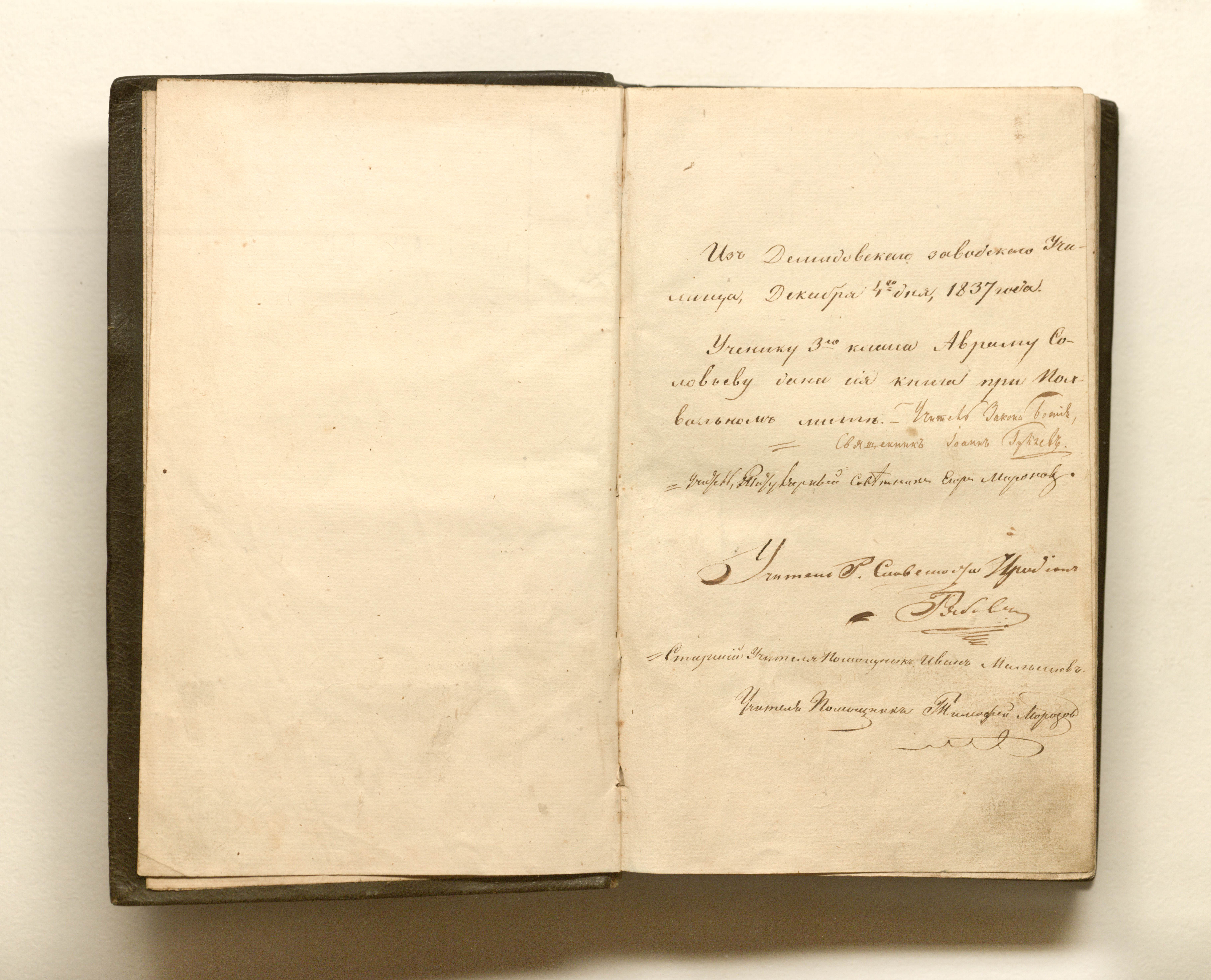 «Из Демидовского заводского училища декабря 4-го дня 1837 года. Ученику 3-го класса Авраму Соловьеву дана сия книга при Похвальном листе. Учитель Закона Божия священник Иоанн Гу(неразб.)в. Учитель (неразб.) Егор Миронов. Учитель Р. Словесности Иродион Рябов. Старший учителя помощник Иван Мальцев. Учитель помощника Тимофей Морозов» (перепл. л.);