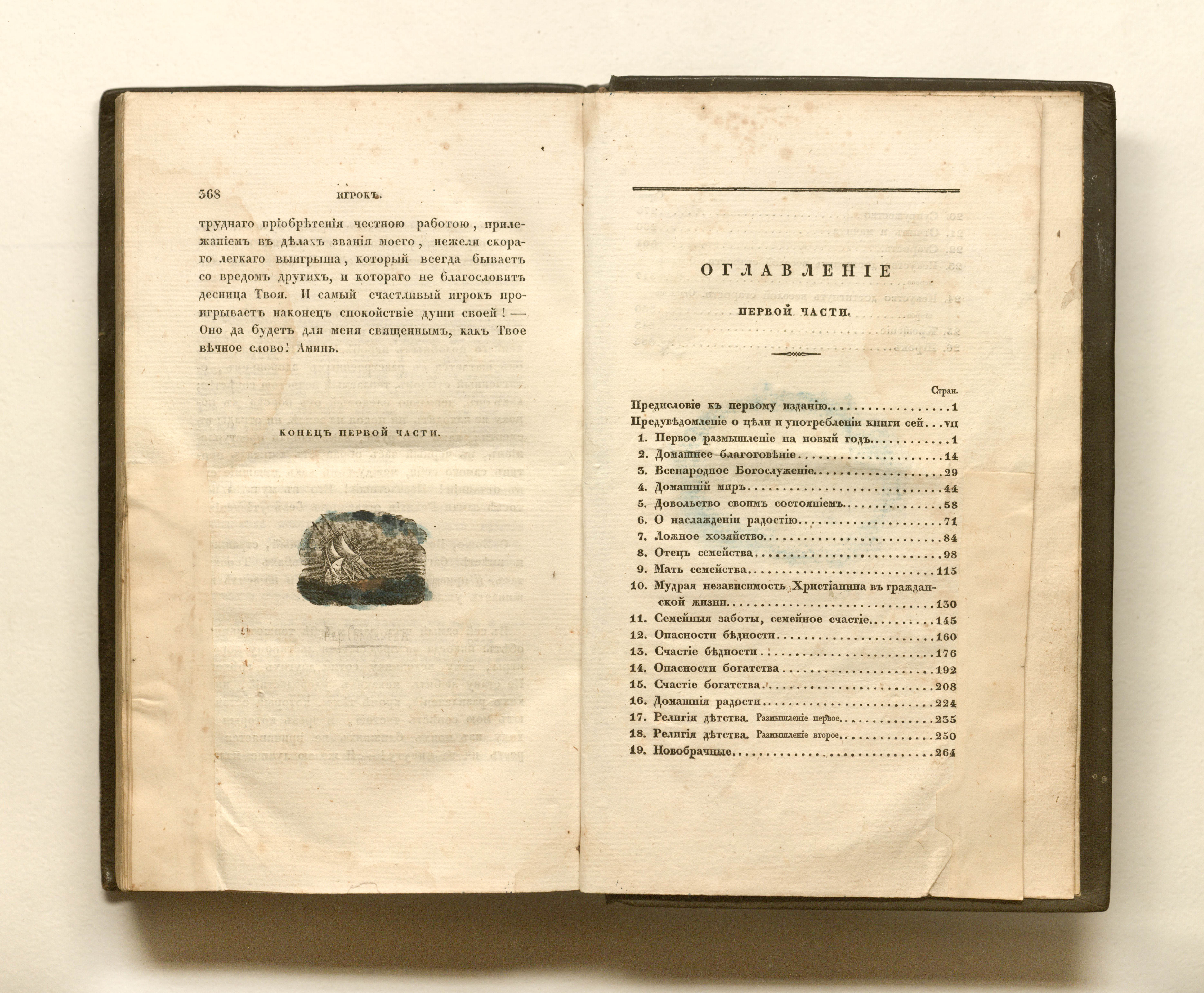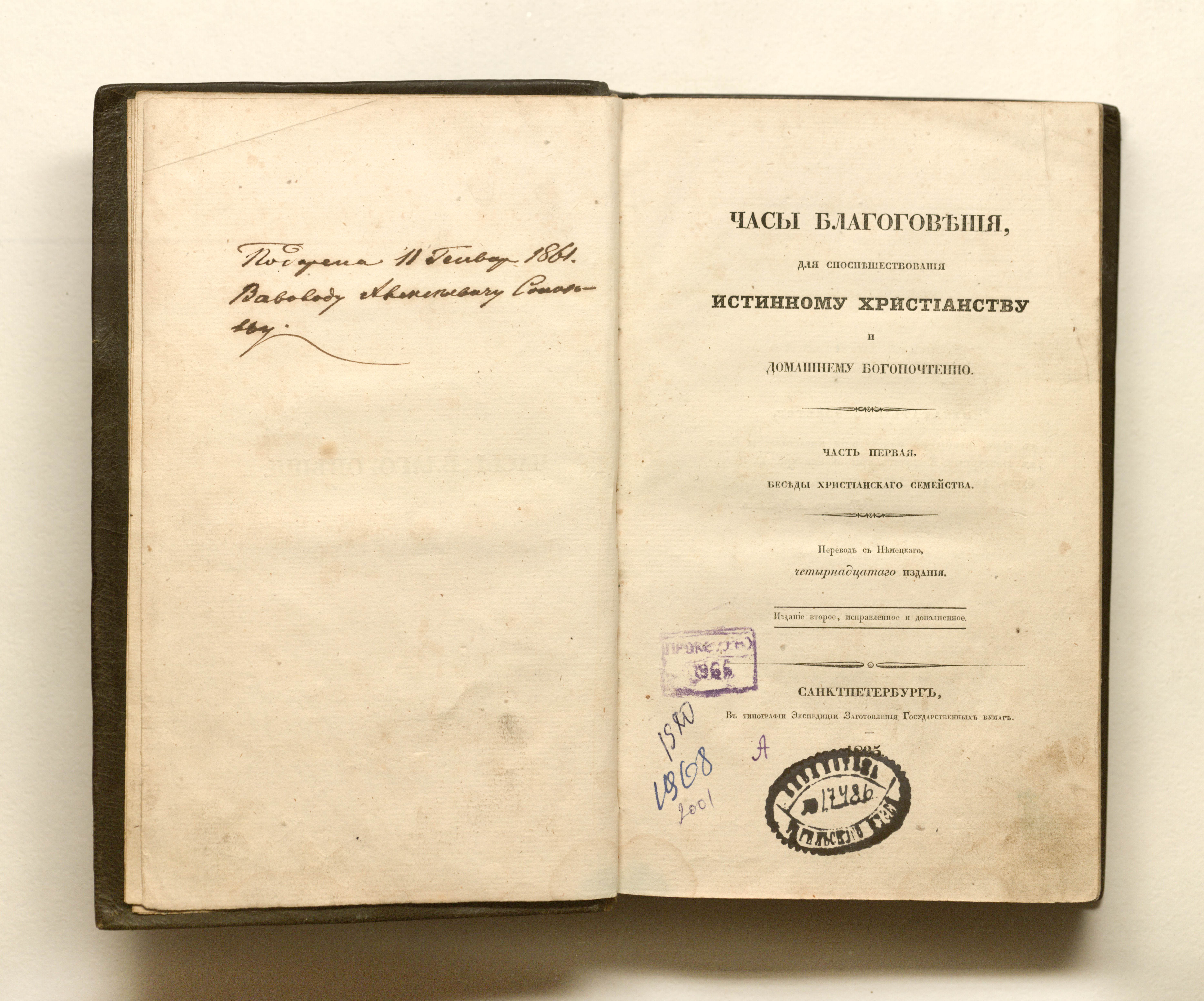 Цшокке Генрих (1771-1848). Часы благоговения, для споспешествования истинному христианству и домашнему богопочтению : перевод с немецкого, 14-го изд. В 3 ч. Ч. 1: Беседы христианского семейства / Г. Цшоке. 2-е изд., испр. и доп. — Санкт-Петербург : В Тип. Экспедиции заготовления гос. Бумаг, 1835. — [4], XX, 368, [2] с. ; 24,5х15 см.