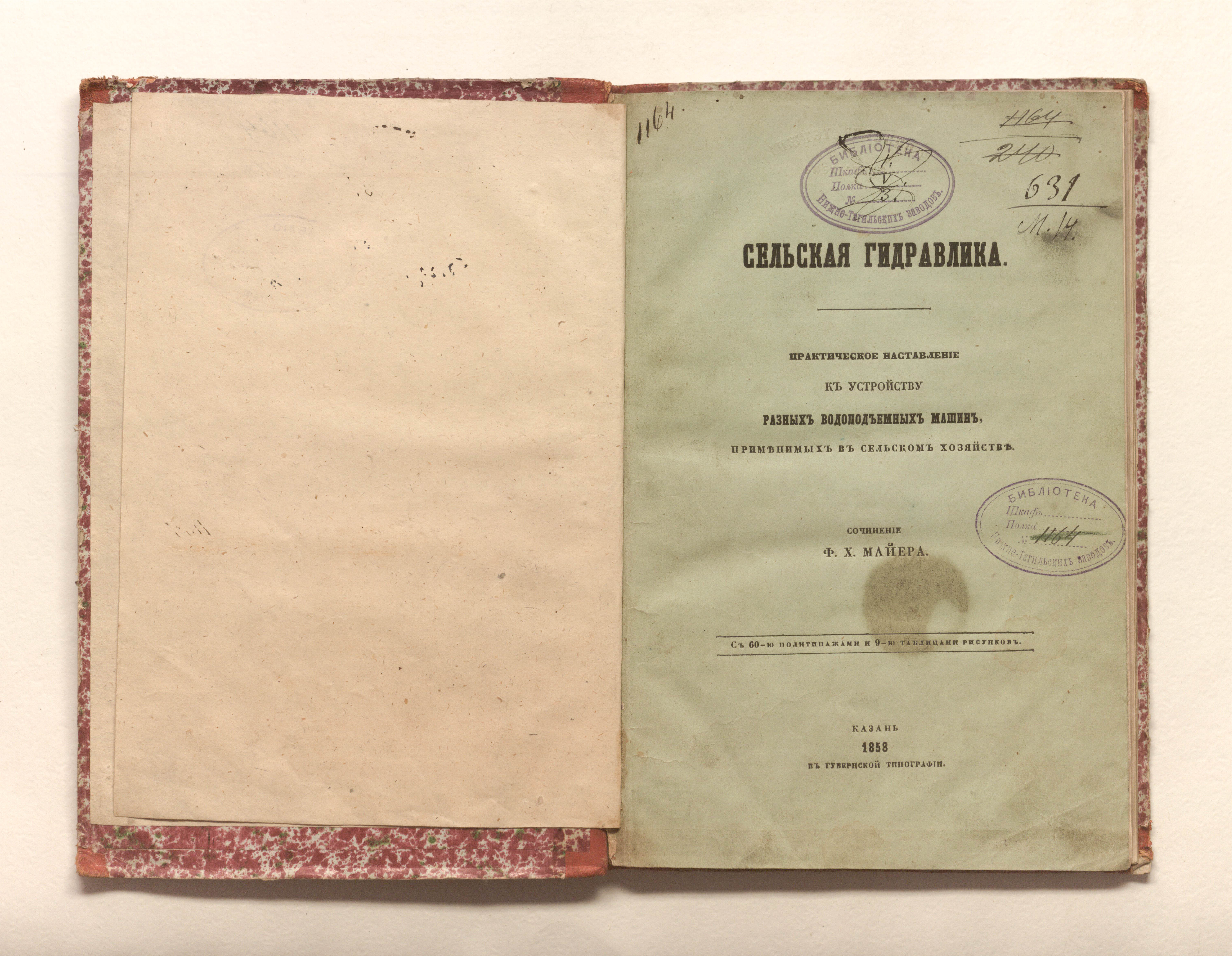 Сельская гидравлика : практическое наставление к устройству разных водоподъемных машин, применимых в сельском хозяйстве / Соч. Ф. Х. Майера. — Казань : в Губернской тип., 1858. — 123, 4 с. : 9 л. табл. ; 24х16 см.