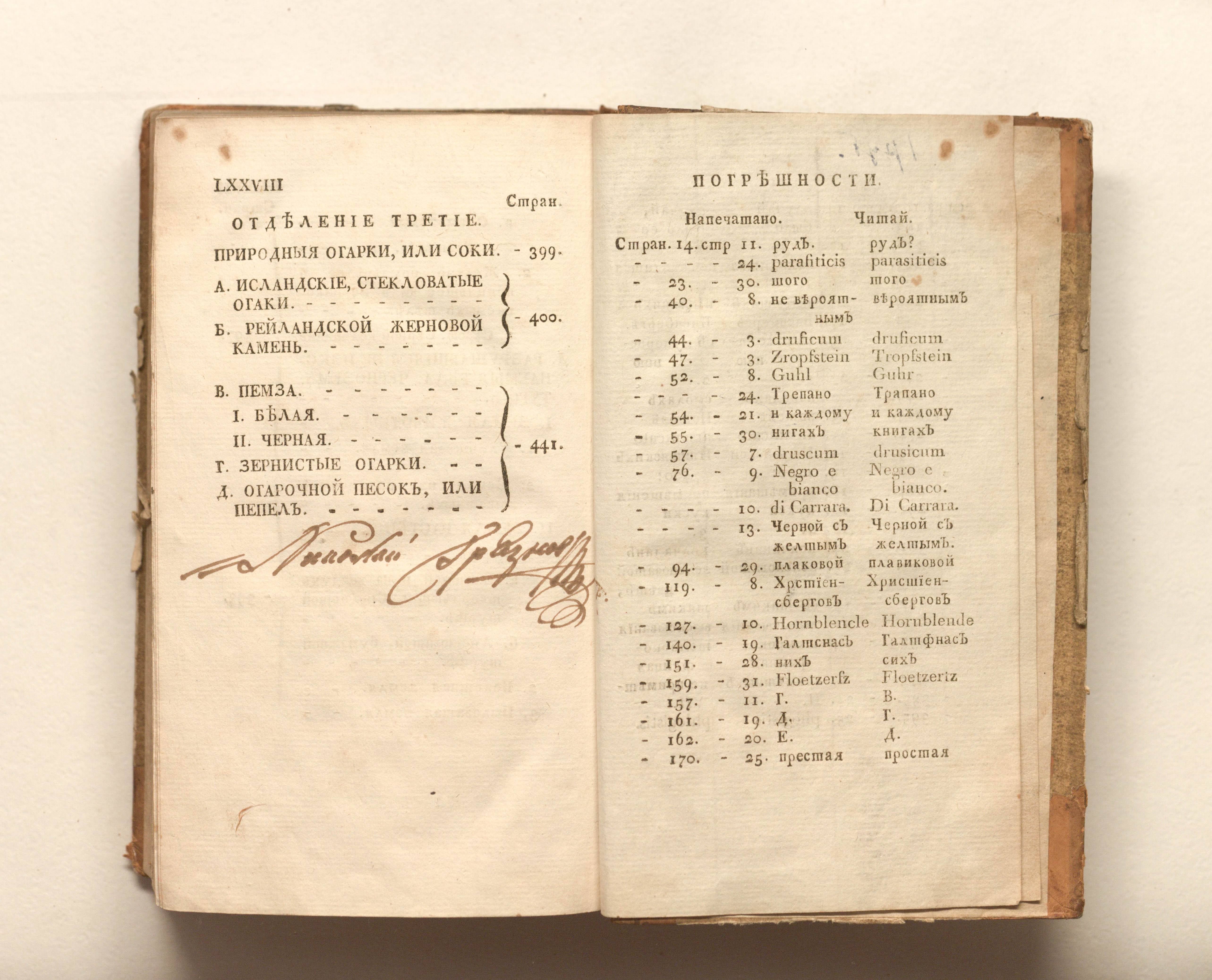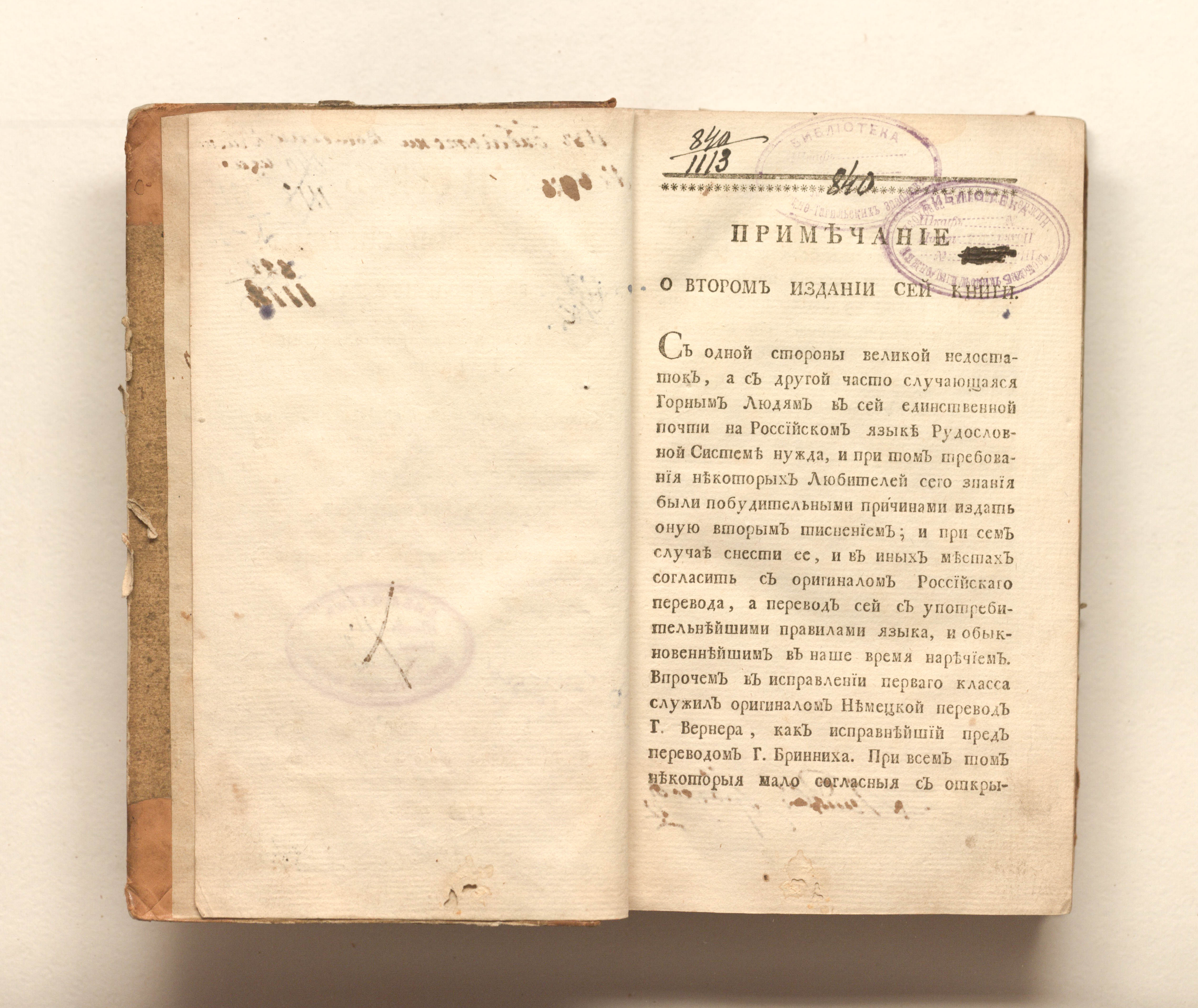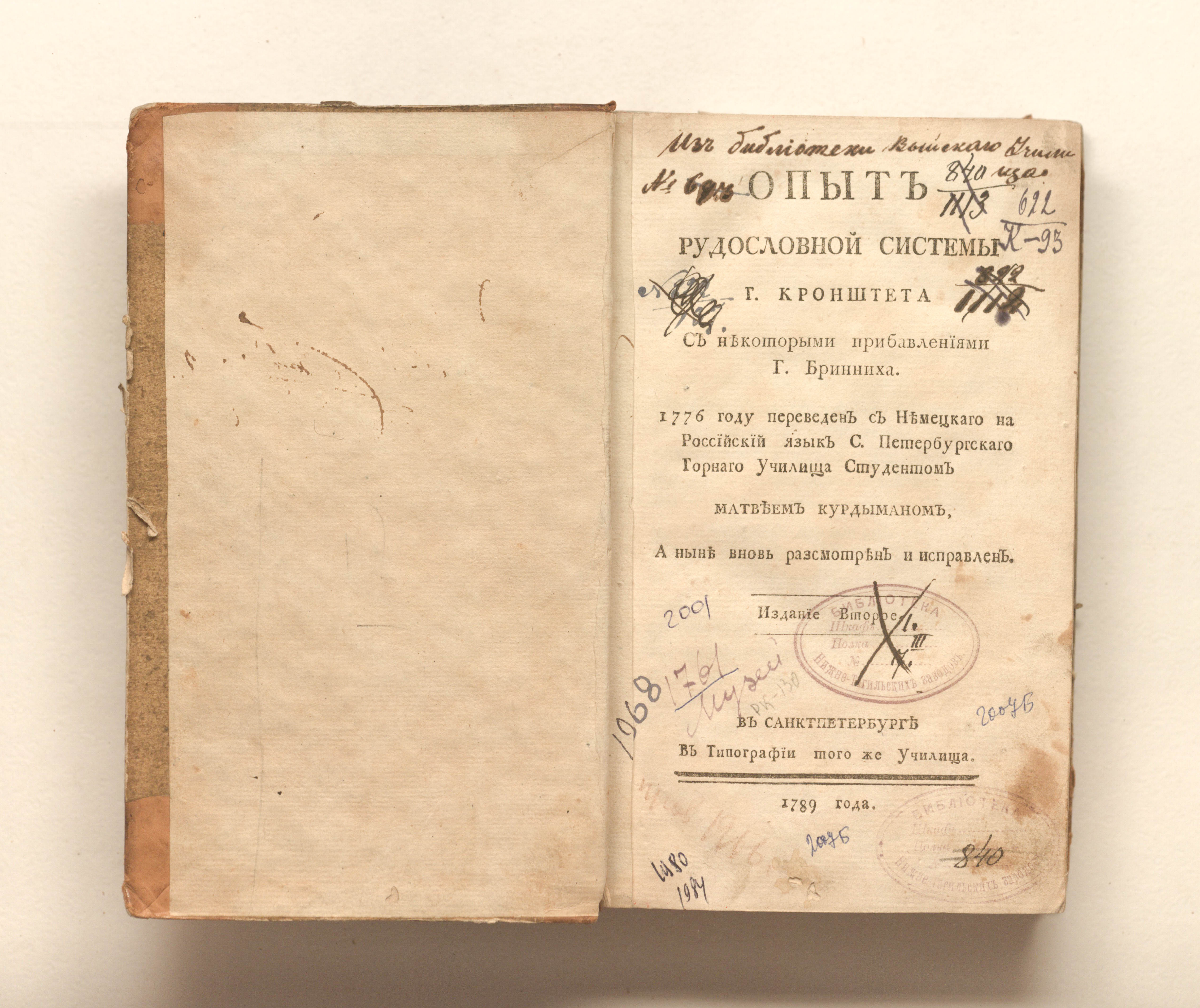Кронштедт, Аксель Фредрик (1722-1765). Опыт рудословной системы г. Кронштета / А. Ф. Кронштедт ; с некоторыми прибавлениями г. Бринниха. ; 1776 году переведен с немецкаго на российский язык С. Петербургскаго Горнаго училища студентом Матвеем Курдыманом, ; а ныне вновь разсмотрен и исправлен. — 2-е изд. — Санкт-Петербург : Тип. того же Училища, 1789. — [2], 20, 414, LXXVIII, [2] с. ; 20х12,5 см.