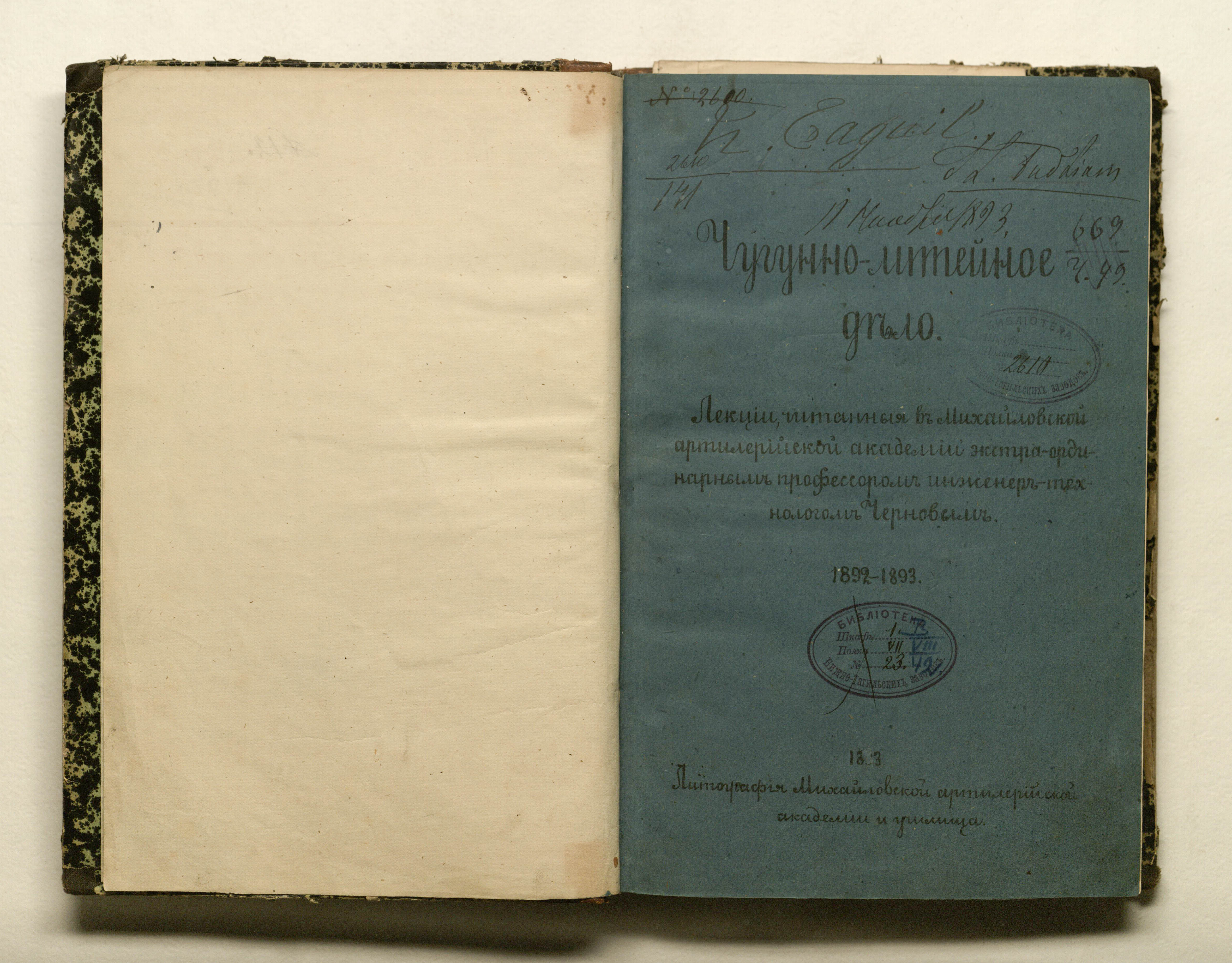 «Библиотека Нижне-Тагильских заводов. № 2610» (изд. обл., тит. л.);