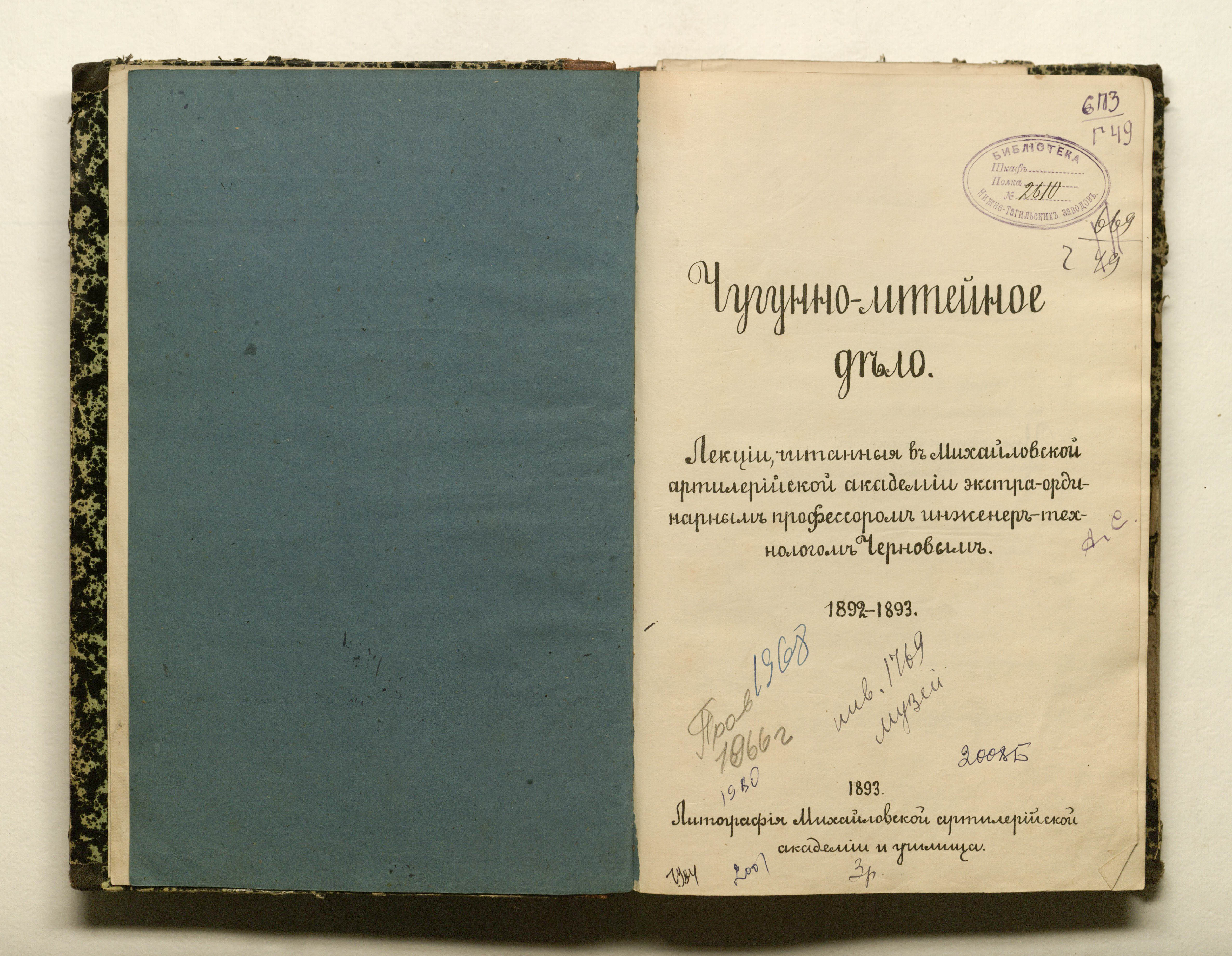Чернов, Дмитрий Константинович (1839-1921). Чугунолитейное дело : лекции / чит. в Михайлов. арт. акад. экстра-орд. проф. инж.-технол. Черновым. — [Санкт-Петербург] : лит. Михайловской арт. акад. и уч-ща, 1893. — II, 259 с. : табл. ; 26х17,5 см.