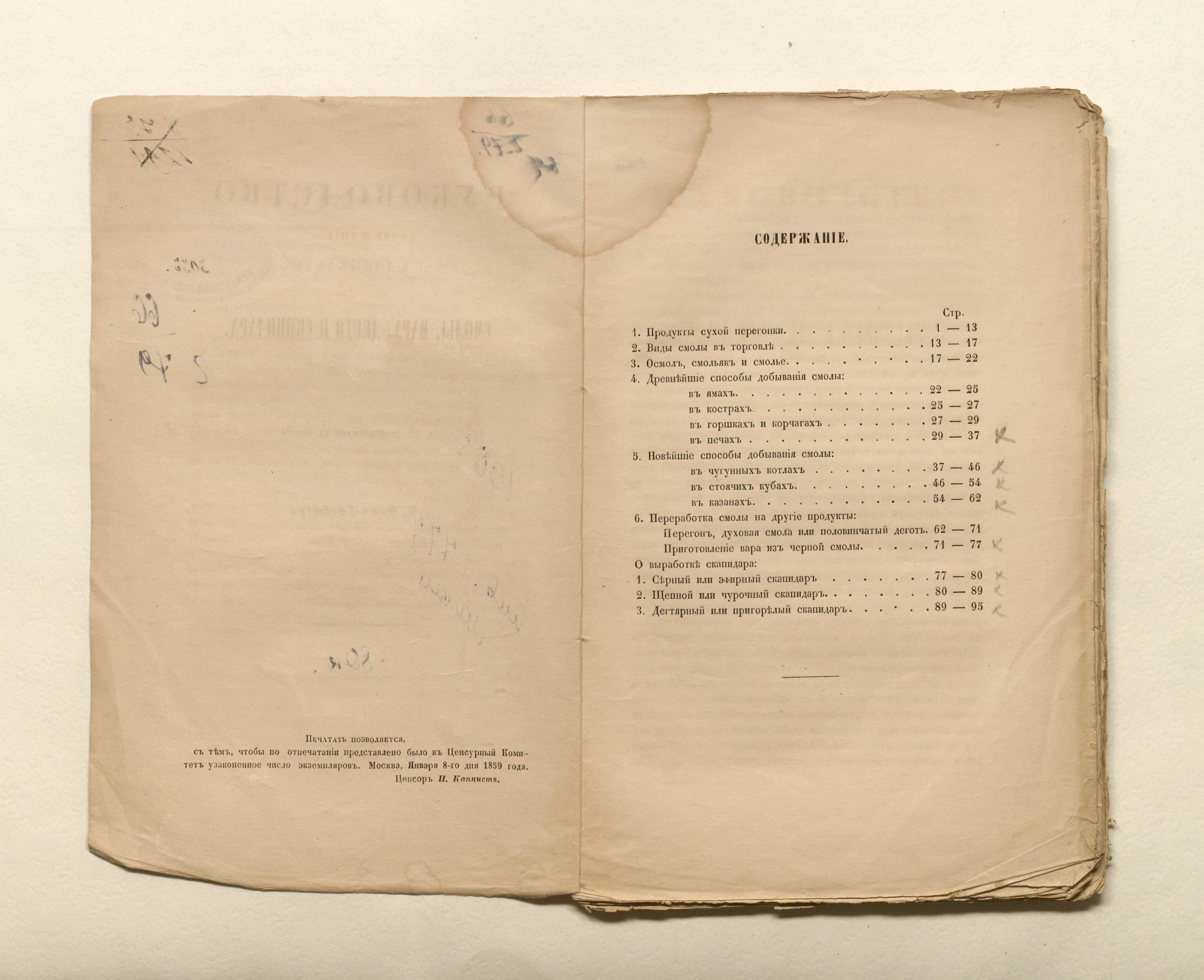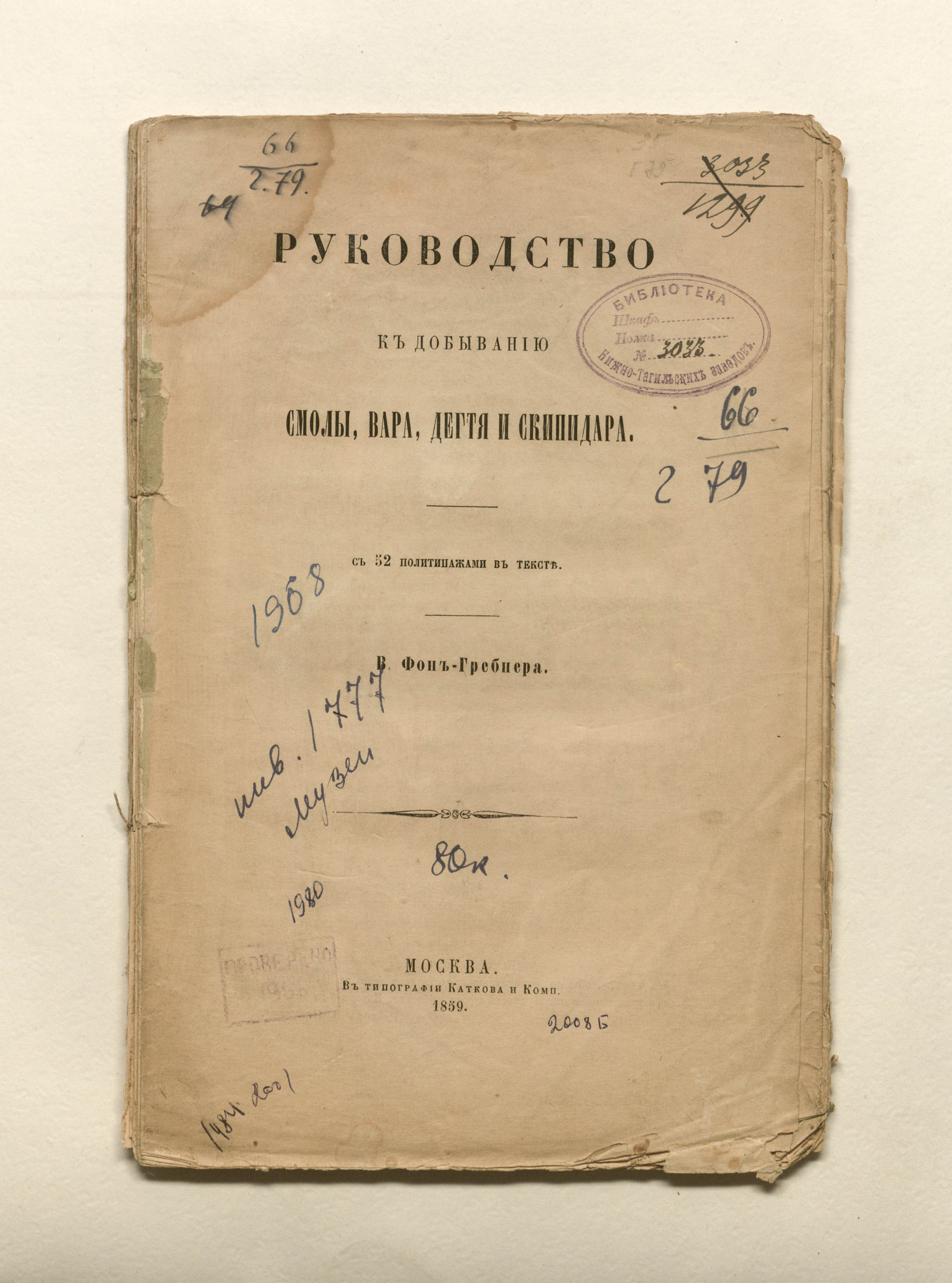 Гребнер, Вильгельм Августович фон. Руководство к добыванию смолы, вара, дегтя и скипидара / В. А. Гребнер. — Москва : тип. Каткова и К°, 1859. — [4], 104 с. : ил. ; 25,5х16.5 см.