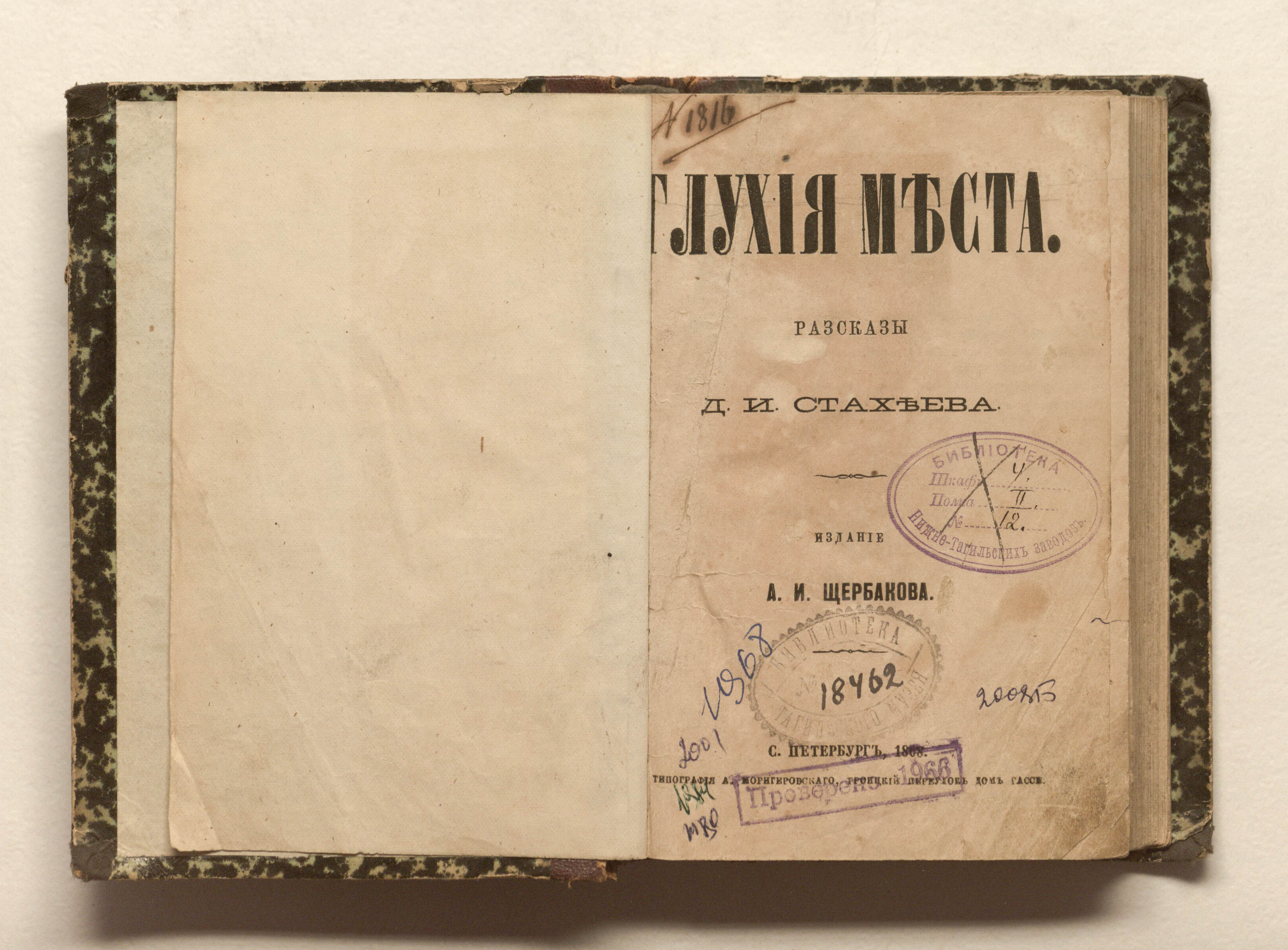 Глухие места : рассказы / Д. И. Стахеев. — Санкт-Петербург : издание А. И. Щербакова, 1868. — [4], 326, [1] с. ;17х12 см.