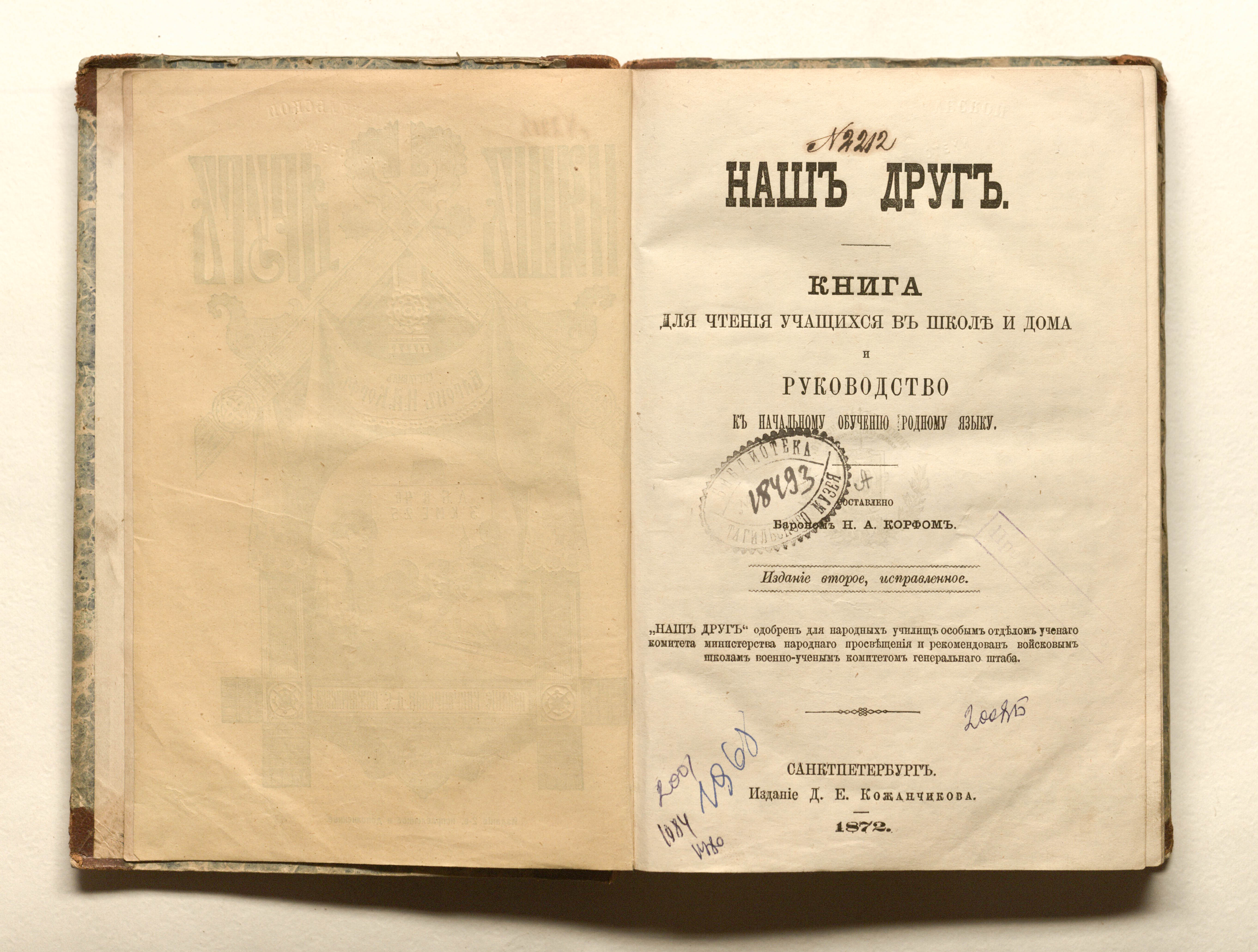 Наш друг : книга для чтения учащихся в школе и дома и руководство к начальному обучению родному языку / составлено бароном Н. А. Корфом. — 2-е изд., испр. и доп. — Санкт-Петербург : издание Д. Е. Кожанчикова, 1872. — XXVIII, 300, 6, VI с.