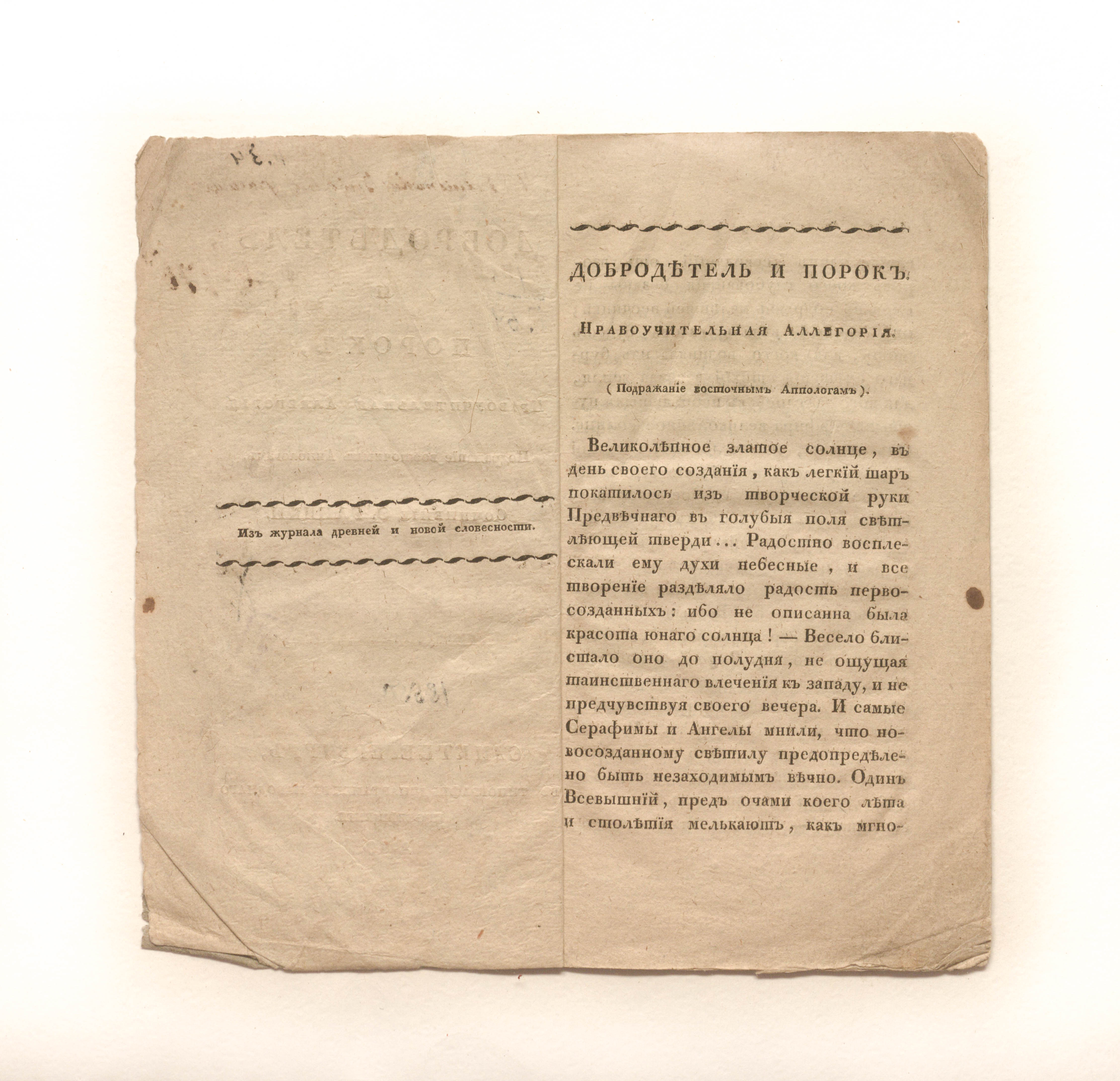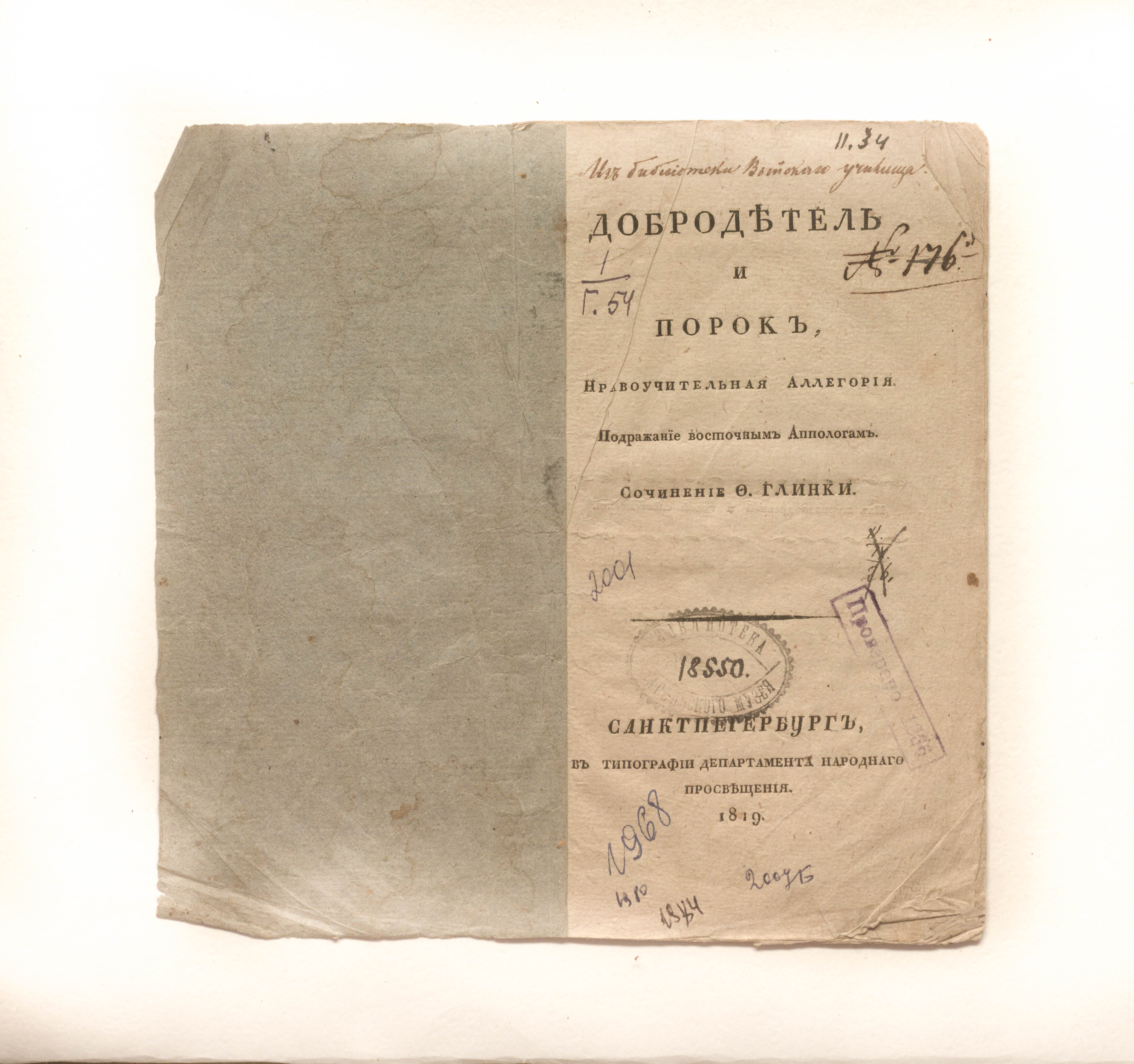 Глинка, Федор Николаевич (1786 — 1880). Добродетель и порок : нравоучительная аллегория. Подражание восточным аппологам / сочинение Ф. Глинки. — Санкт-Петербург : в типографии Департамента народнаго просвещения, 1819. — [2], 17 с. ; 20,7х12 см.
