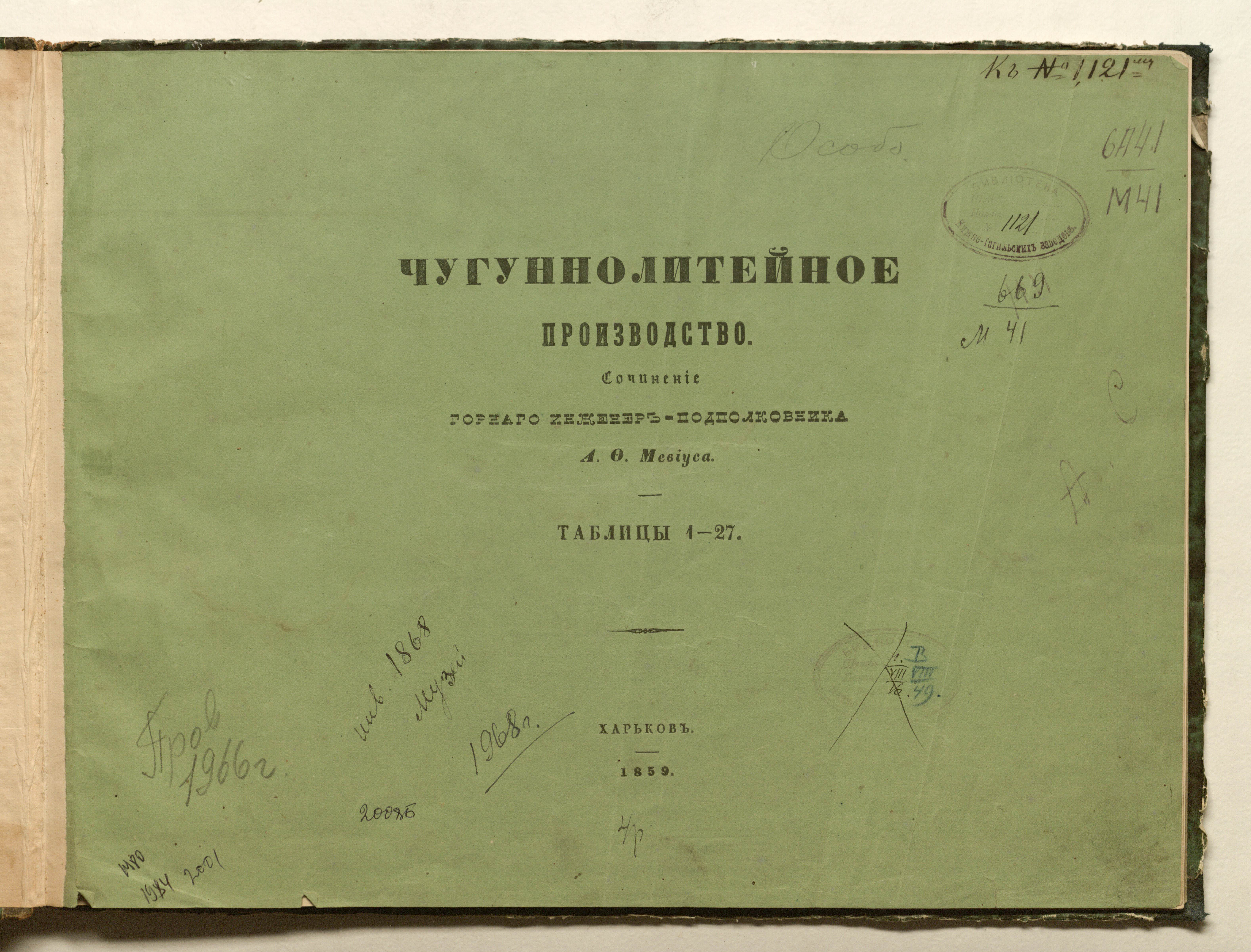 Чугунолитейное производство соч. горнаго инженер-подполковника А. Ф. Мевиуса : [Альбом чертежей] / А. Ф. Мевиус. — Харьков : [б. и.], 1859 (Одесса : в лит. Францова и Нтиче; лит. Шварц). — 27 л. ; 28,5х37