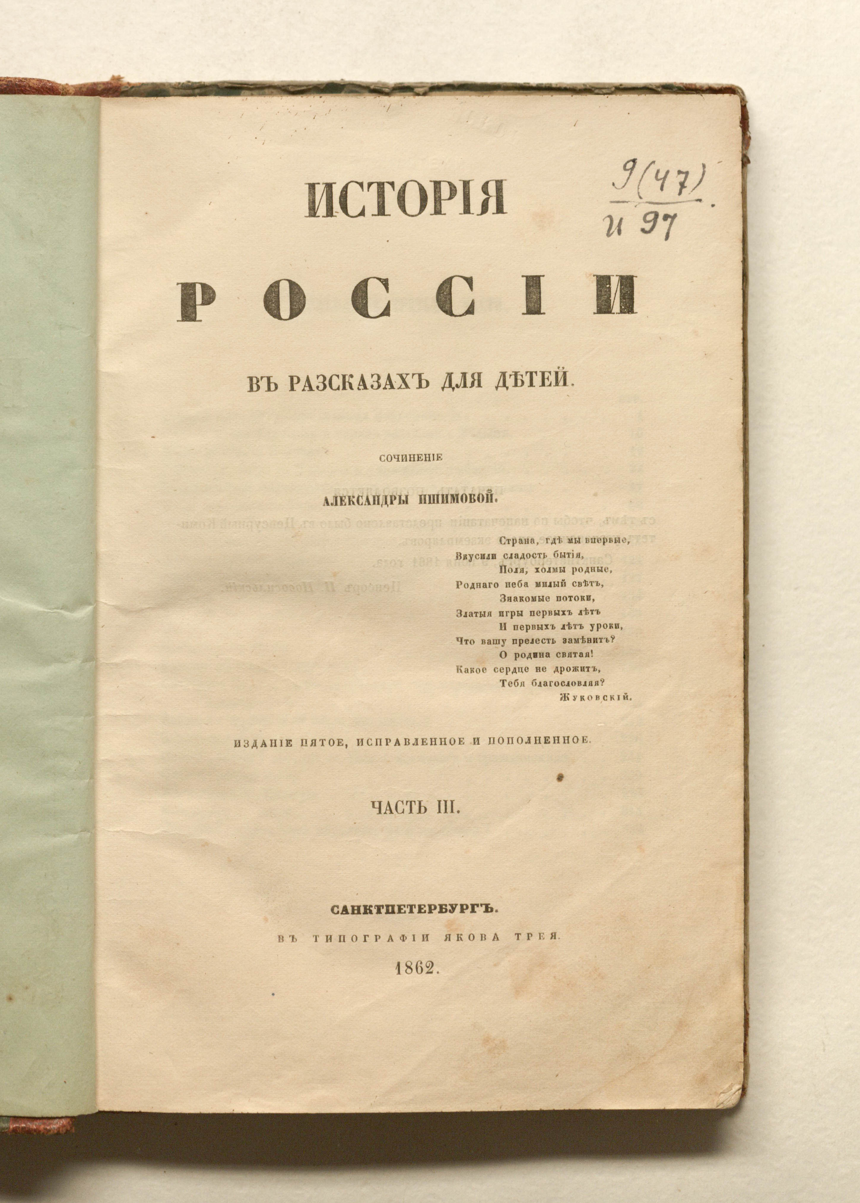 История России в рассказах для детей. Ч. 3 / сочинение Александры Ишимовой. — 5-е изд., испр. и доп. — Санкт-Петербург : тип. Якова Трея, 1862. — [4], 356 с. ; 22х14,5 см.