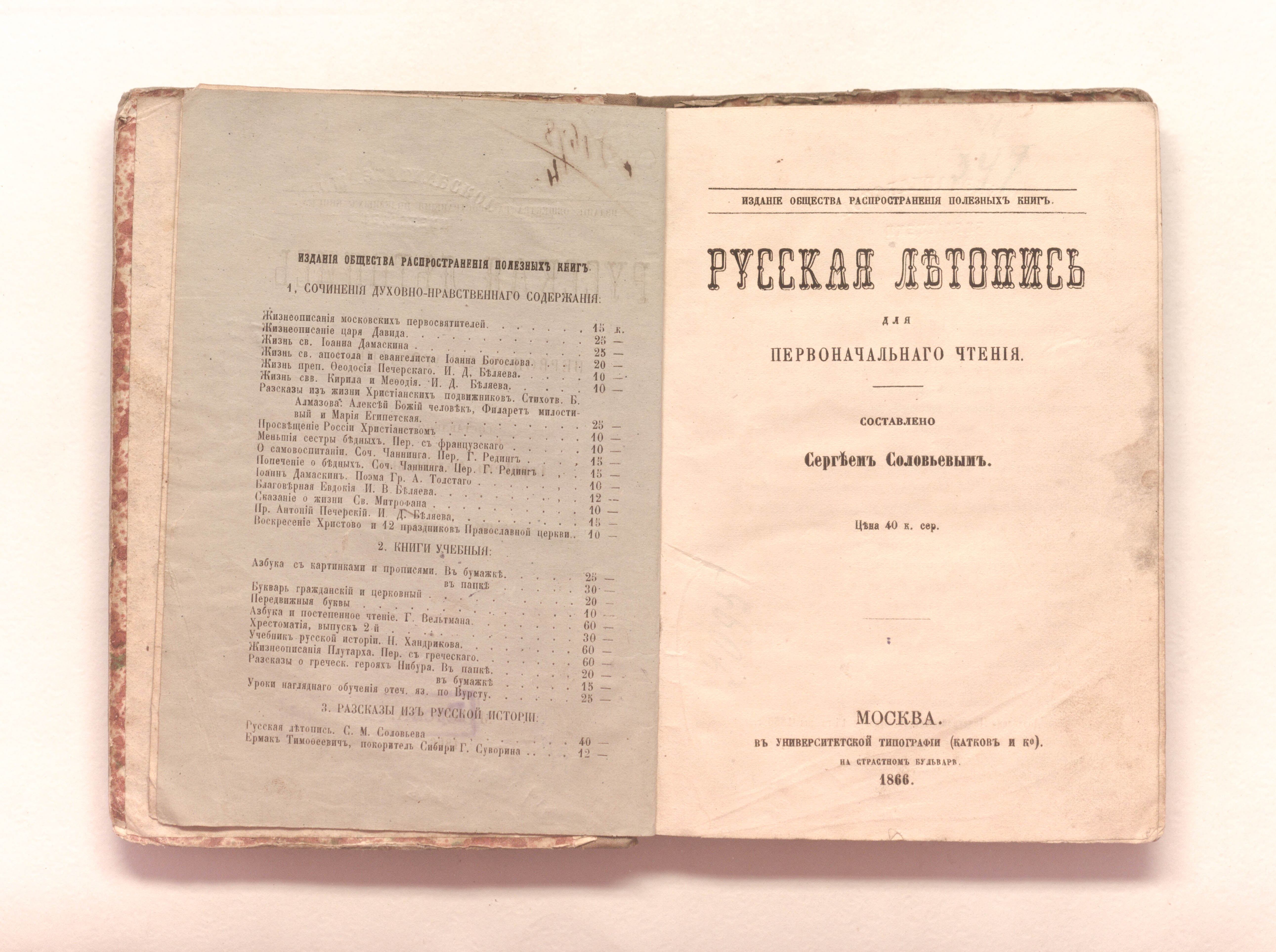 Русская летопись для первоначального чтения / составлено Сергеем Соловьевым. — Москва : Общество распространения полезных книг, 1866 (в Университетской типографии). — [2], 226 с. ; 18,7х13 см.