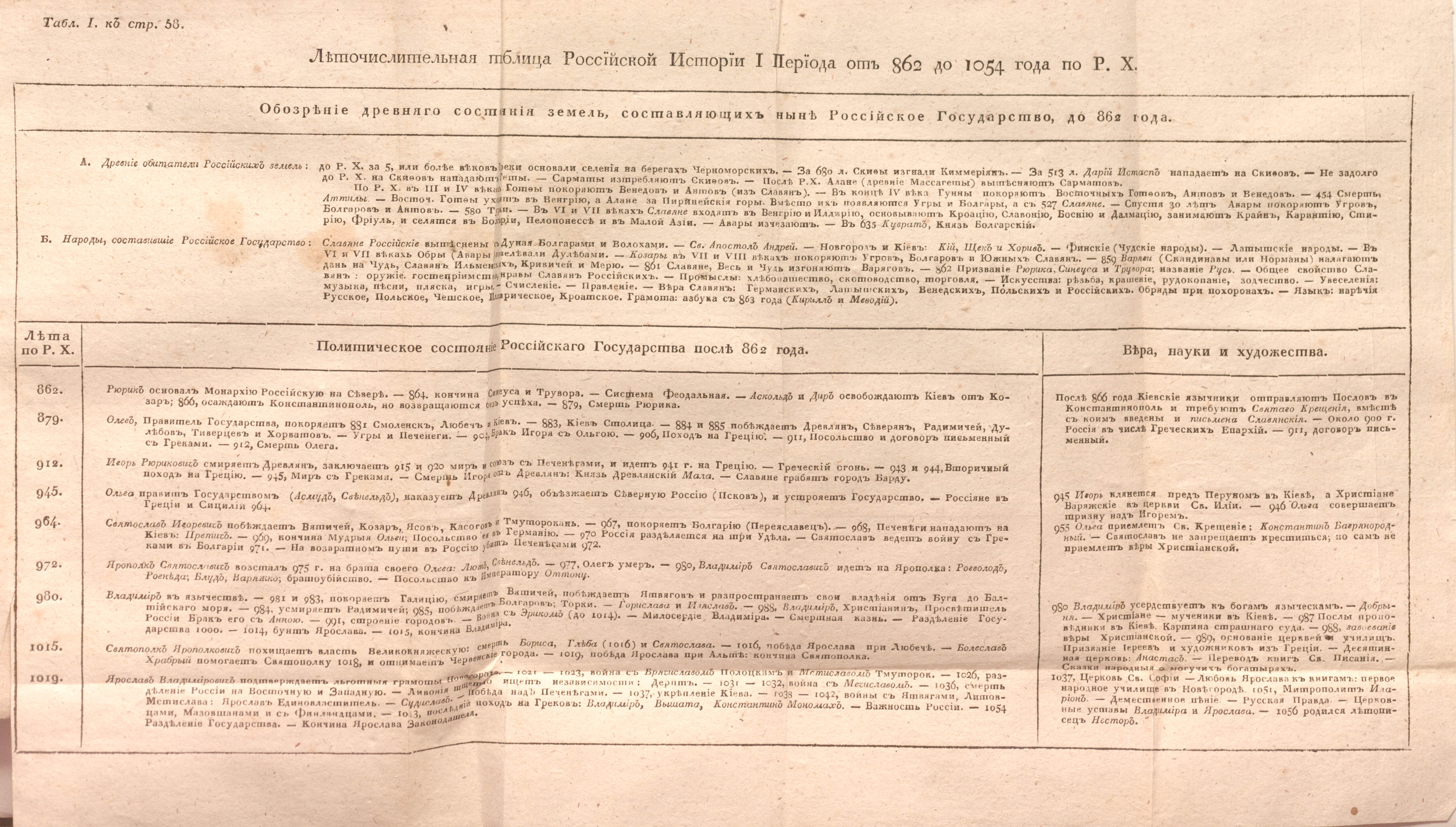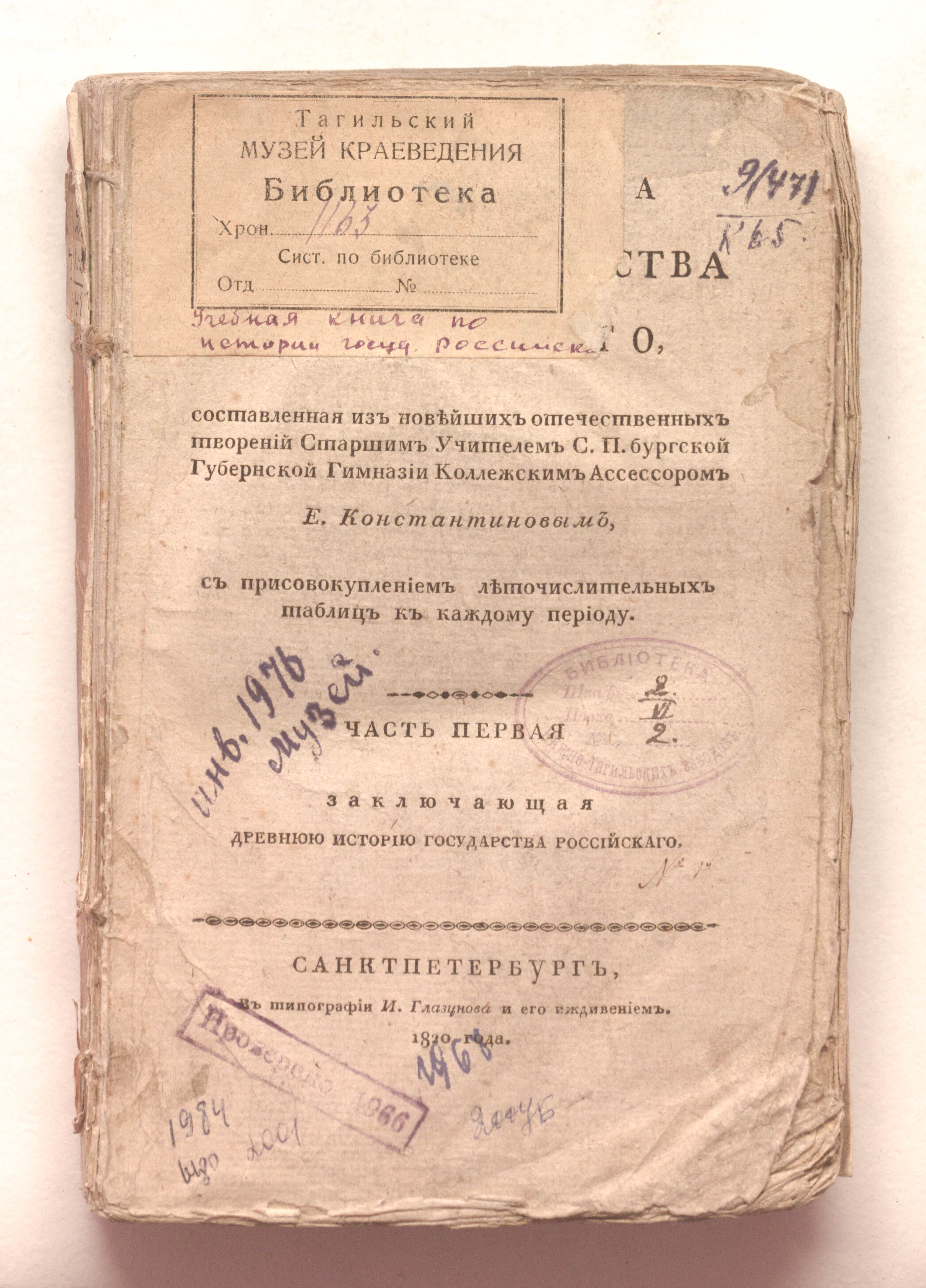 Учебная книга истории Государства Российскаго, составленная из новейших отечественных творений старшим учителем С. П. бургской губернской гимназии коллежским ассессором Е. Константиновым, с присовокуплением леточислительных таблиц к каждому периоду / Е. К. Константинов. – Санкт-Петербург : в типографии И. Глазунова и его иждивением, 1820. – 268 с. : табл. ; 21х14,5 см.