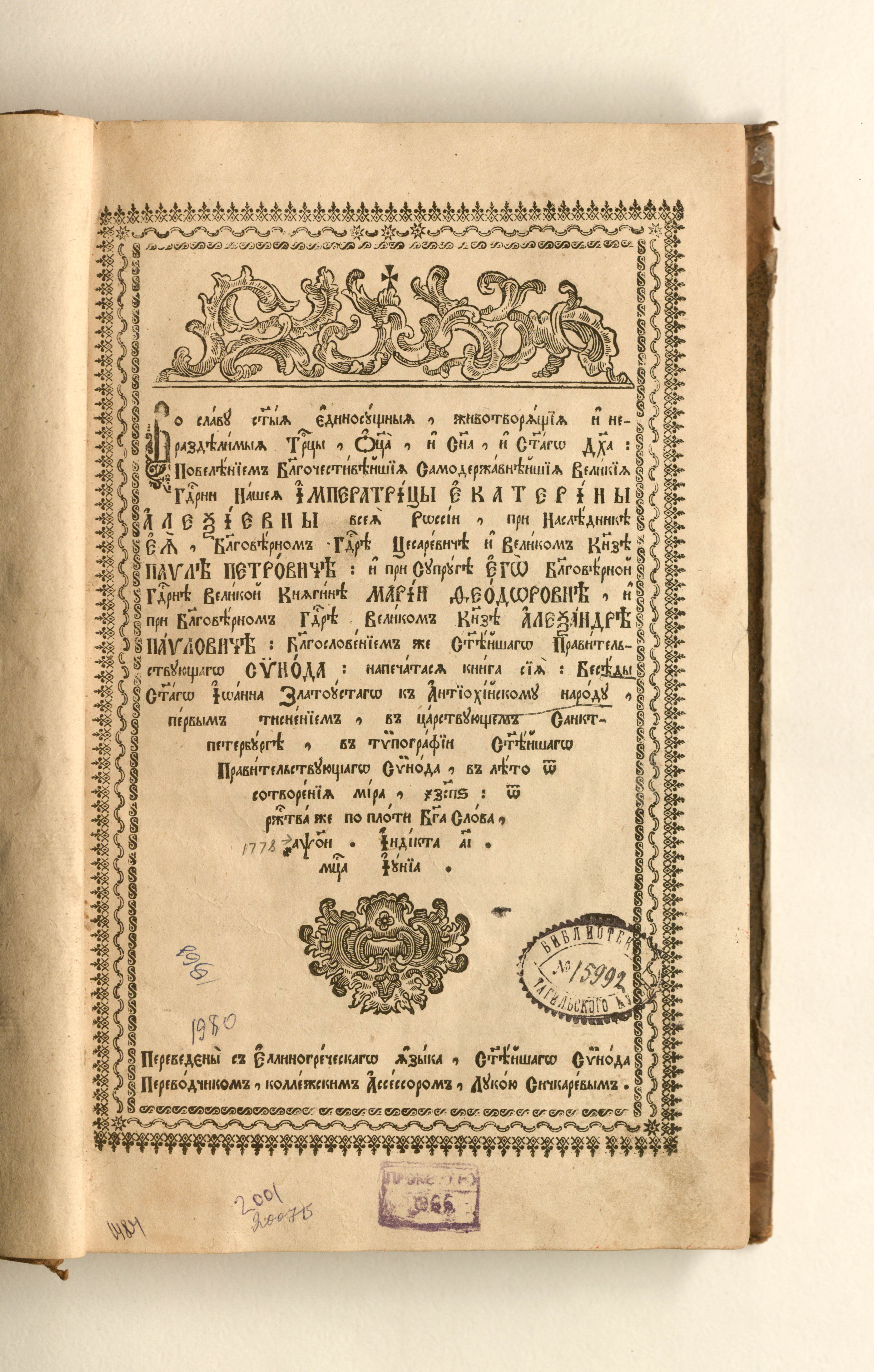 Иоанн Златоуст (Патриарх Константинопольский; 347-407). Беседы святого Иоанна Златоустого к антиохийскому народу / пер. с еллиногреческого языка, Святейшего Синода переводчиком, коллежским асессором Лукою Сичкаревым. — 1-е тиснение. — Санкт-Петербург : Синодальная тип., июнь 1778. — 1 тит. л., 1, 1-3, 2, 1-195 = 201 л.; 32х20 см.