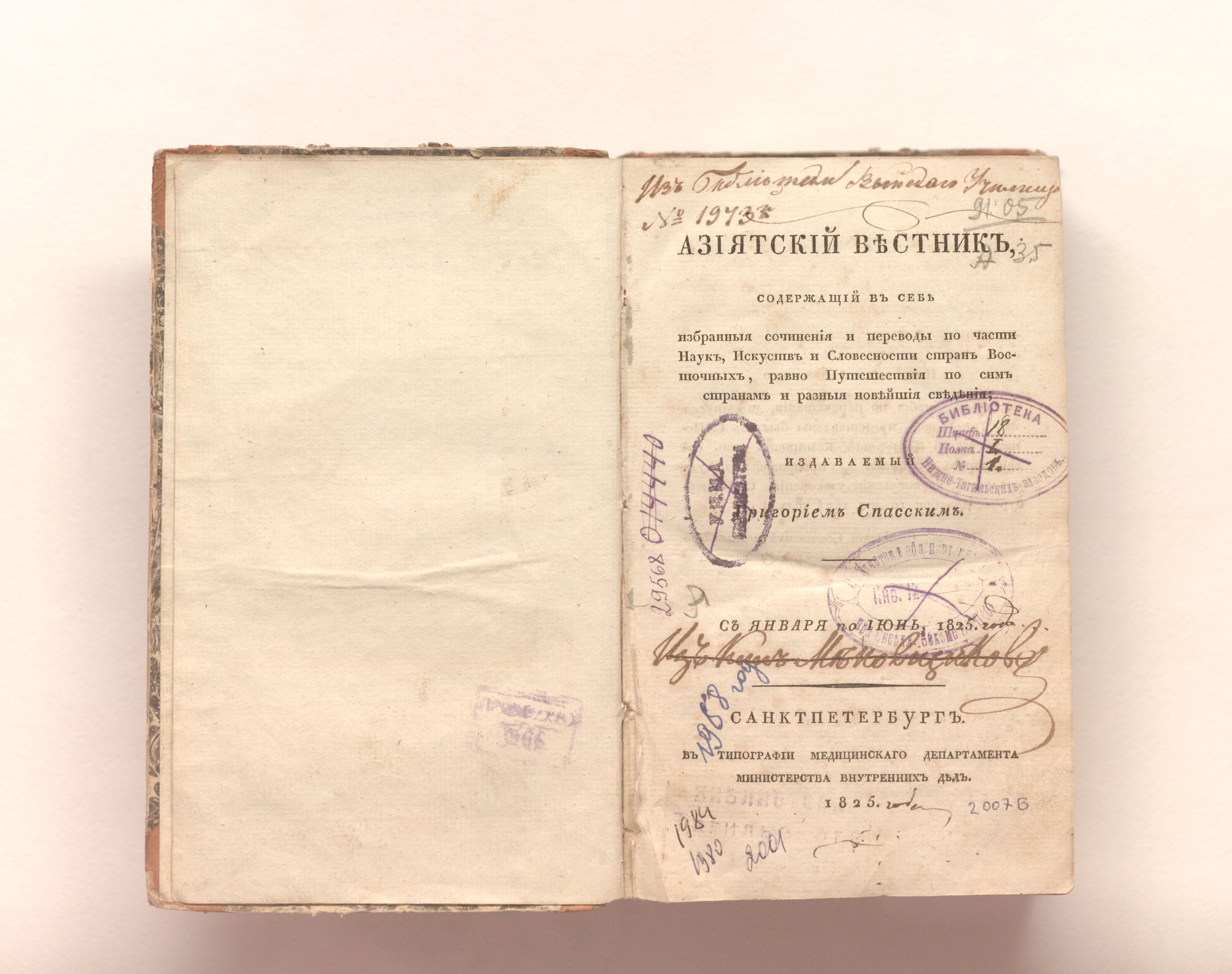 Азиатский вестник, содержащий в себе избранные сочинения и переводы по части наук, искусств и словесности стран восточных, равно путешествия по сим странам и разные новейшие сведения / издаваемый Григорием Спасским. – Санкт-Петербург. – 1825. – Январь-июнь. – 291 с. ; 20х12 см.