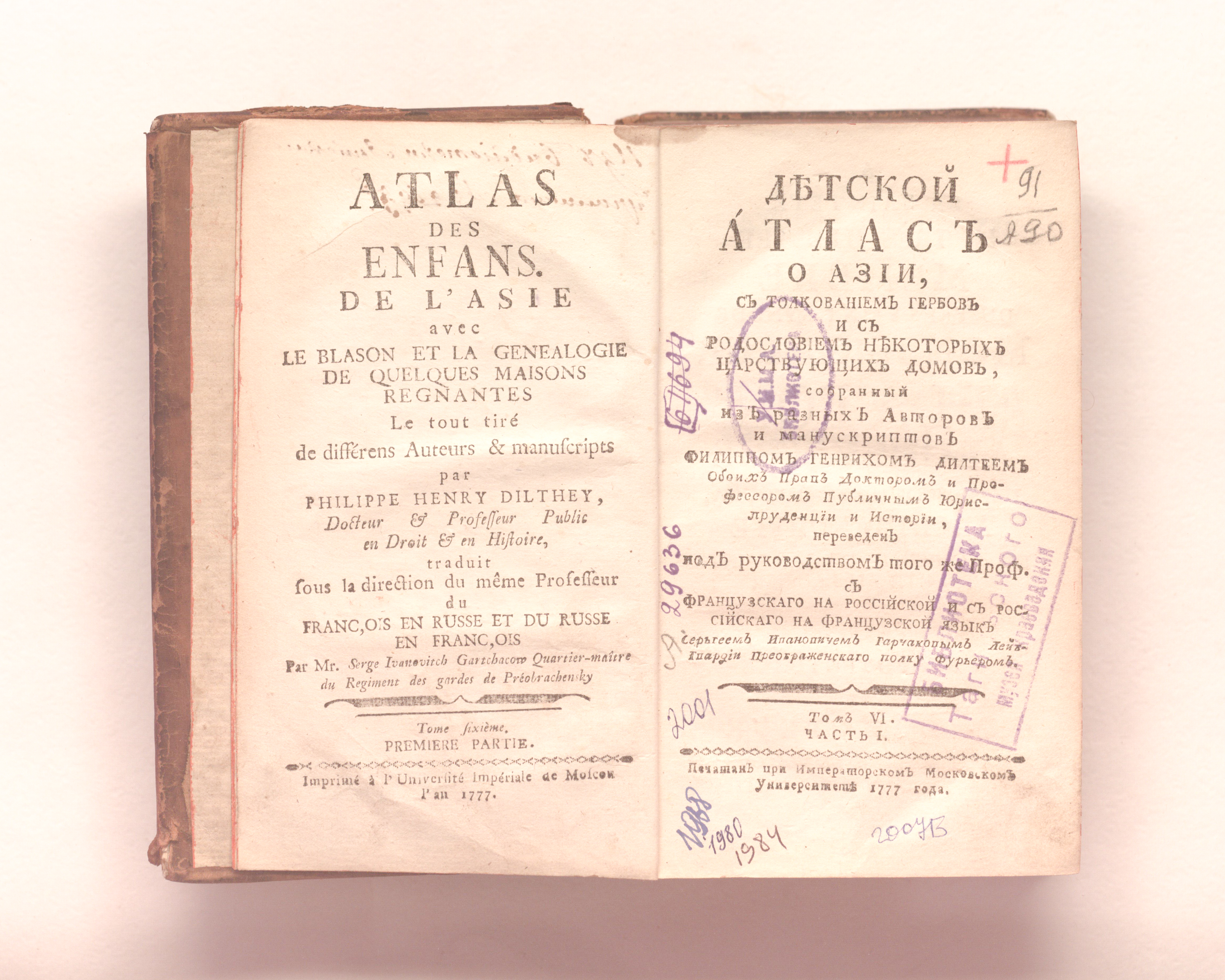 Дильтей, Филипп Генрих (1723-1781). Детской атлас, или Новой удобной и доказательной способ к учению географии / исправленной и умноженной Филиппом Генрихом Дилтеем, обоих прав доктором и профессором публичным юриспруденции и истории. — Москва : Печ. при Имп. Моск. Ун-те, 1777. — [16], 271, [9], 99, [9], 124 с. ; 17, 5х11 см.