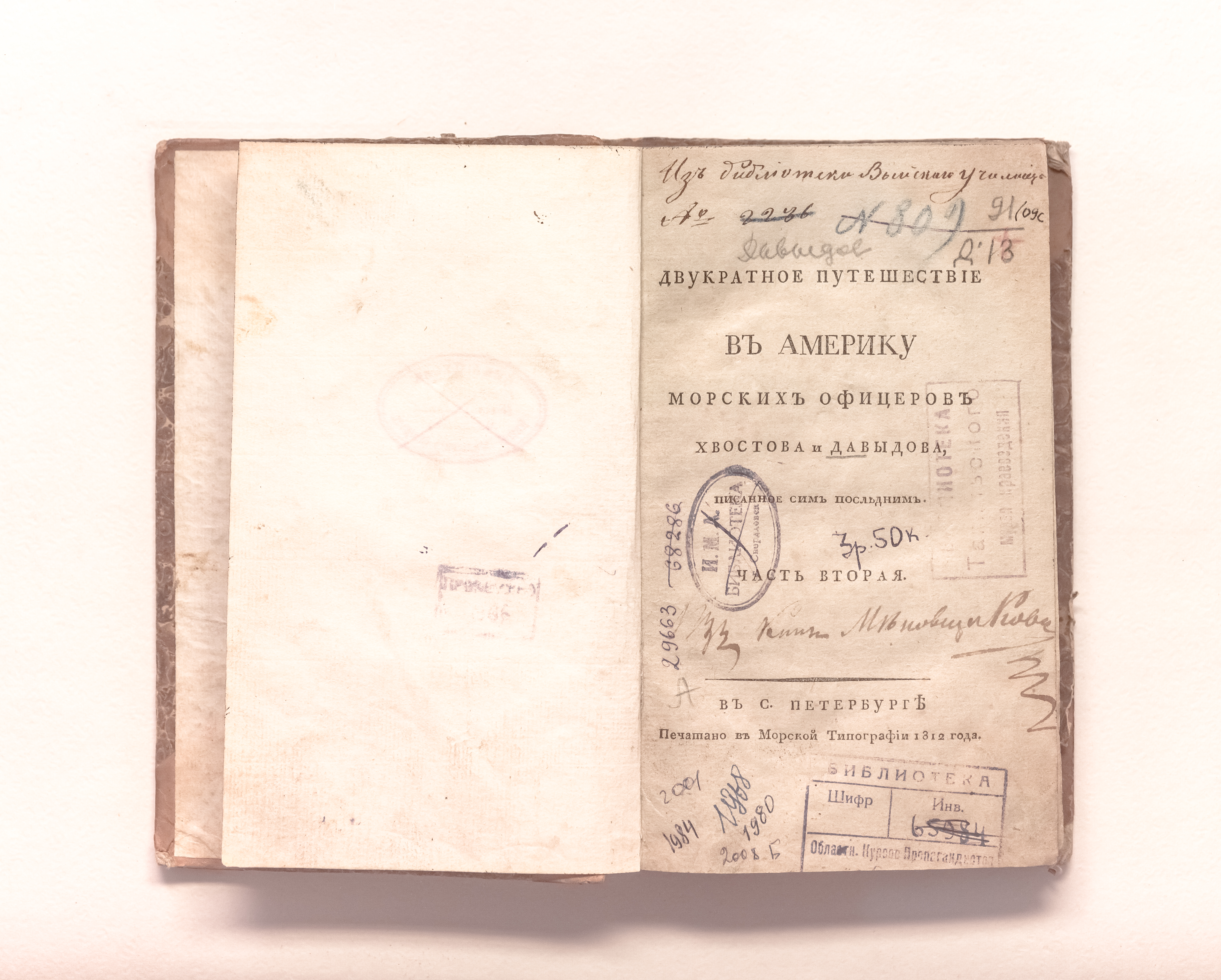 Давыдов, Гавриил Иванович (1784-1809). Двукратное путешествие в Америку морских офицеров Хвостова и Давыдова, писанное сим последним : в двух ч. / Г. И. Давыдов. – Санкт- Петербург : печатано в Морской типографии, Ч. 2. – 1812. – [1], 224. XXVIII с. ; 20х13 см.