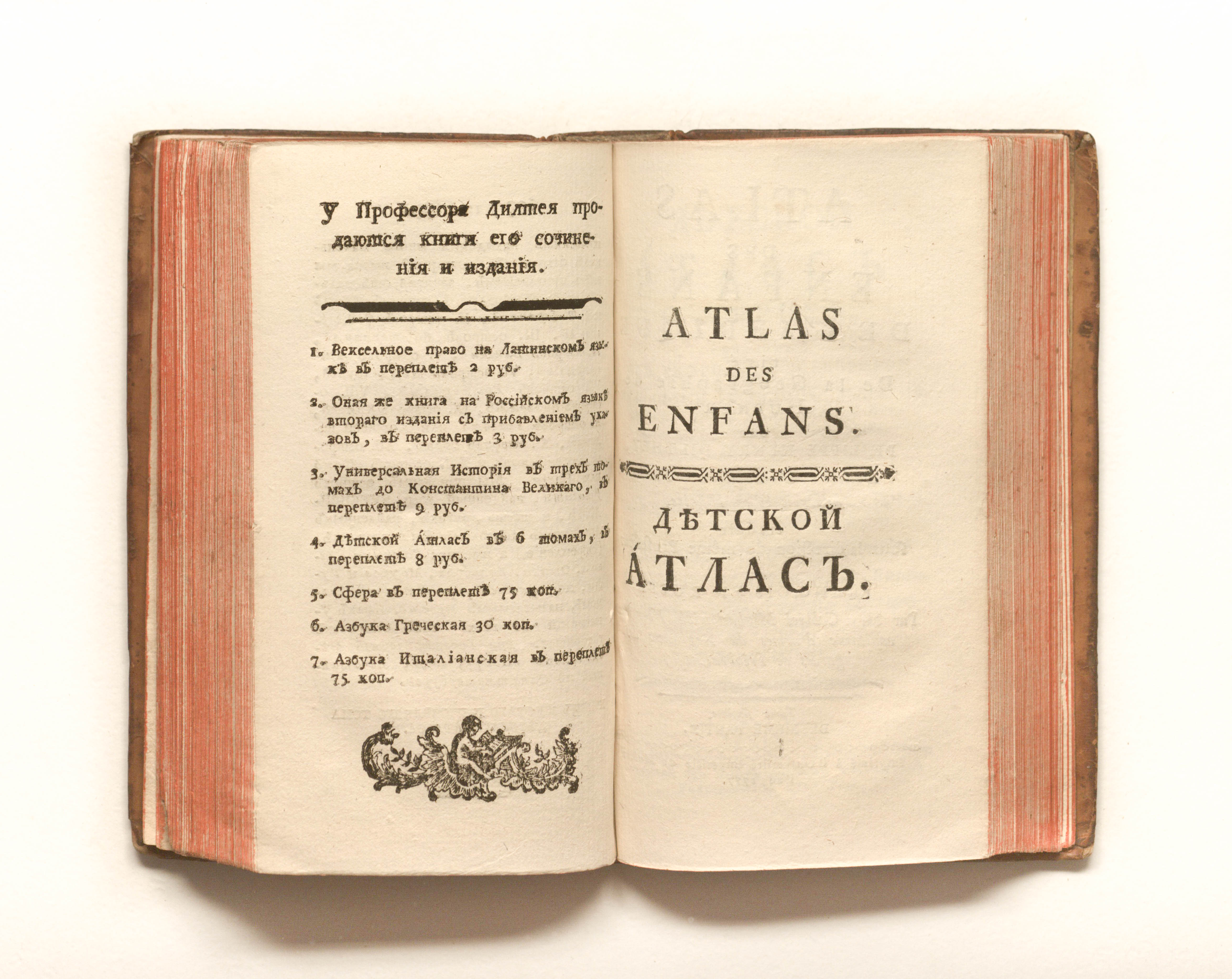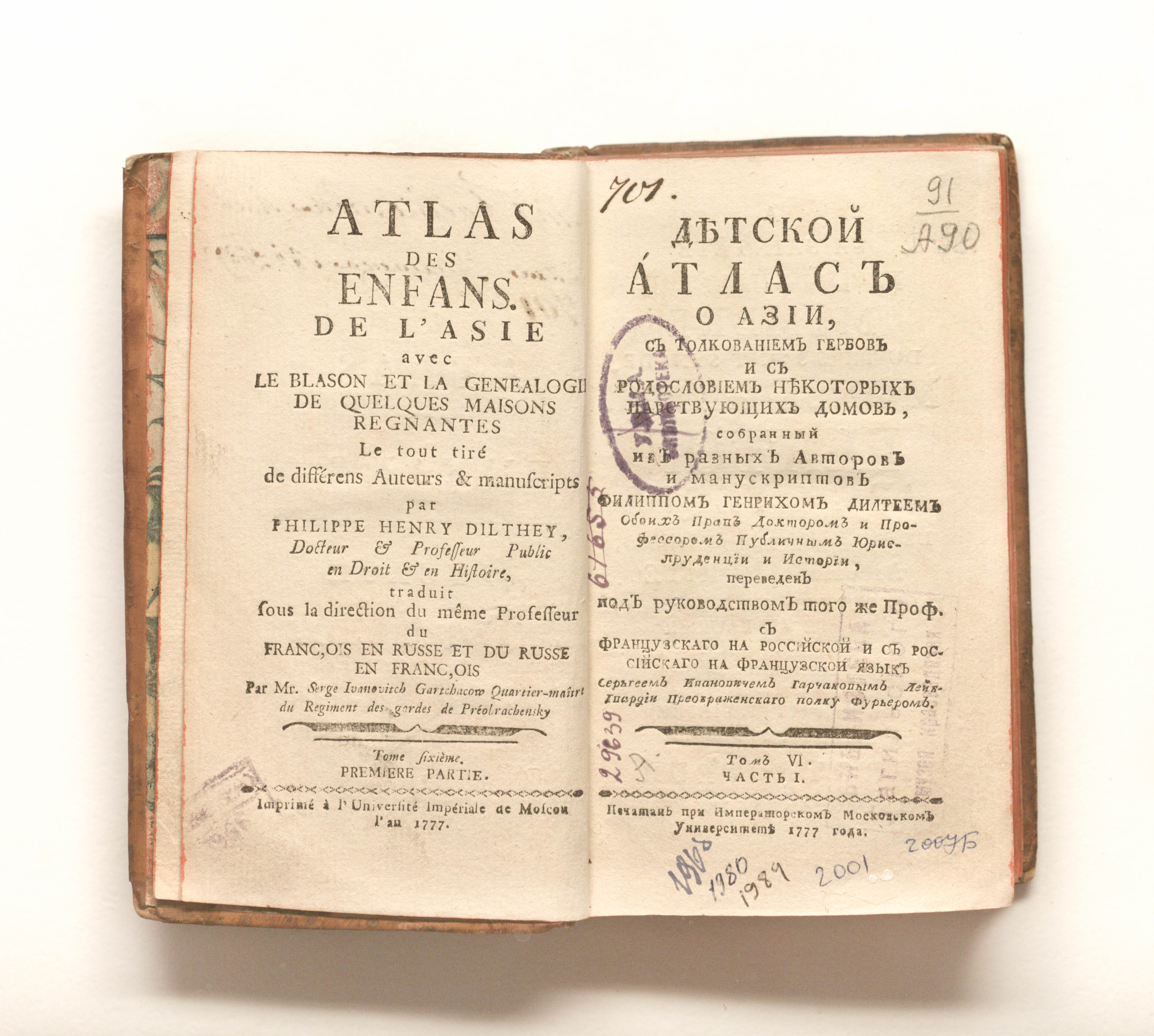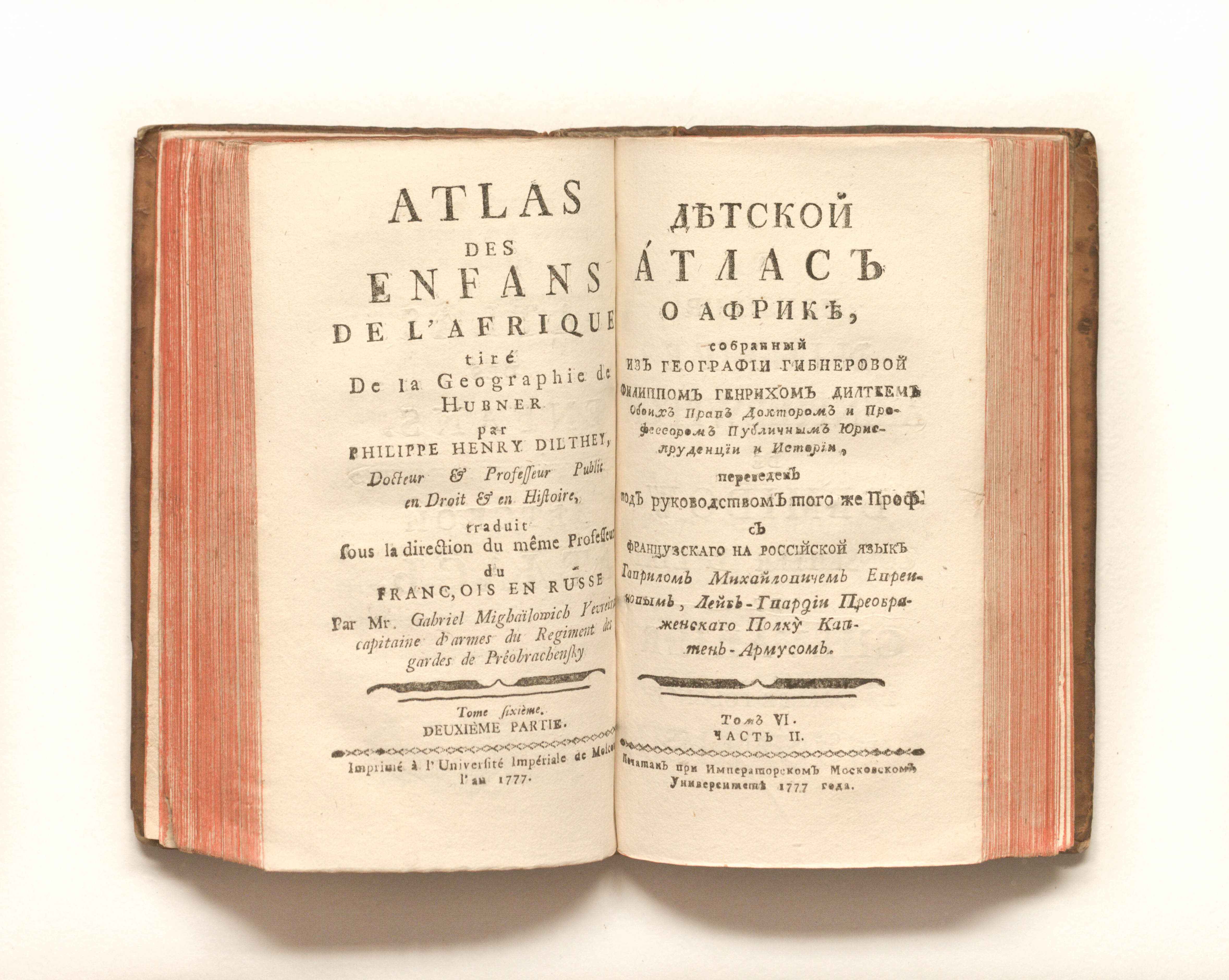 Дильтей, Филипп Генрих (1723-1781). Детской атлас, или Новой удобной и доказательной способ к учению географии / исправленной и умноженной Филиппом Генрихом Дилтеем, обоих прав доктором и профессором публичным юриспруденции и истории. — Москва : Печ. при Имп. Моск. Ун-те, 1777. — [16],123, [9], 99, [1] с. ; 17, 5х11 см.