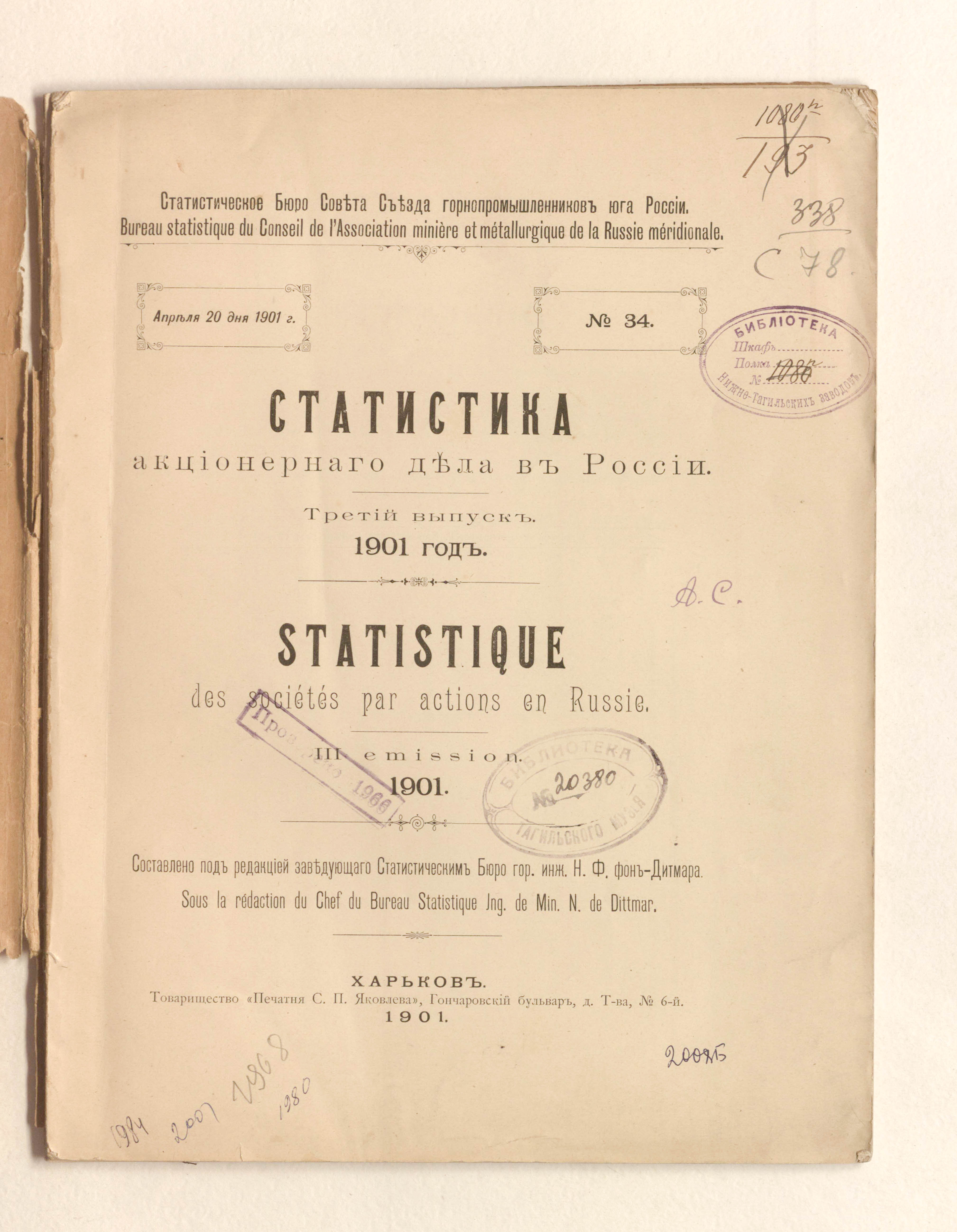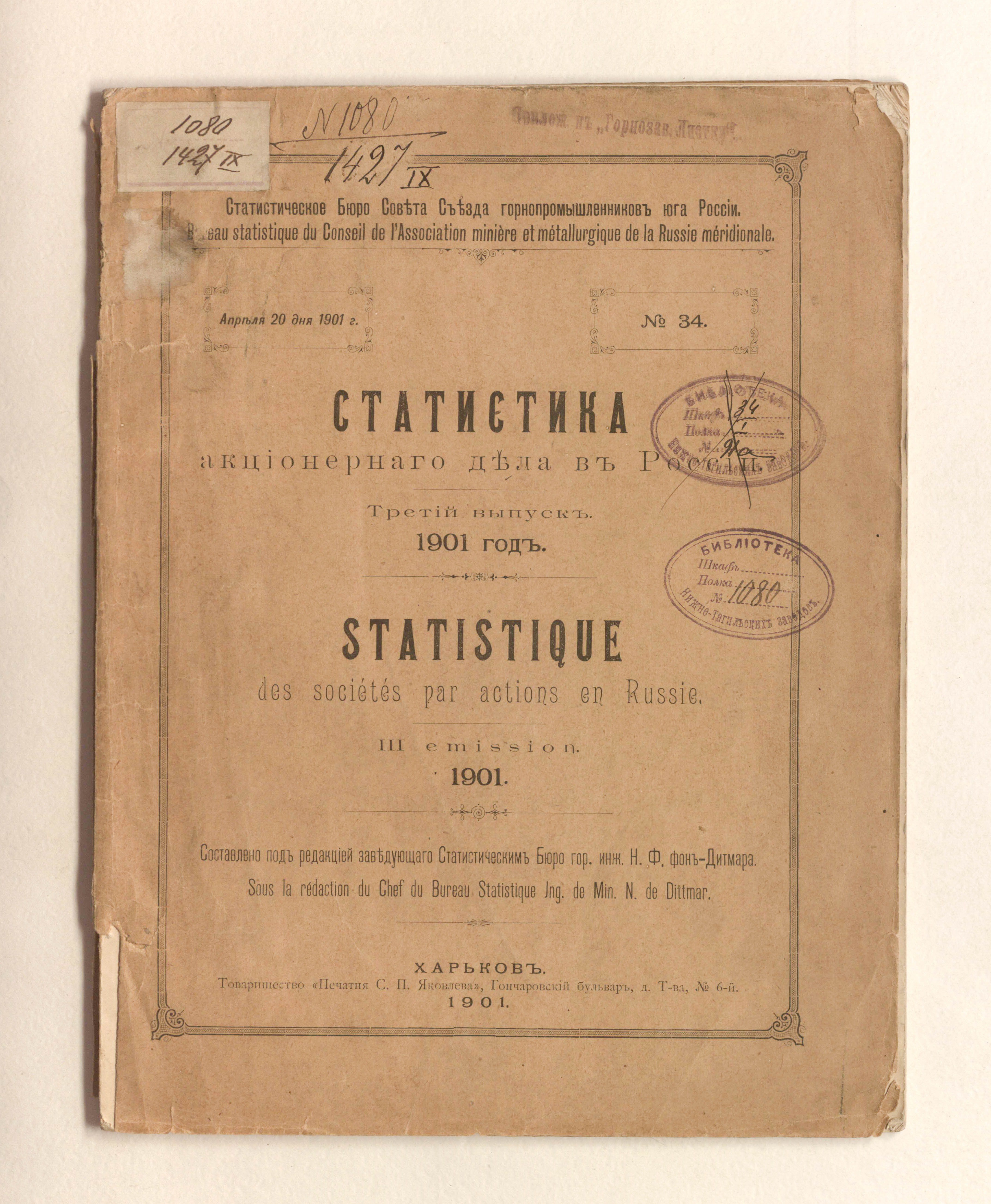 Статистика акционерного дела в России = Statistique des sociétés paŗ actioņs eņ ŗussie / Статистическое бюро Совета Съезда горнопромышленников юга России ; составлено под редакцией Н. фон-Дитмар (1865-1919). — Харьков : Товарищество Печатня С. П. Яковлева, 1900 — 1901. Вып. 3. — 1901. — 81 с. : табл. ; 28х22 см.