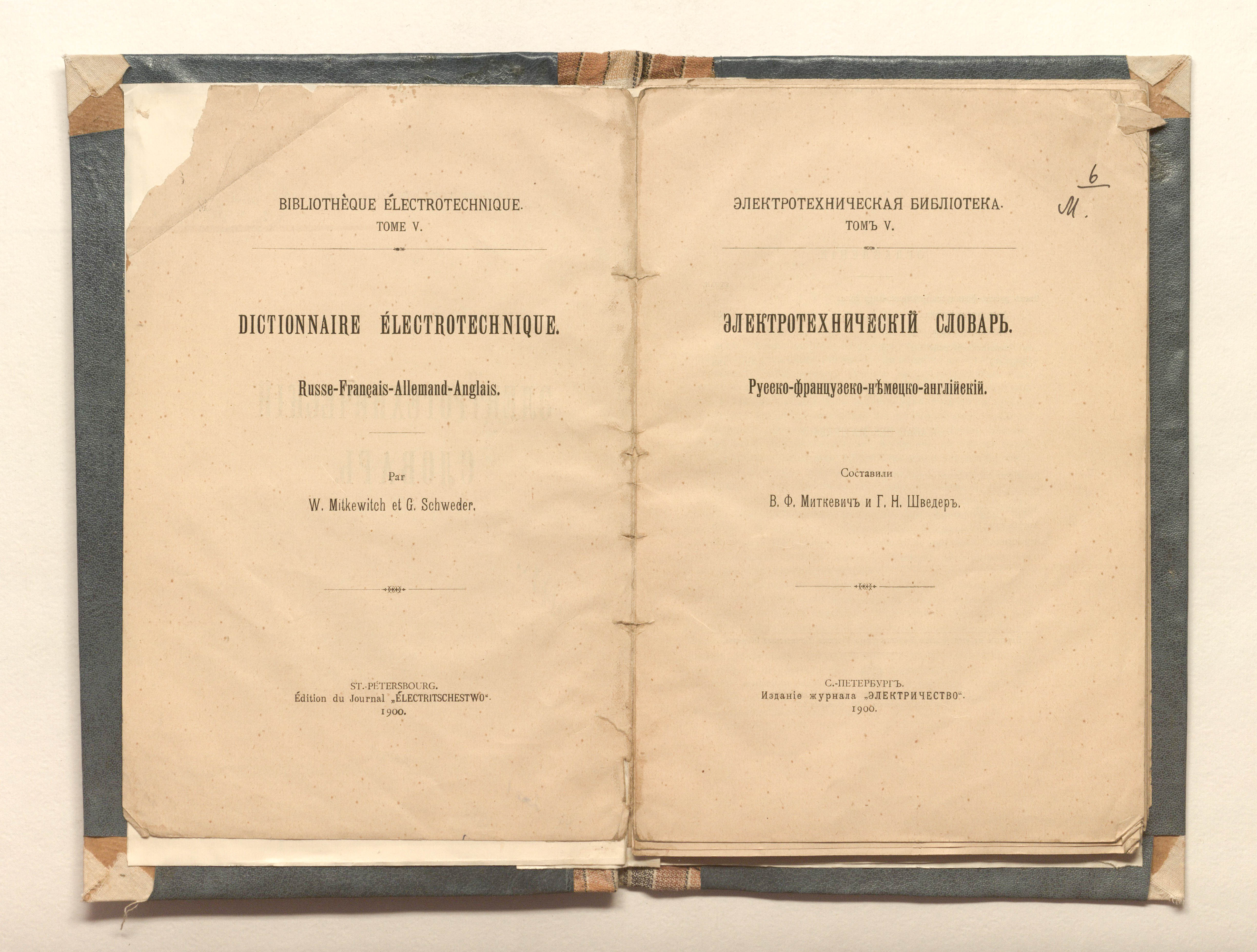 Электротехнический словарь : русско-французско-немецко-английский / сост.: В. Ф. Миткевич, Г. Н. Шведер. — Санкт-Петербург : Издание журнала "Электричество", 1900. — [8], 94 с. — (Электротехническая библиотека ; т. V). ; 27х18 см.