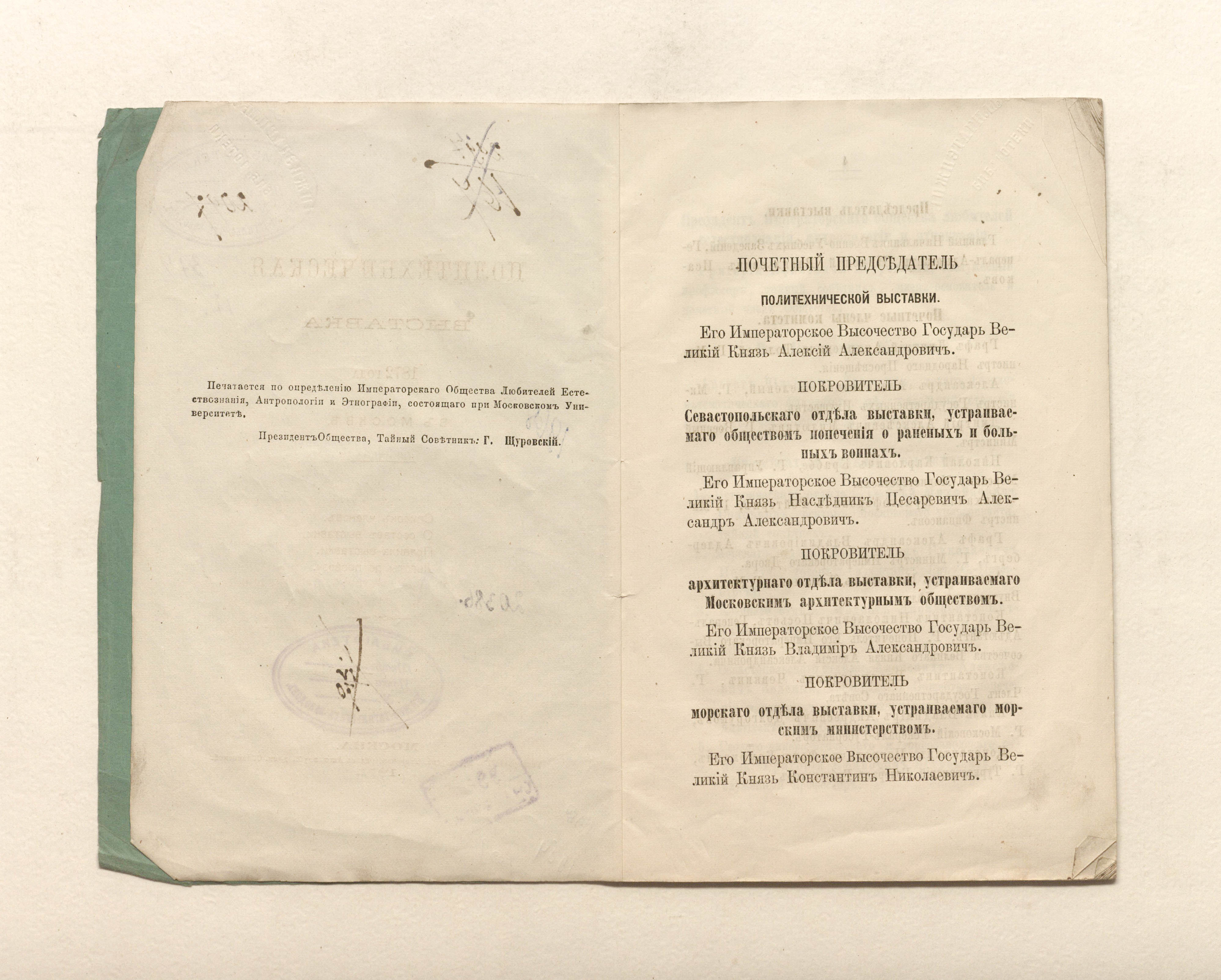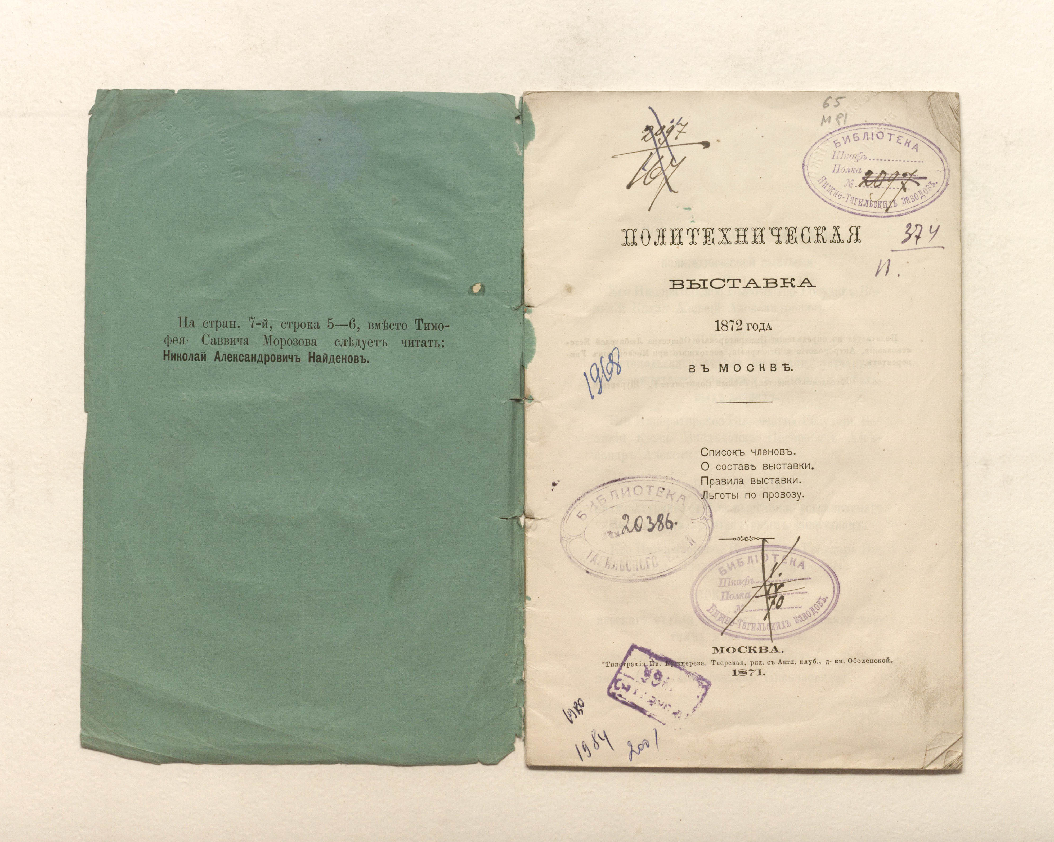 Политехническая выставка 1872 года в Москве : список членов. О составе Выставки. Правила Выставки. Льготы по провозу / Московская политехническая выставка. — Москва : тип. Ив. Кушнерева, 1871. — 46 с. ; 21,5х13,5 см.
