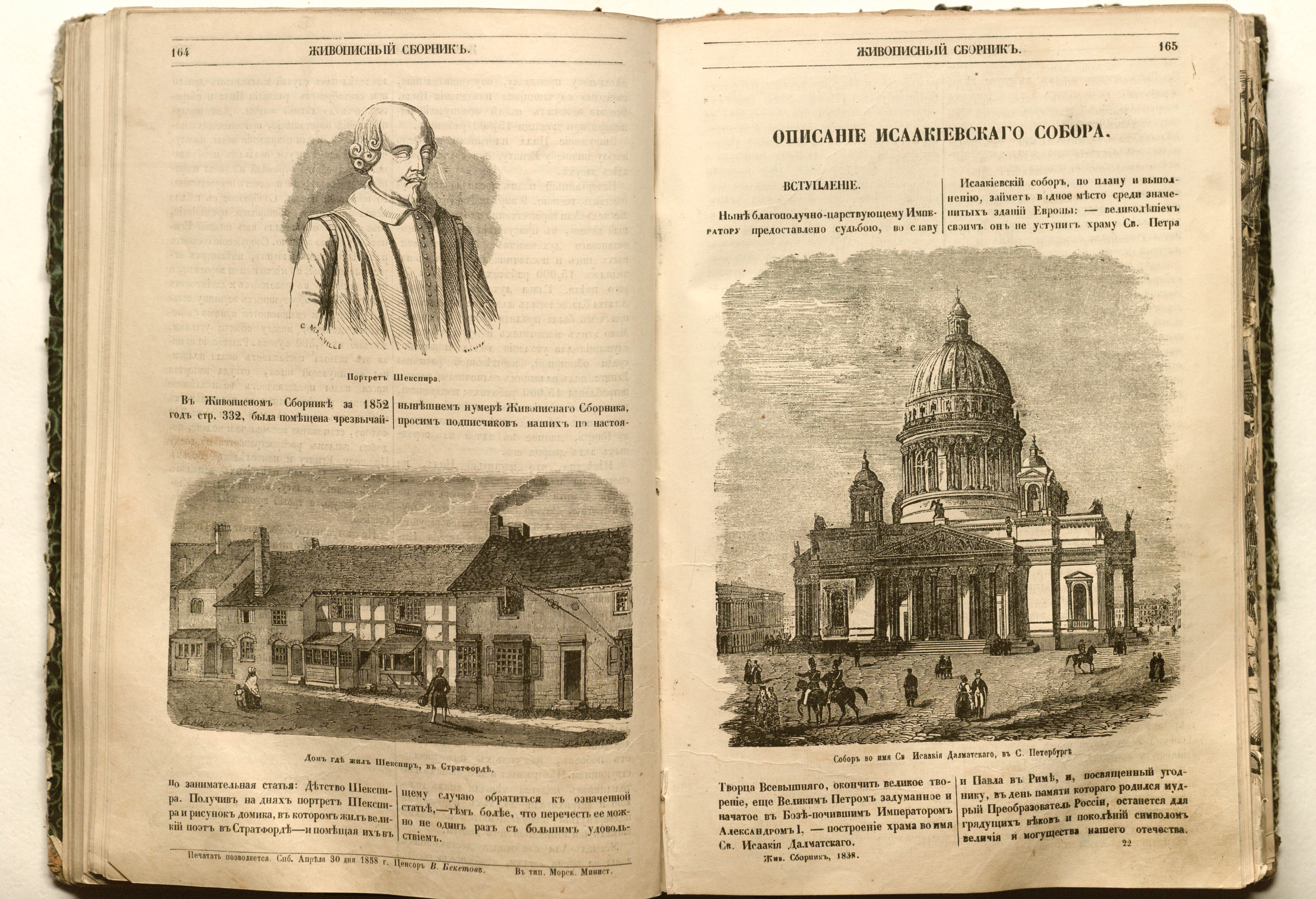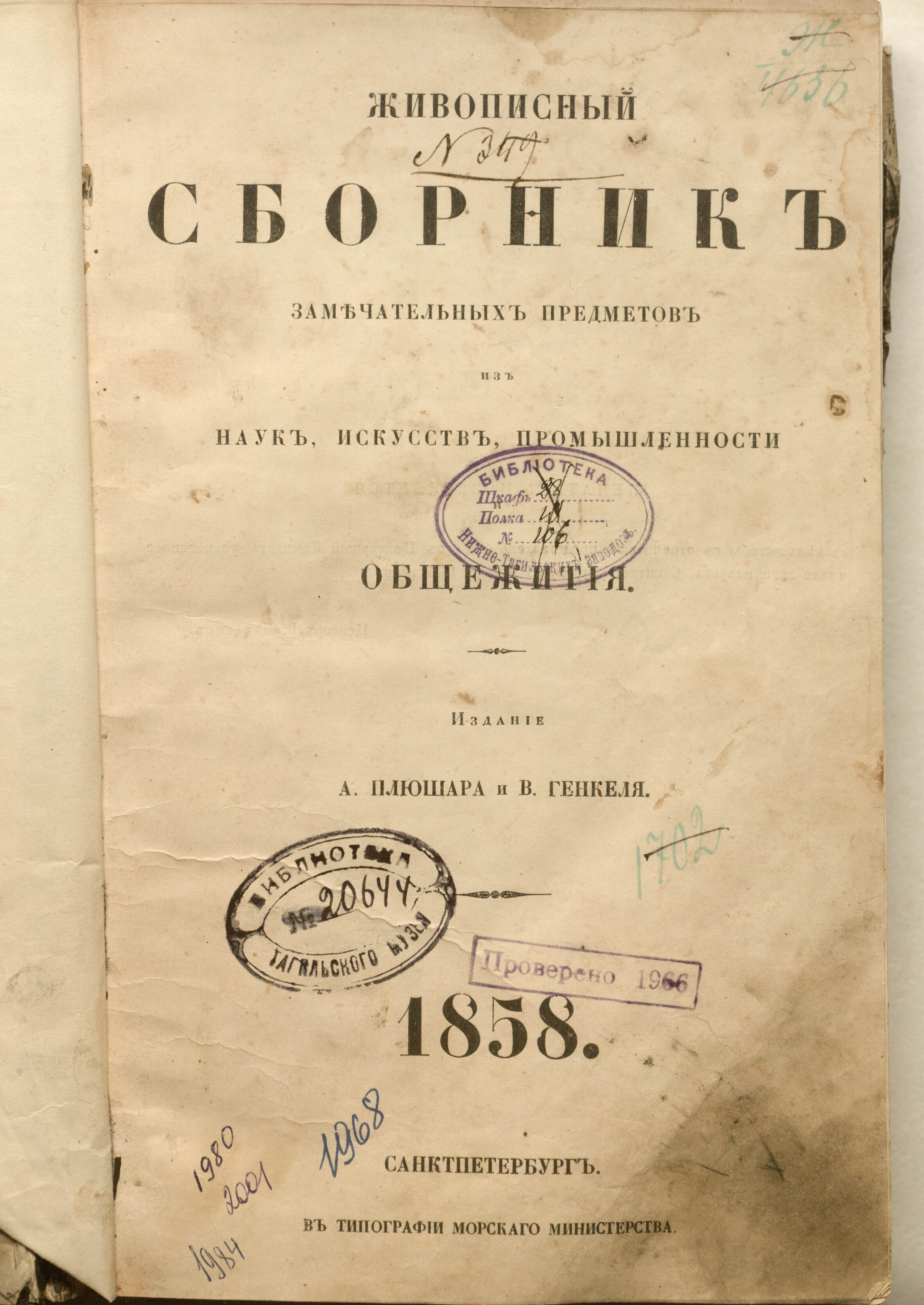 Живописный сборник замечательных предметов из наук, искусств, промышленности и общежития. Т. 5 / издание А. Плюшара и В. Генкеля. — Санкт-Петербург : тип. морского министерства, 1858. — 480 с. : ил. ; 27,5х18 см.