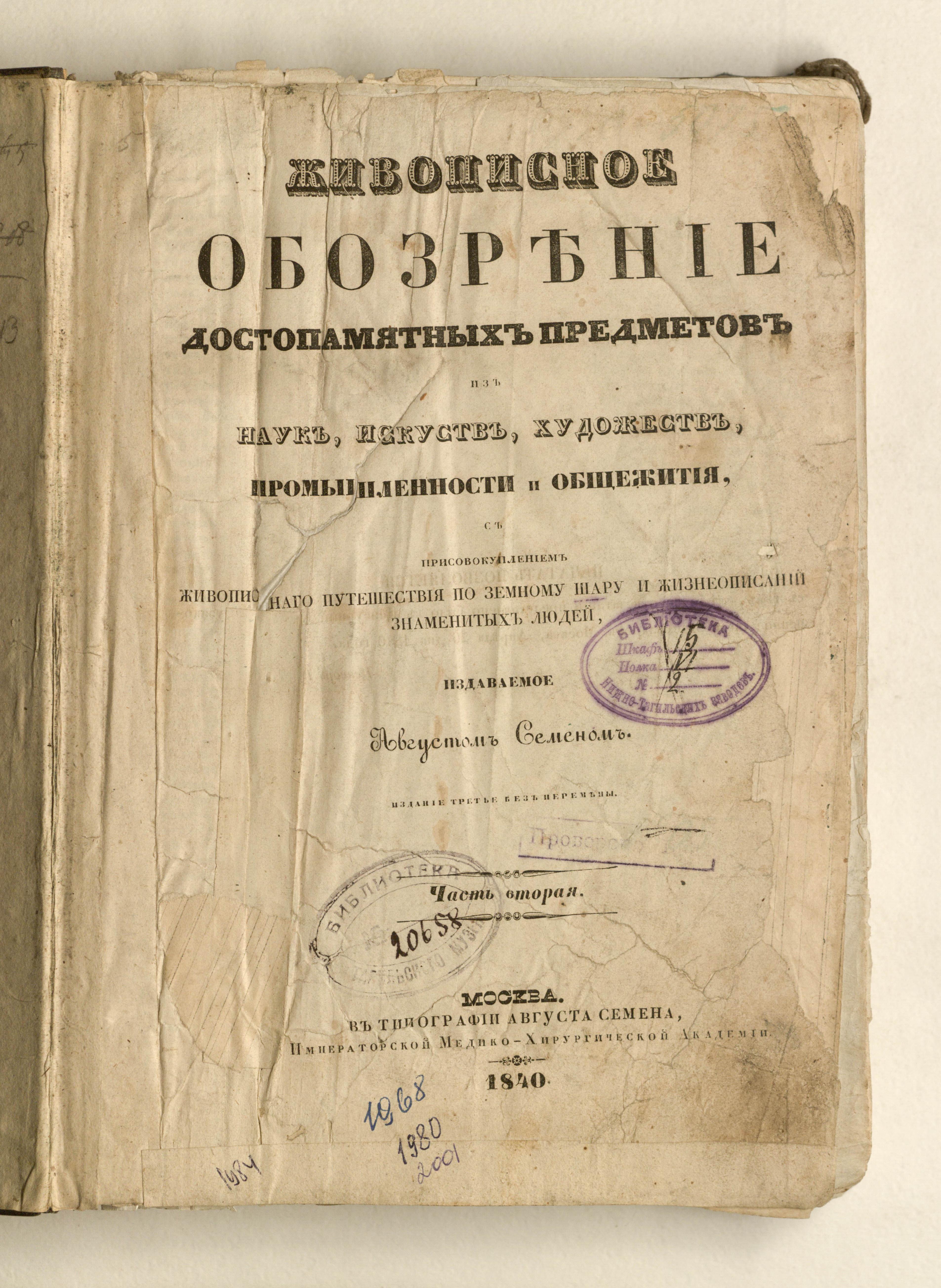 Живописное обозрение достопамятных предметов из наук, искусств, художеств, промышленности и общежития с присовокуплением живописного путешествия по земному шару и живописания знаменитых людей, издаваемое Августом Семеном : [ежегодный сборник] : [в 9 т.]. — Москва : в типографии Августа Семена, 1835 - 1844.