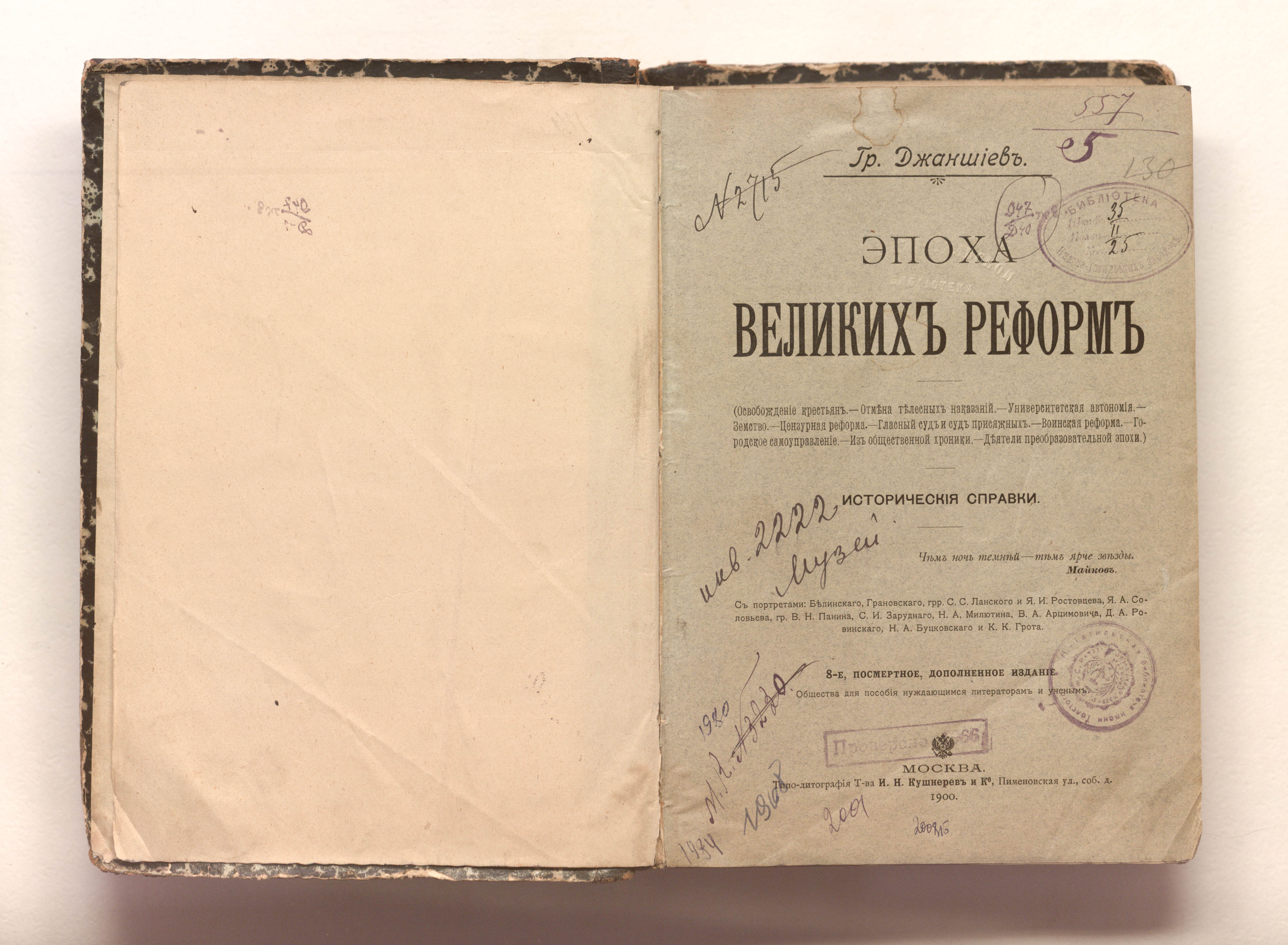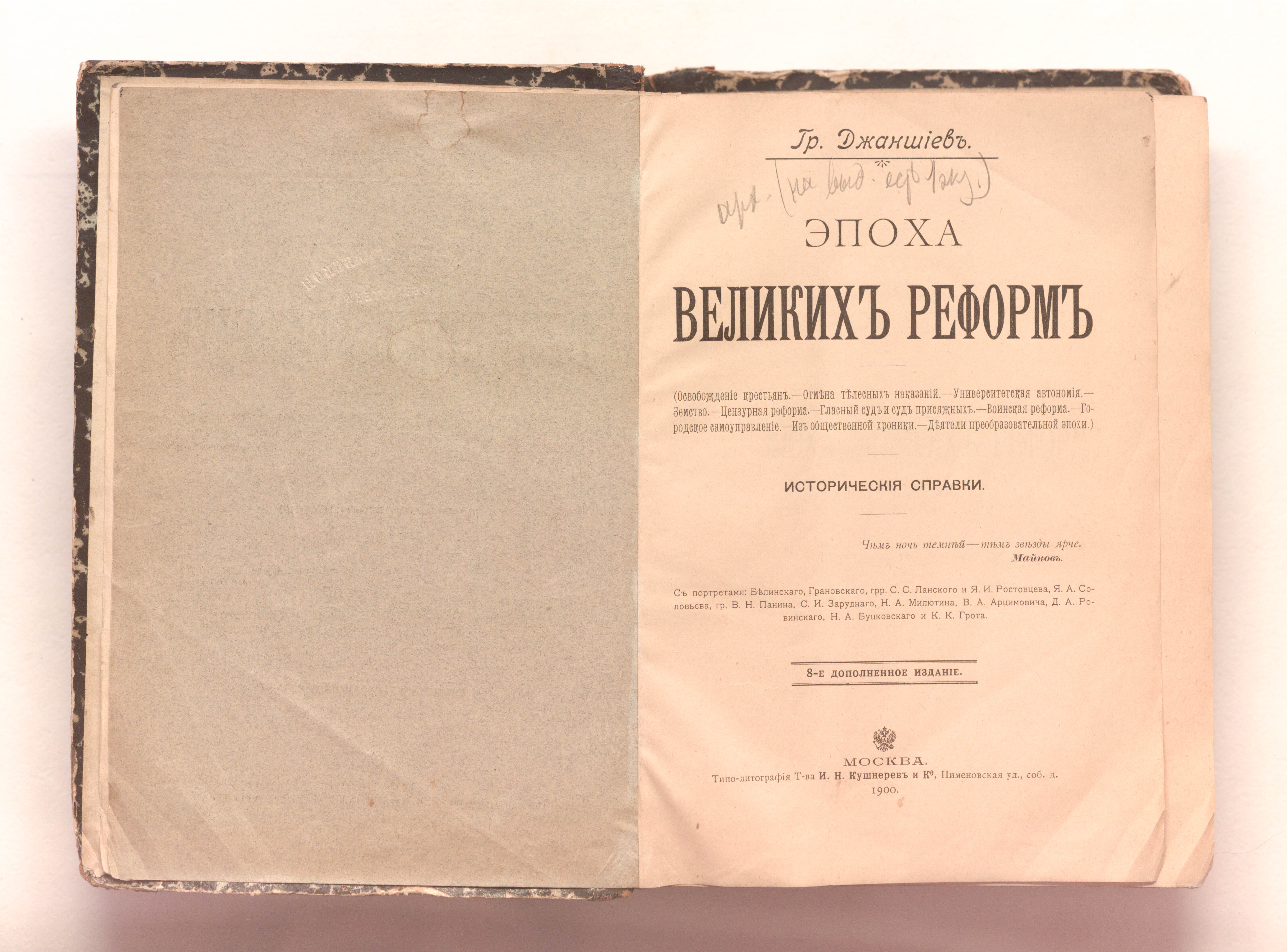 Эпоха великих реформ : исторические справки / Г. А. Джаншиев. — 8-е посмертное, доп. изд. — Москва : типо-лит. т-ва И. Н. Кушнарев и К, 1900. — LXII, [2], 820, VIII с. : портр. ; 24х17 см.