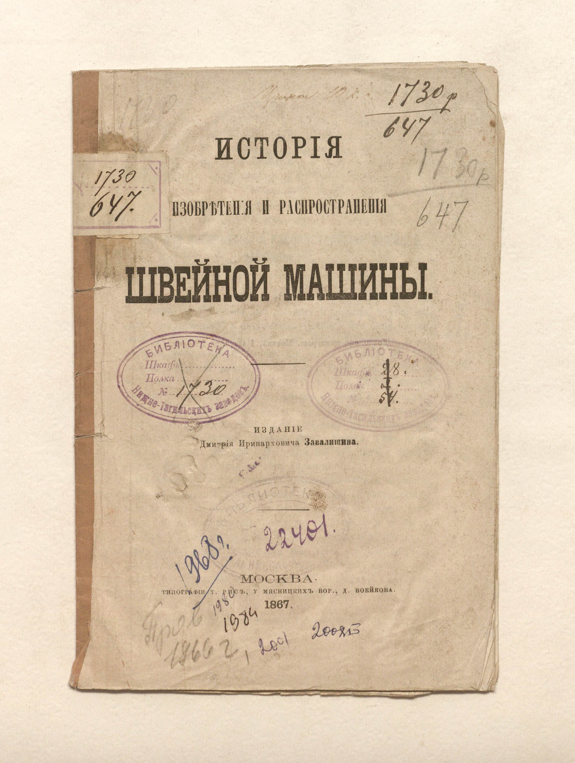 История изобретения и распространения швейной машины / Д. И. Завалишин. — Москва : тип. Т. Рис, 1867. — 39 с. ;20х13,5 см.