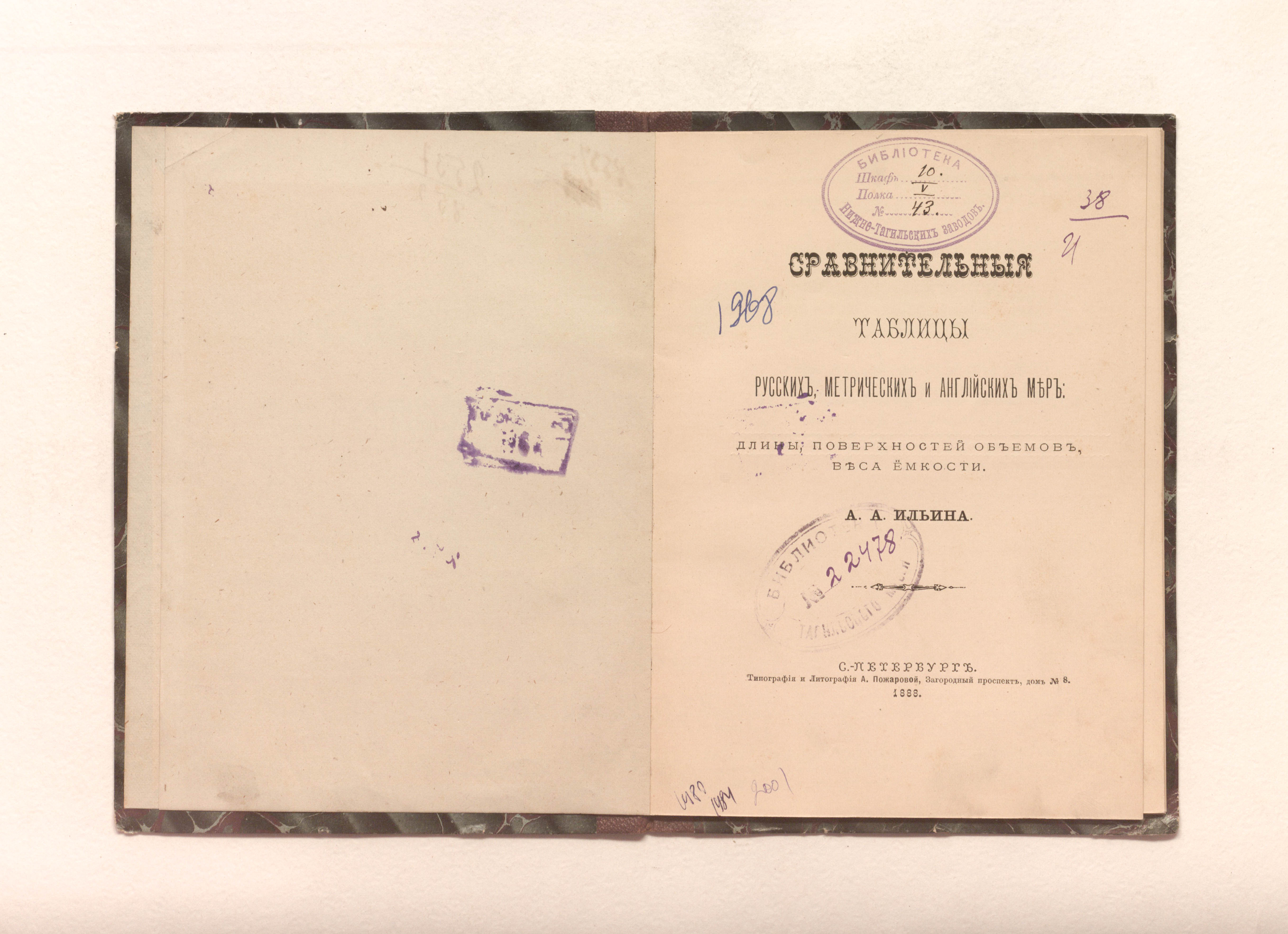 Ильин, Аркадий Александрович (1848-). Сравнительные таблицы русских, метрических и английских мер: длины, поверхностей, объемов, веса, емкости / [Соч.] А. А. Ильина. — Санкт-Петербург : тип. и лит. А. Пожаровой, 1888. — 23 с. ; 19х14 см.