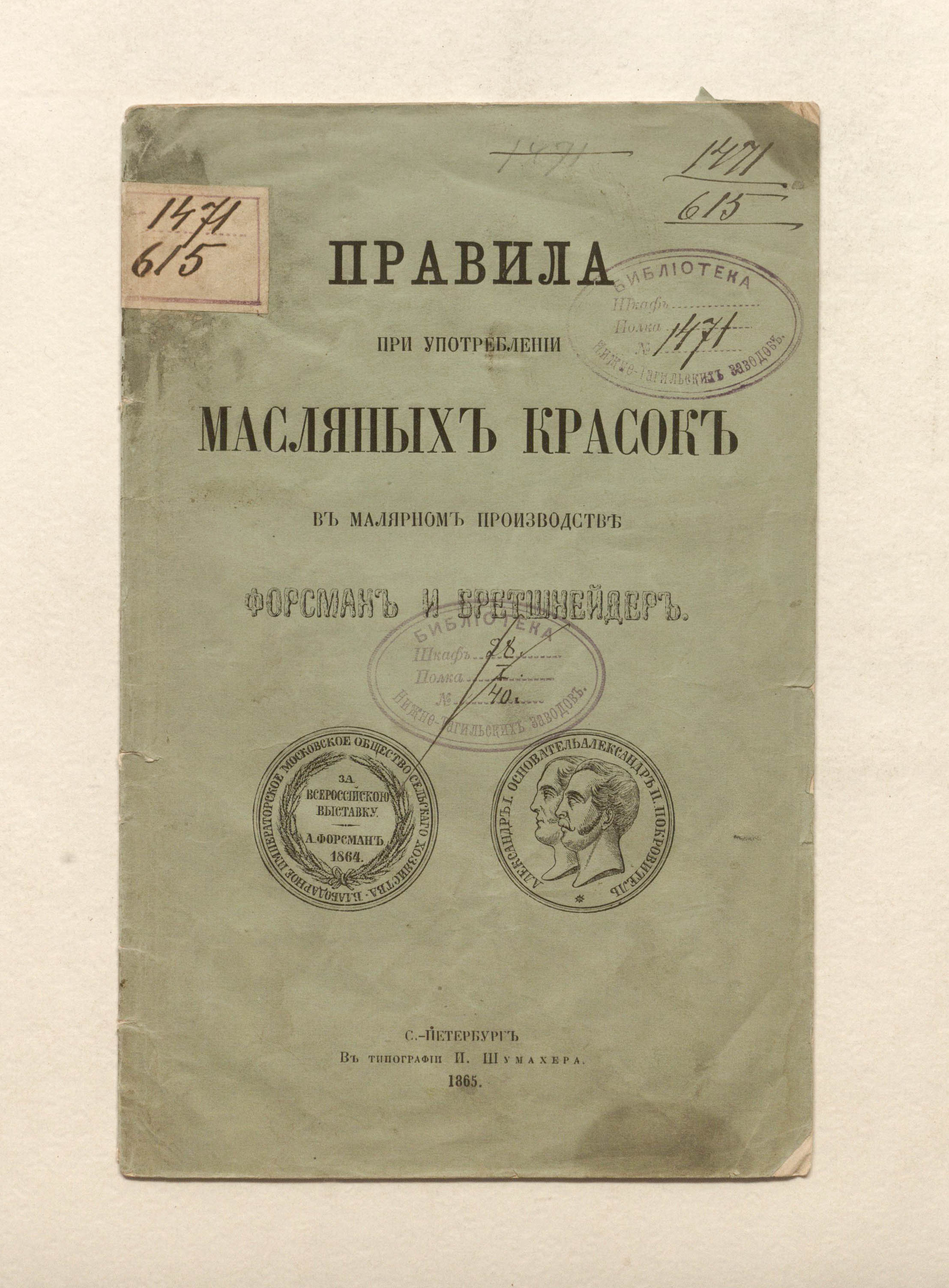 Правила при употреблении масляных красок в малярном производстве / Л. Форсман, Бретшнейдер. — Санкт-Петербург : в тип. И. Шумахера, 1865. — 16 с. ; 20,7х13,5 см.