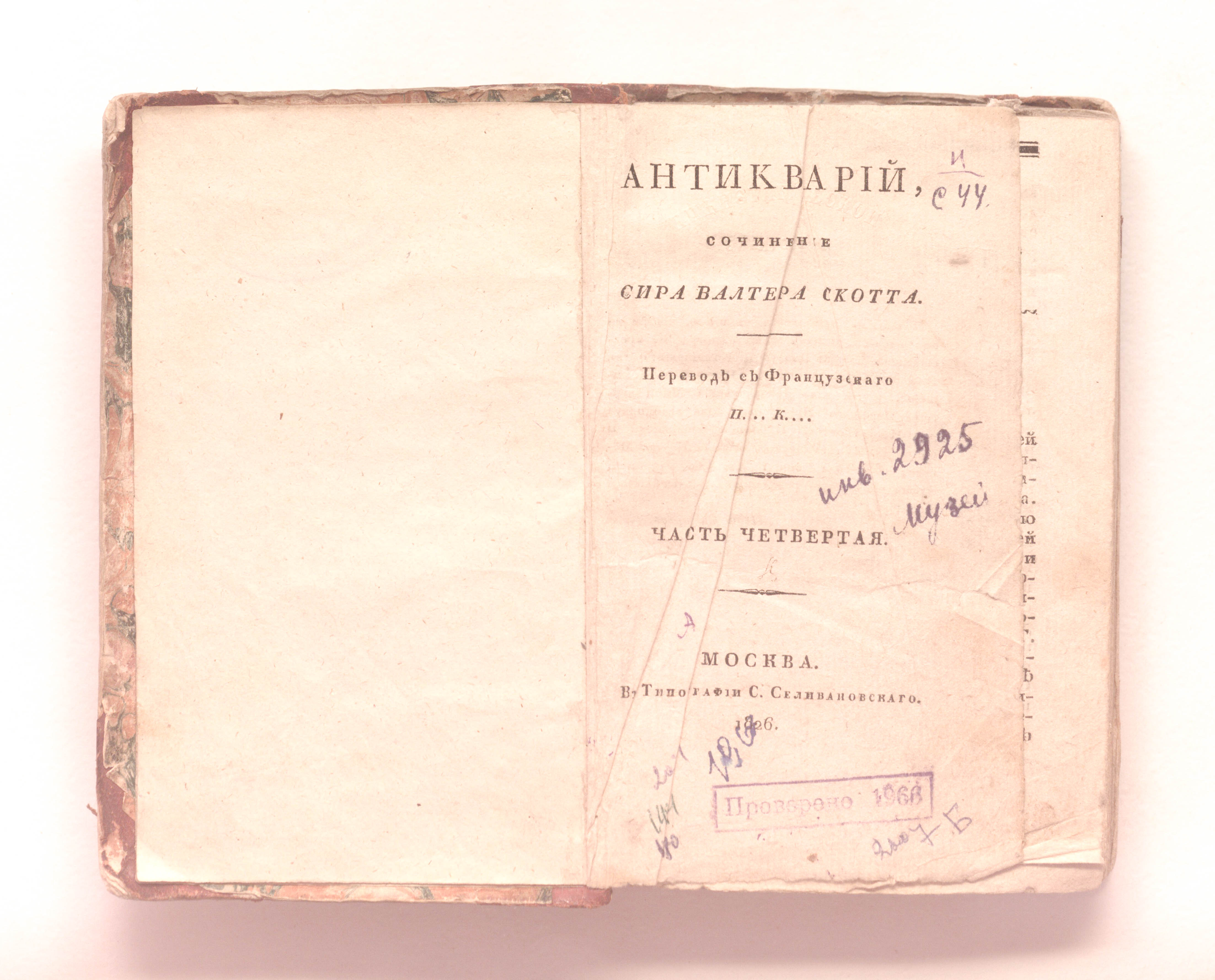 Антикварий. Ч. 4 / сочинение сира Валтера Скотта ; перевод с французскаго П... К.. — Москва : в типографии С. Селивановскаго, 1826. — [2], 5-252 с. ; 17,5х11,5 см.