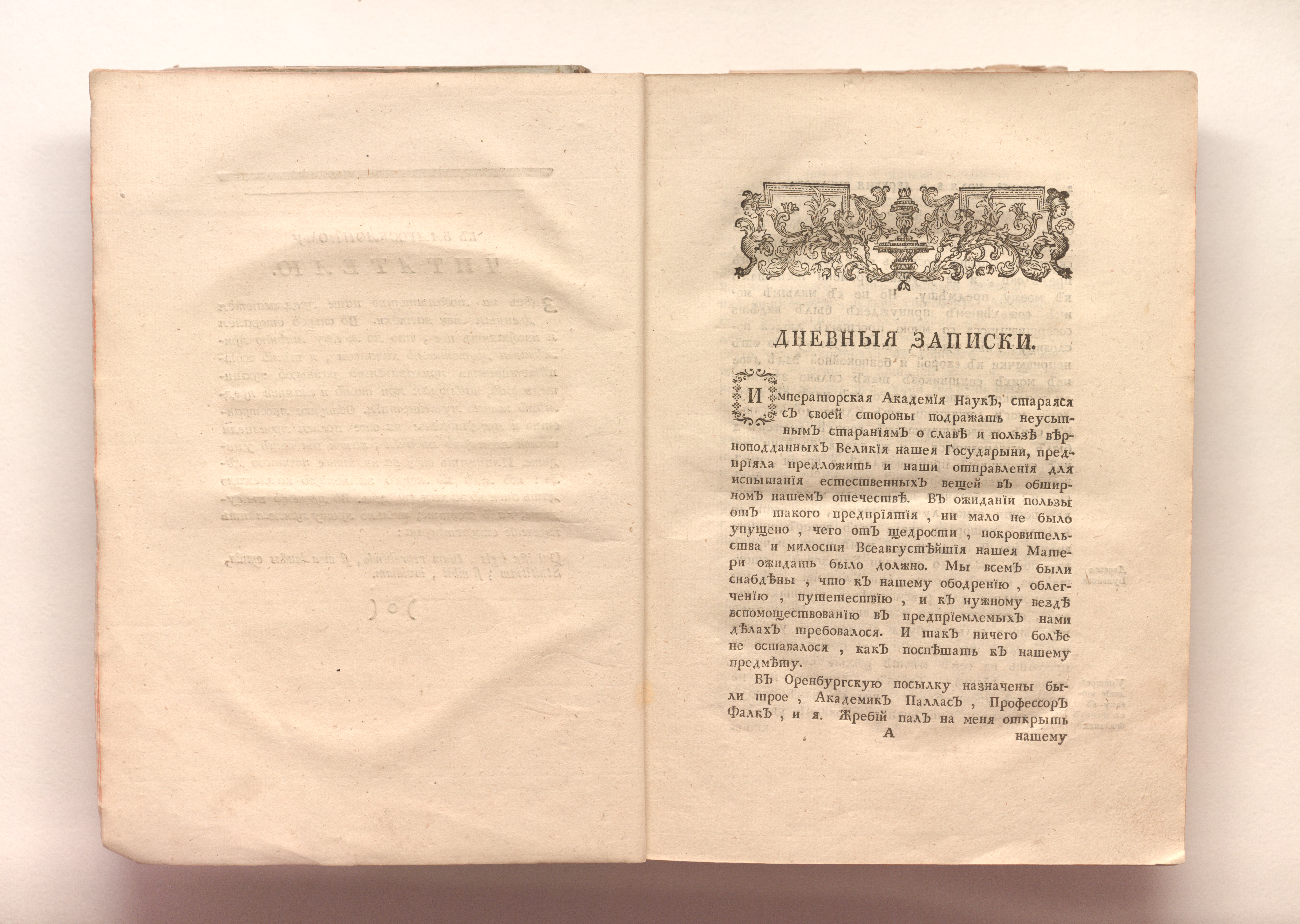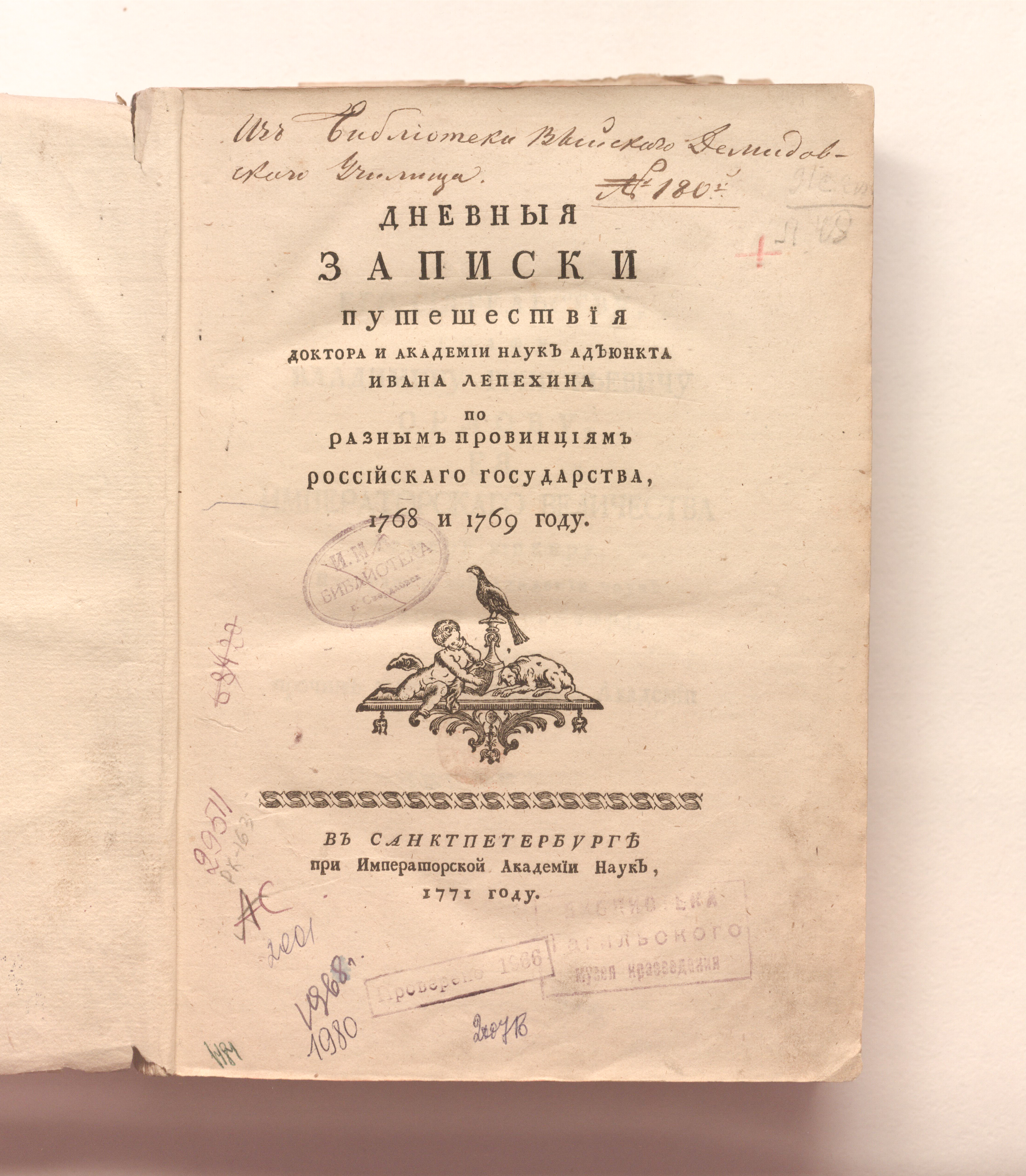 Лепехин, Иван Иванович (1740-1802). Дневныя записки путешествия доктора и Академии наук адъюнкта Ивана Лепехина по разным провинциям Российского государства, 1768 и 1769 году / И. И. Лепехин. – Санкт-Петербург : Императорская Академия Наук, 1771. – [4], 537, [3] : 4 л. ил. ; 25,5х19 см.