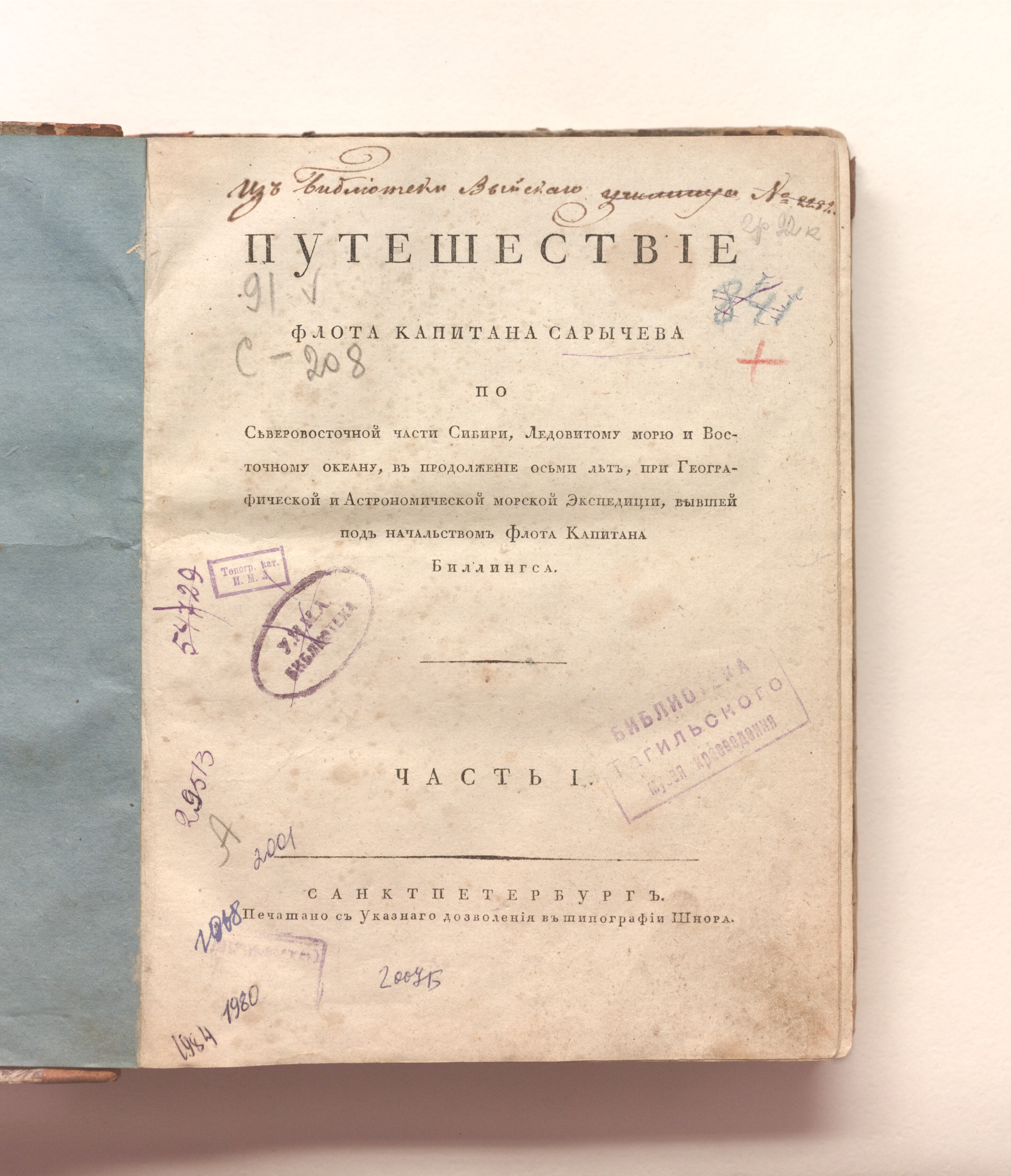 Сарычев, Гавриил Андреевич (1763-1831). Путешествие флота капитана Сарычева по Северовосточной части Сибири, Ледовитому морю и Восточному Океану, в продолжение осьми лет, при Географической и Астрономической морской Экспедиции, бывшей под начальством флота капитана Биллингса / Г. А. Сарычев. – Санкт-Петербург : печатано с указного дозволения в типографии Шнора, [1802]. – Ч. 1, 2. – 187, 192, [2] с. ; 24,5х20 см.