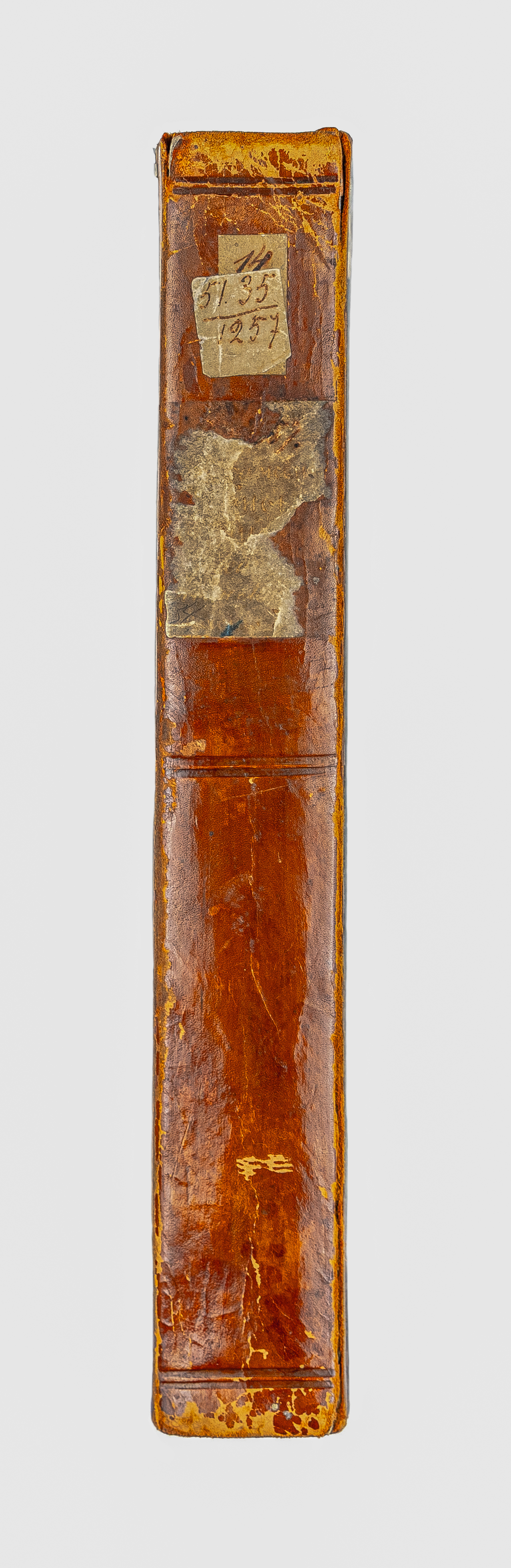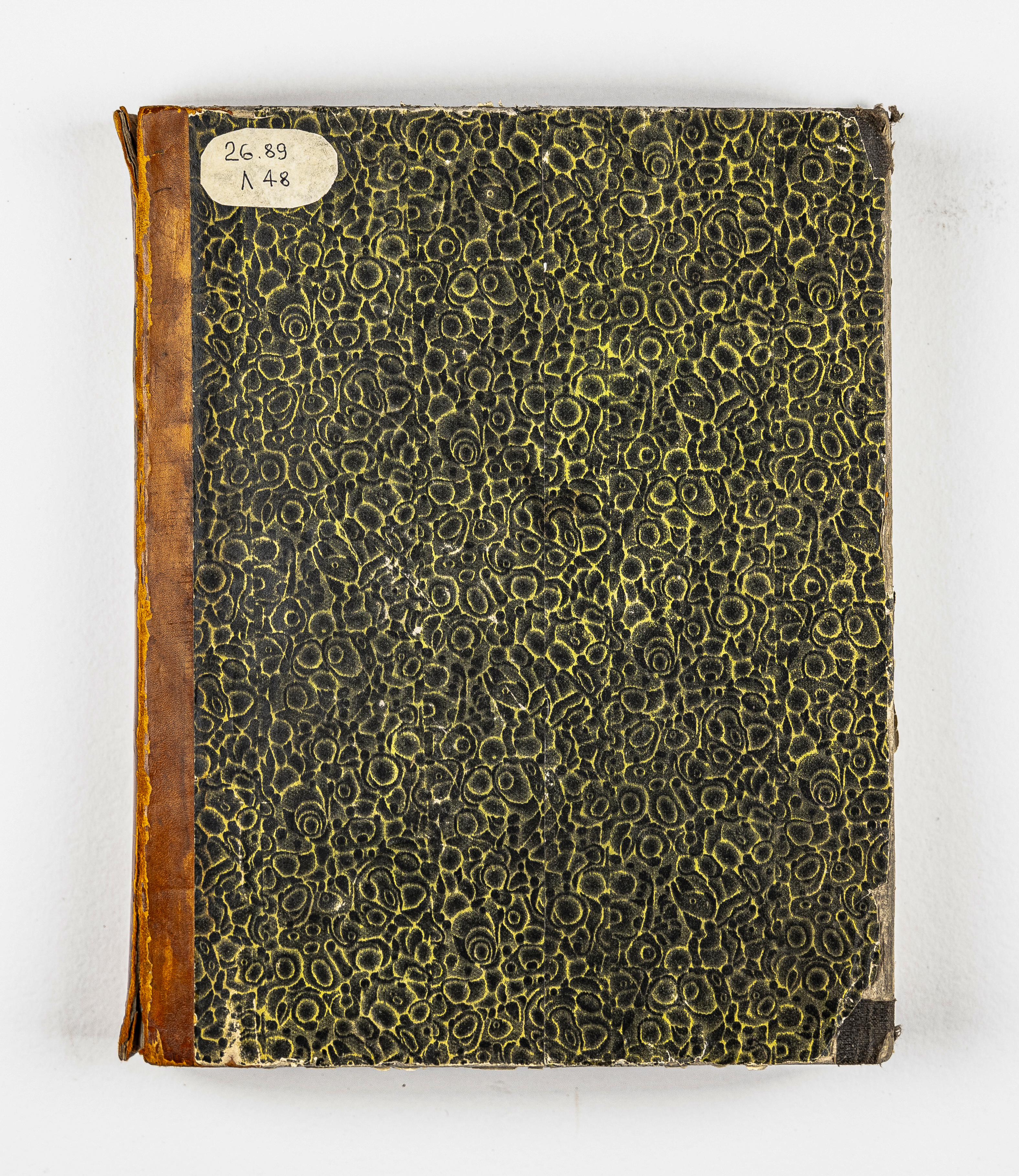 Книга в полукожаном владельческом переплете. Крышки переплета обтянуты бумагой с рисунком «под мрамор». Бумага верже.