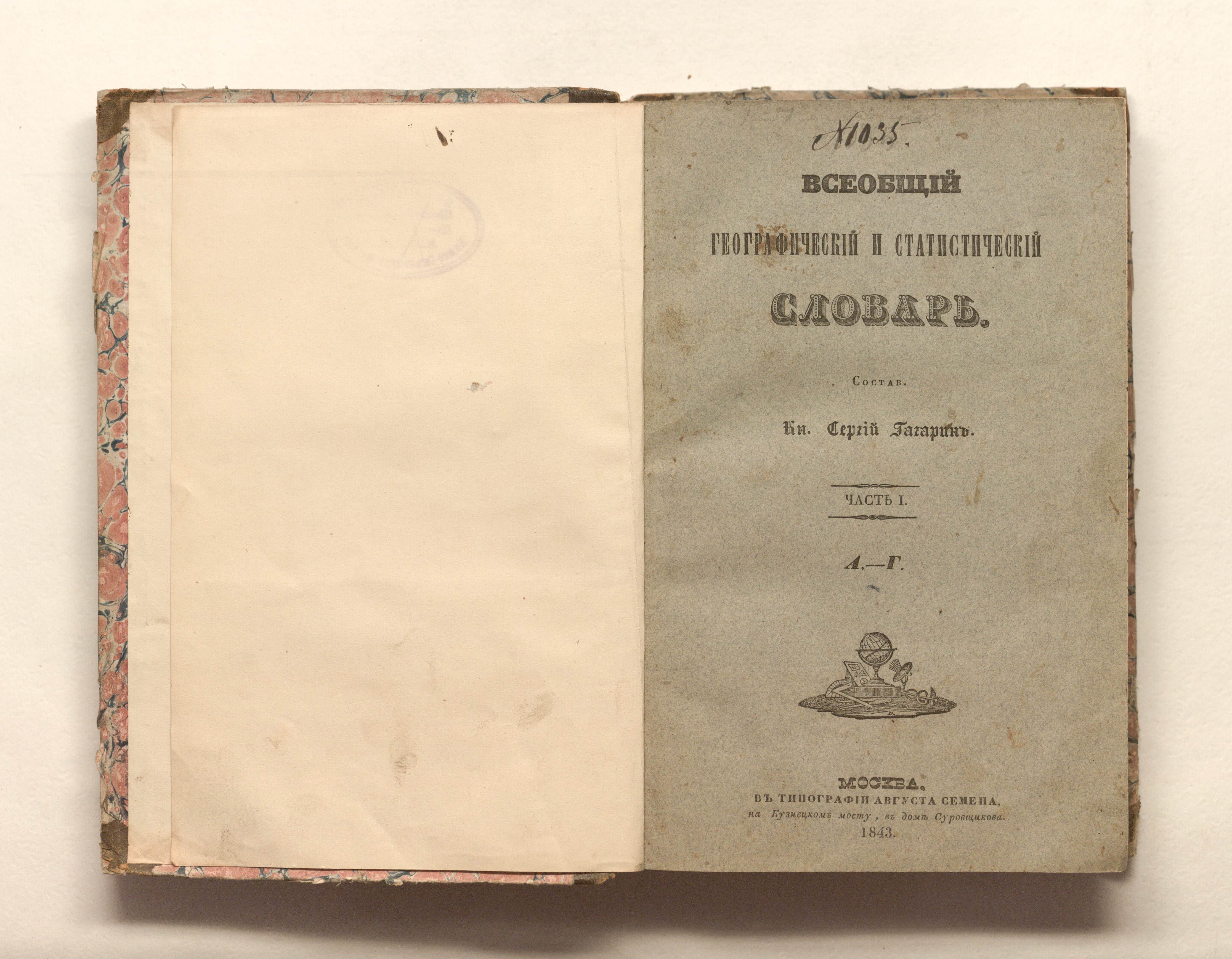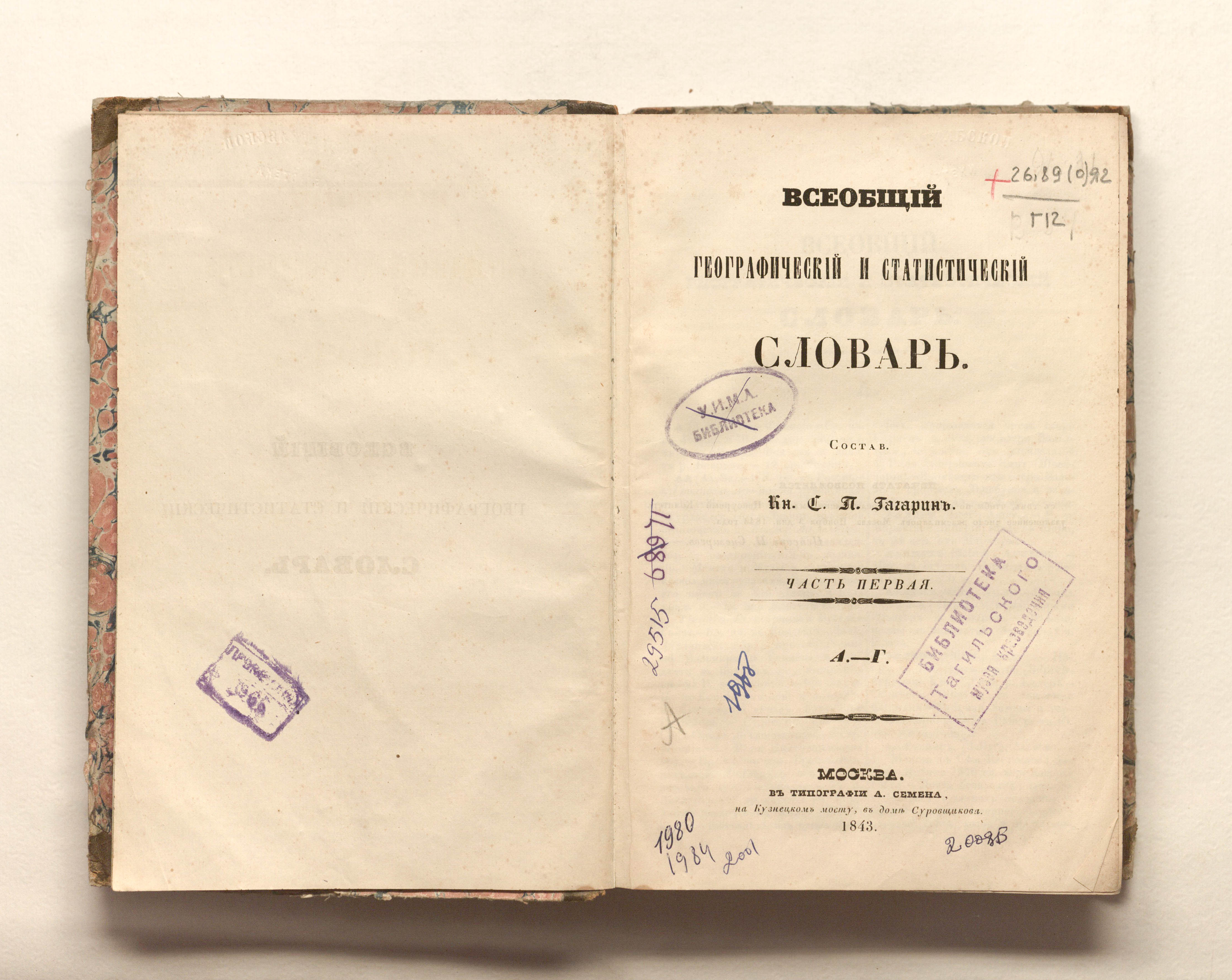 Гагарин, Сергей Петрович. Всеобщий географический и статистический словарь. Ч. 1. А-Г / С. П. Гагарин. — Москва : тип. А. Семена, 1843. — 558 с. ; 23х15,5 см.