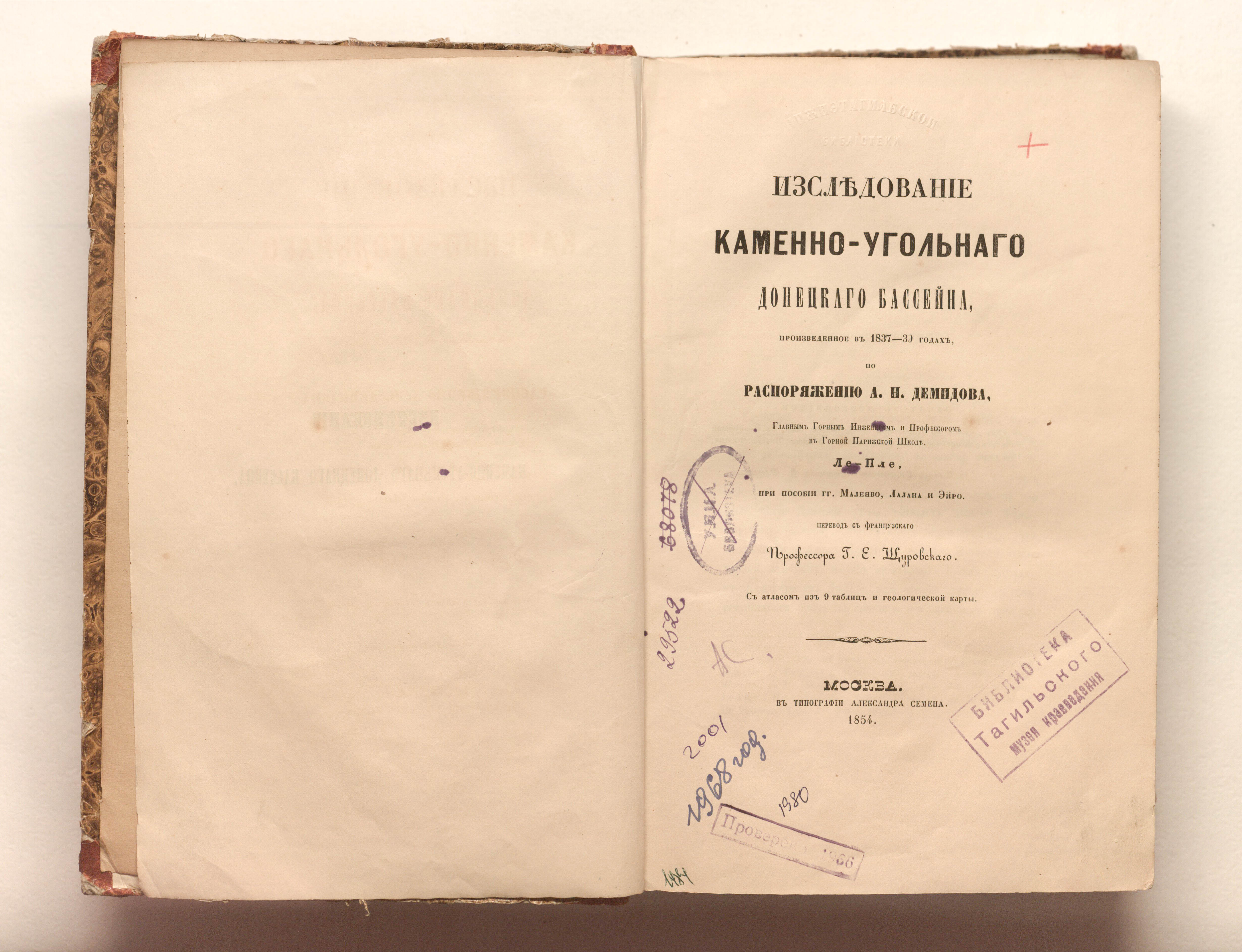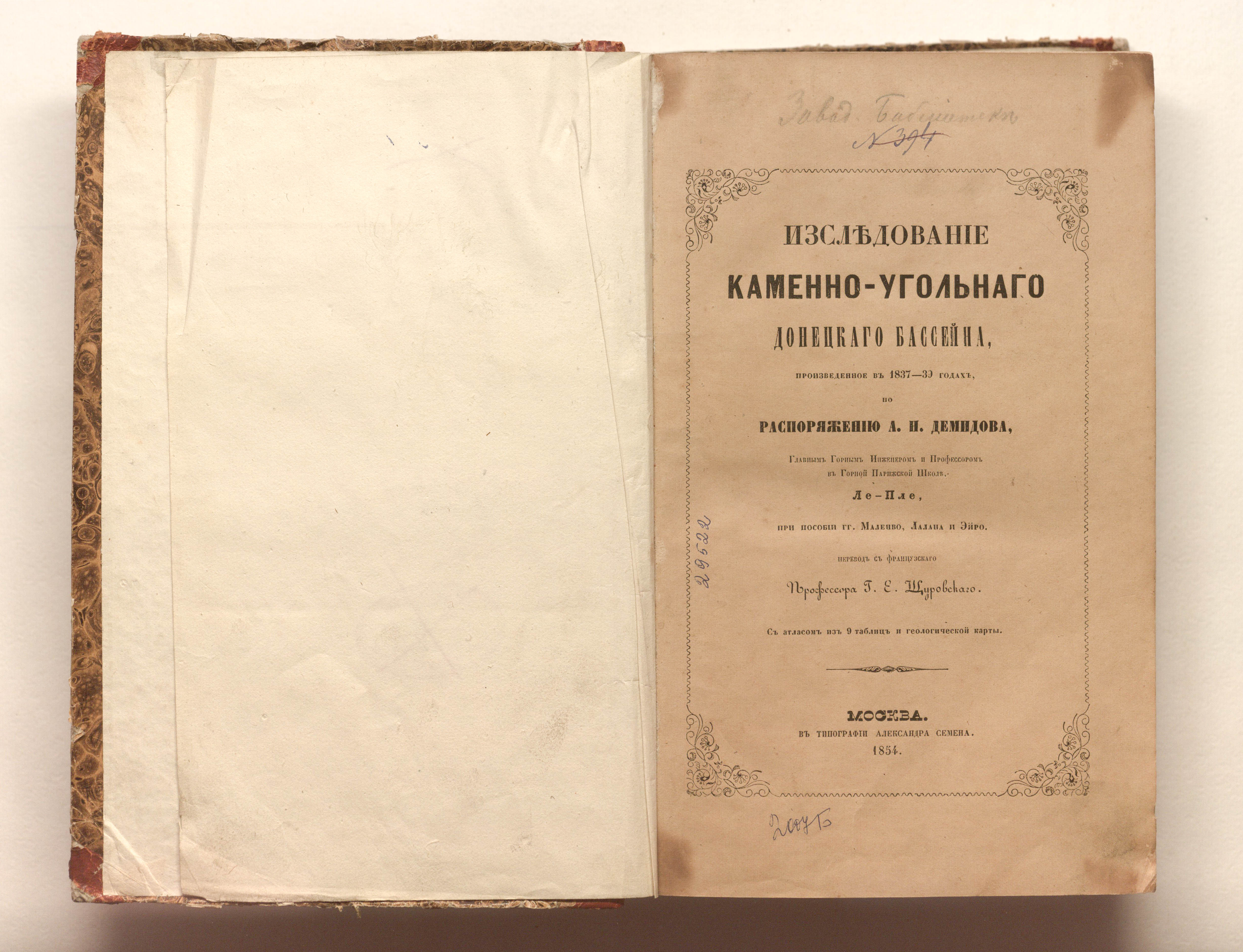 Ле-Пле, Фредерик (1806-1882). Исследование каменноугольного Донецкого бассейна, произведенное в 1837-39 годах, по распоряжению А.Н. Демидова, главным горным инженером и профессором в Горной парижской школе, Ле-Пле при пособии г. г. Маленво, Лалано и Эйро : с атласом из 9 табл. и геол. карт / Ф. Ле-Пле ; пер. с франц., авт. предисл. профессор Г. Е. Щуровский . — Москва : тип. Александра Семена, 1854. — разд. паг. ; 26х17,5 см.