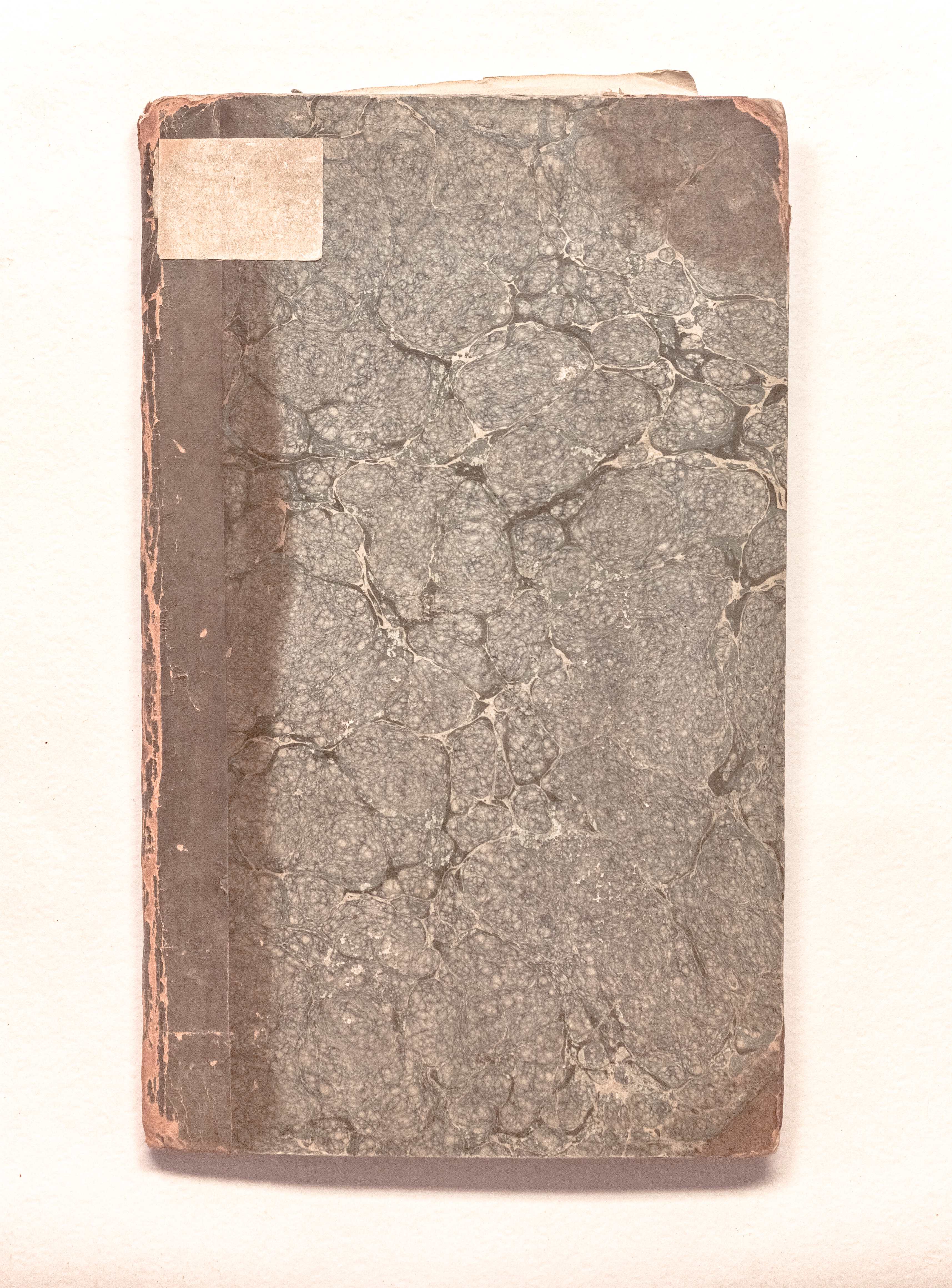 Книга в полукожаном владельческом переплете. Крышки переплета обтянуты бумагой с рисунком «под мрамор». Бумага верже. Водяные знаки.