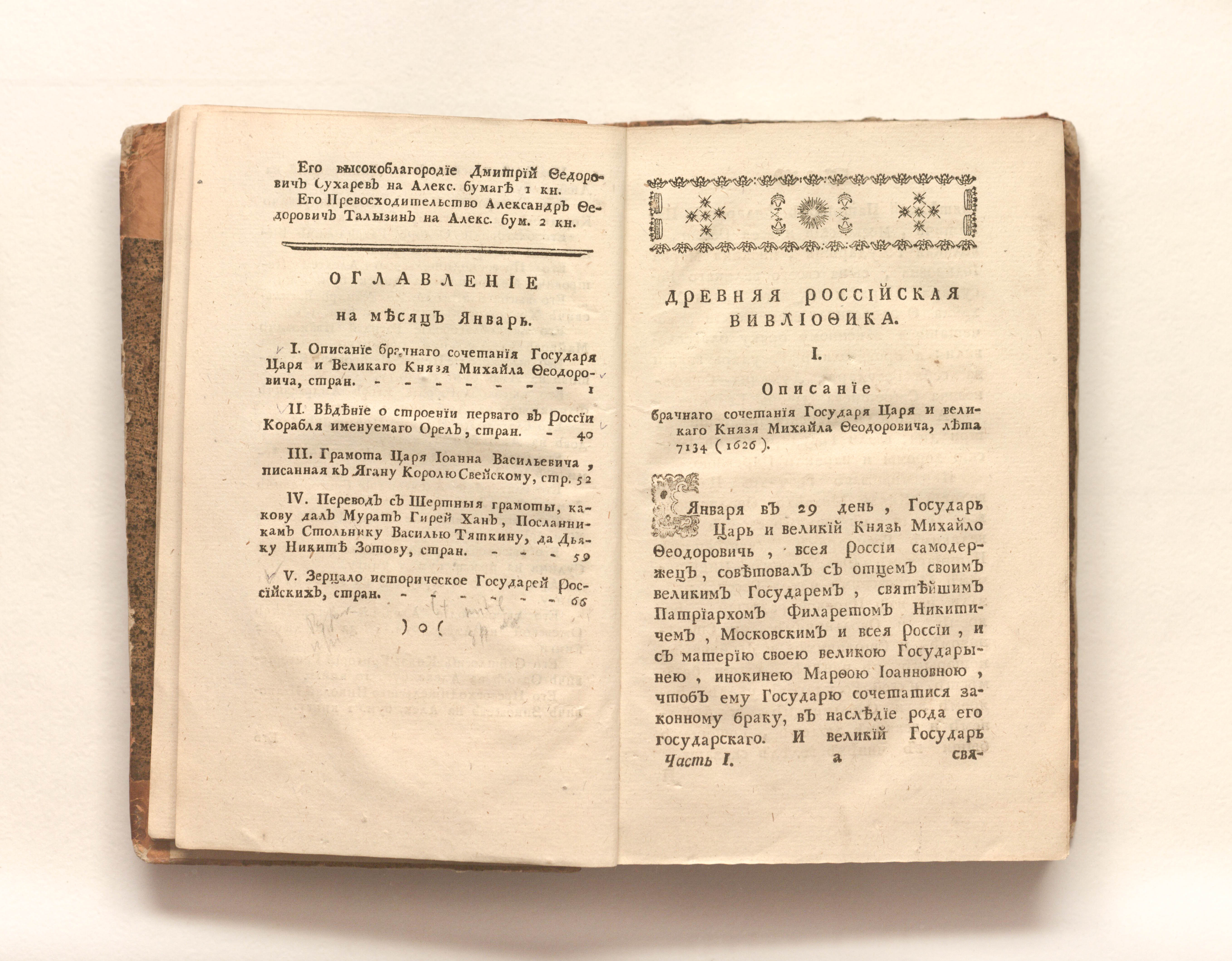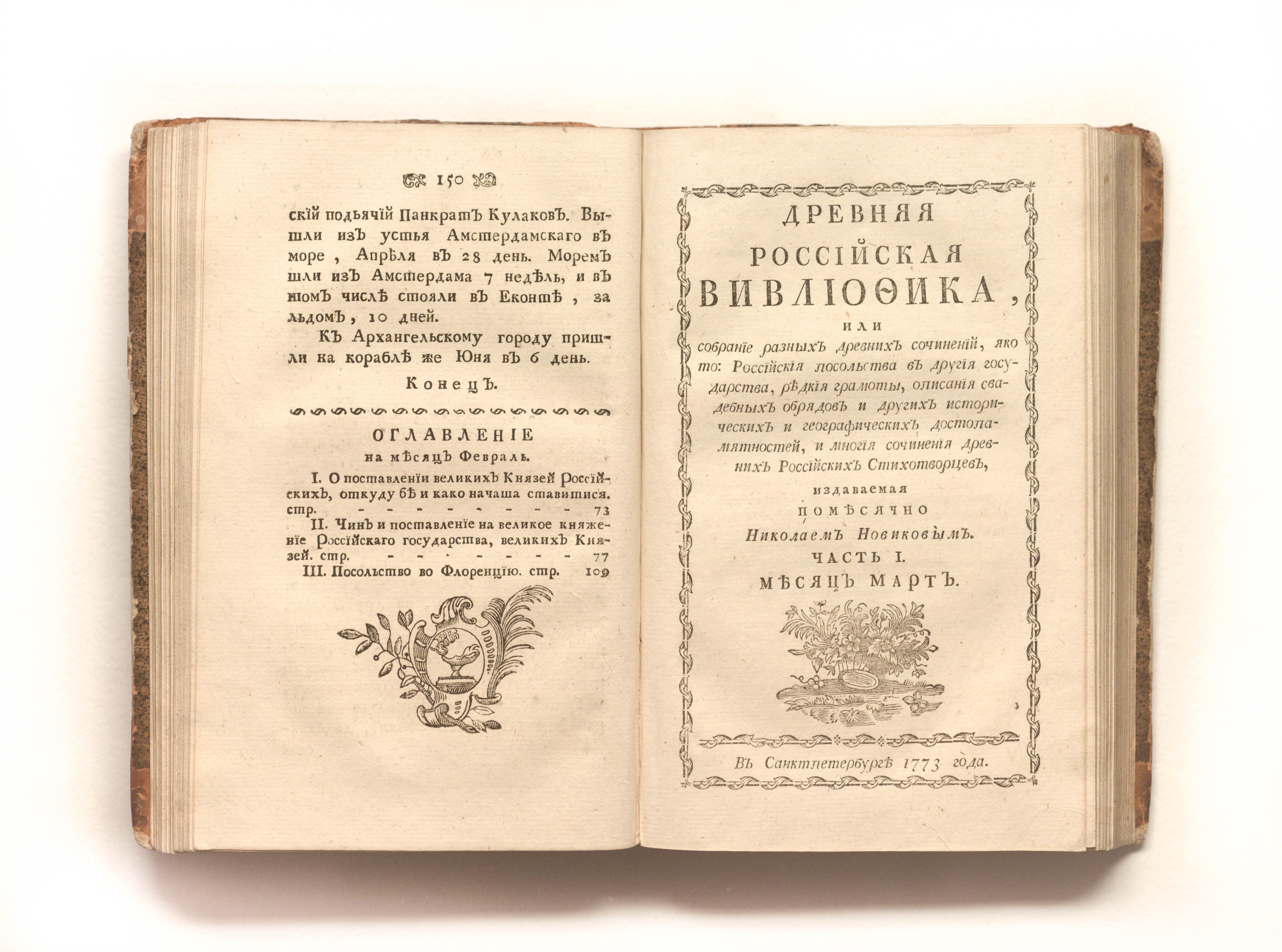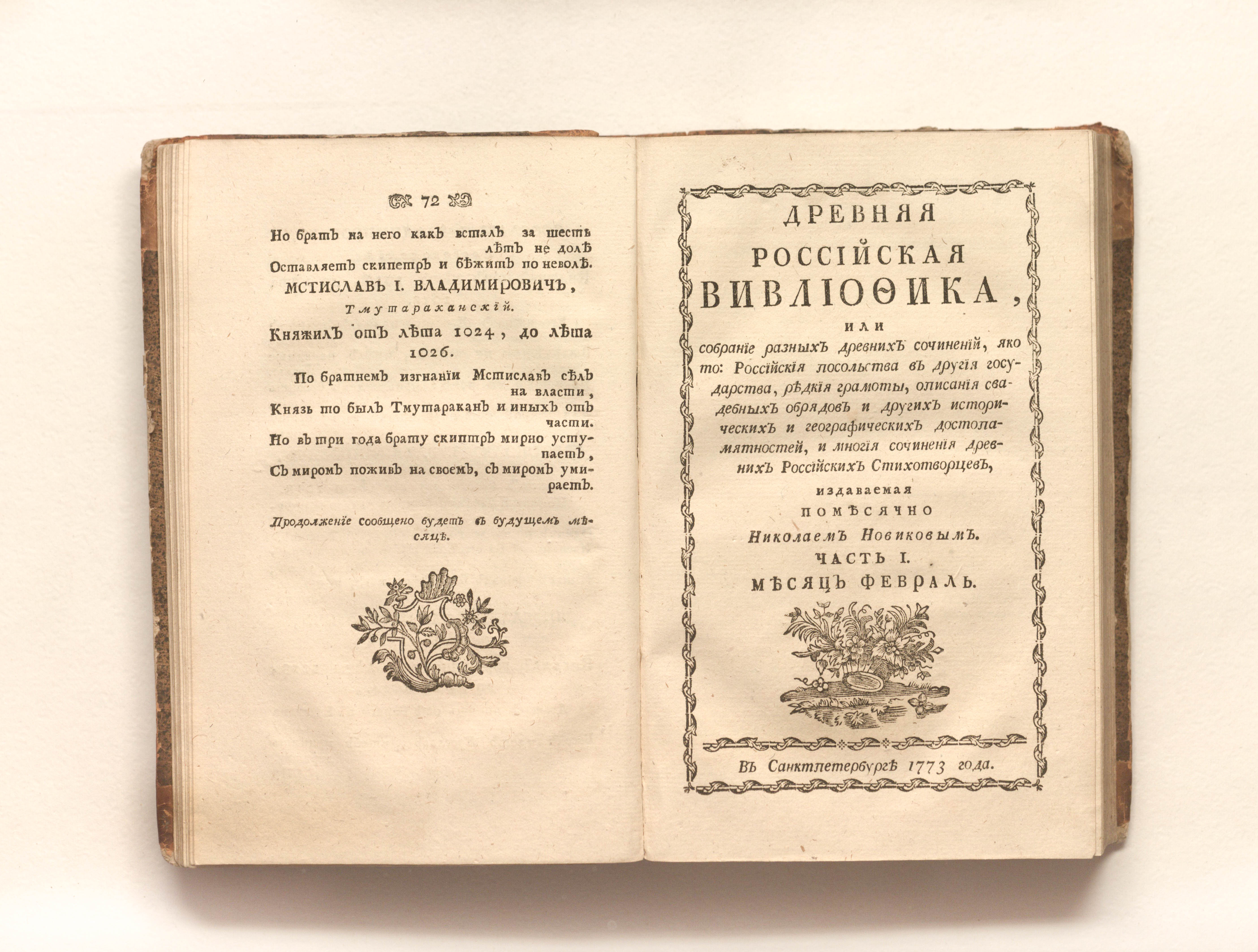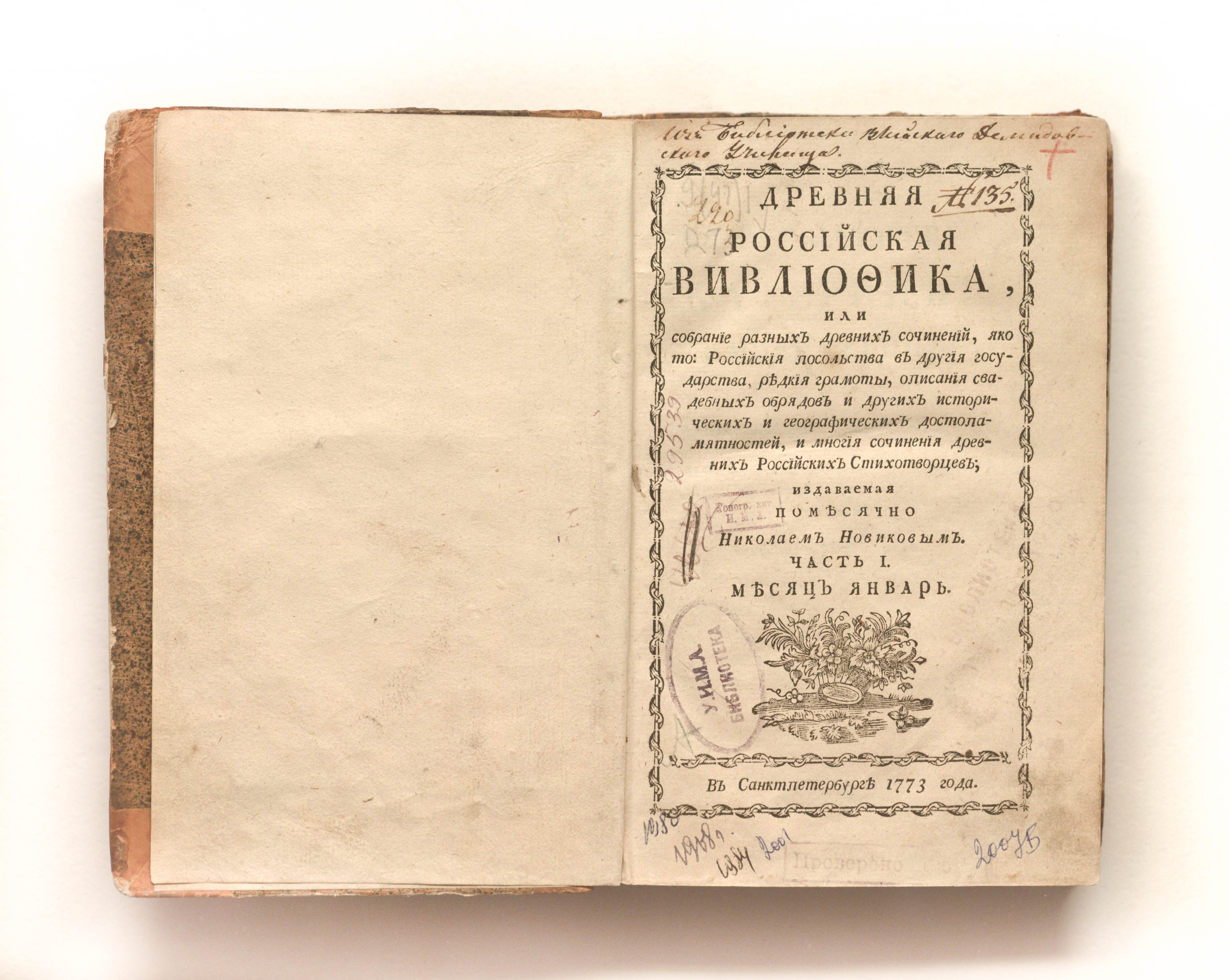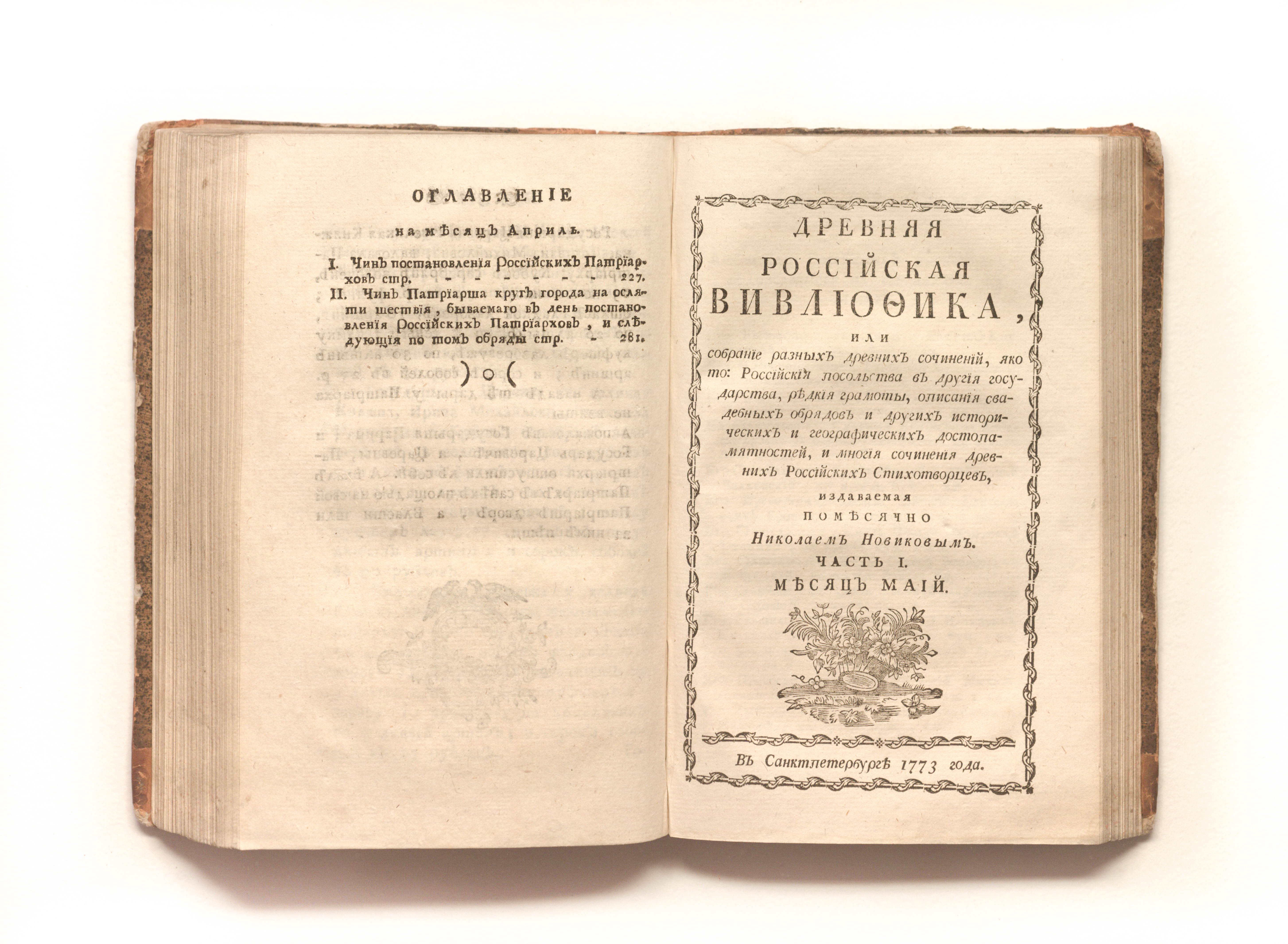 Древняя российская вивлиофика, или Собрание разных древних сочинений, яко то: российския посольства в другия государства, редкия грамоты, описания свадебных обрядов и других исторических и географических достопамятностей, и многия сочинения древних российских стихотворцев / издаваемая помесячно Николаем Новиковым. — Ч. 1. — Январь-июнь. — Санкт-Петербург, 1773. — [10], 475, [3] с. ; 20х13 см.